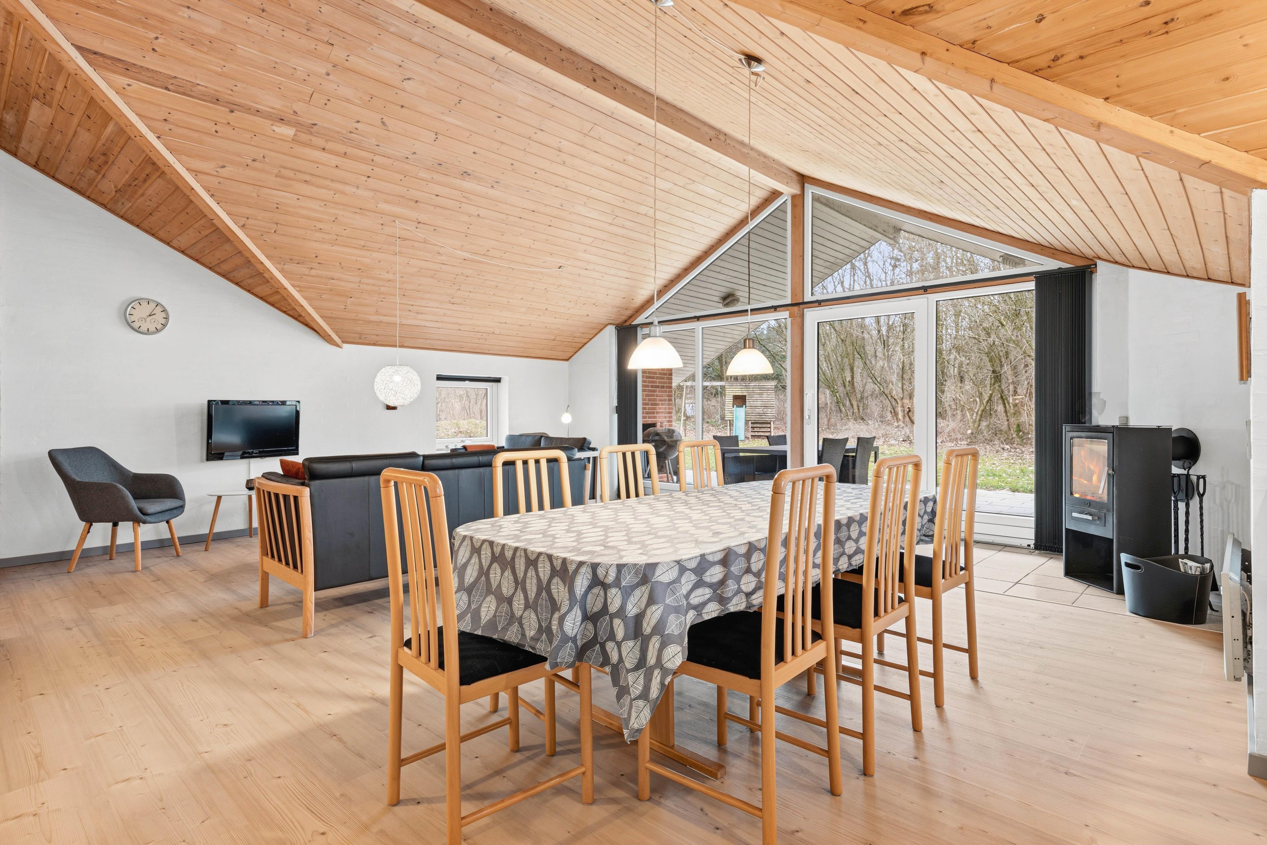 Godt udstyret sommerhus med stor stue med stuebord, der inviterer til sociale spil. Legehuset er i skygge hele dagen, så børnene også kan gynge i middagssolen.