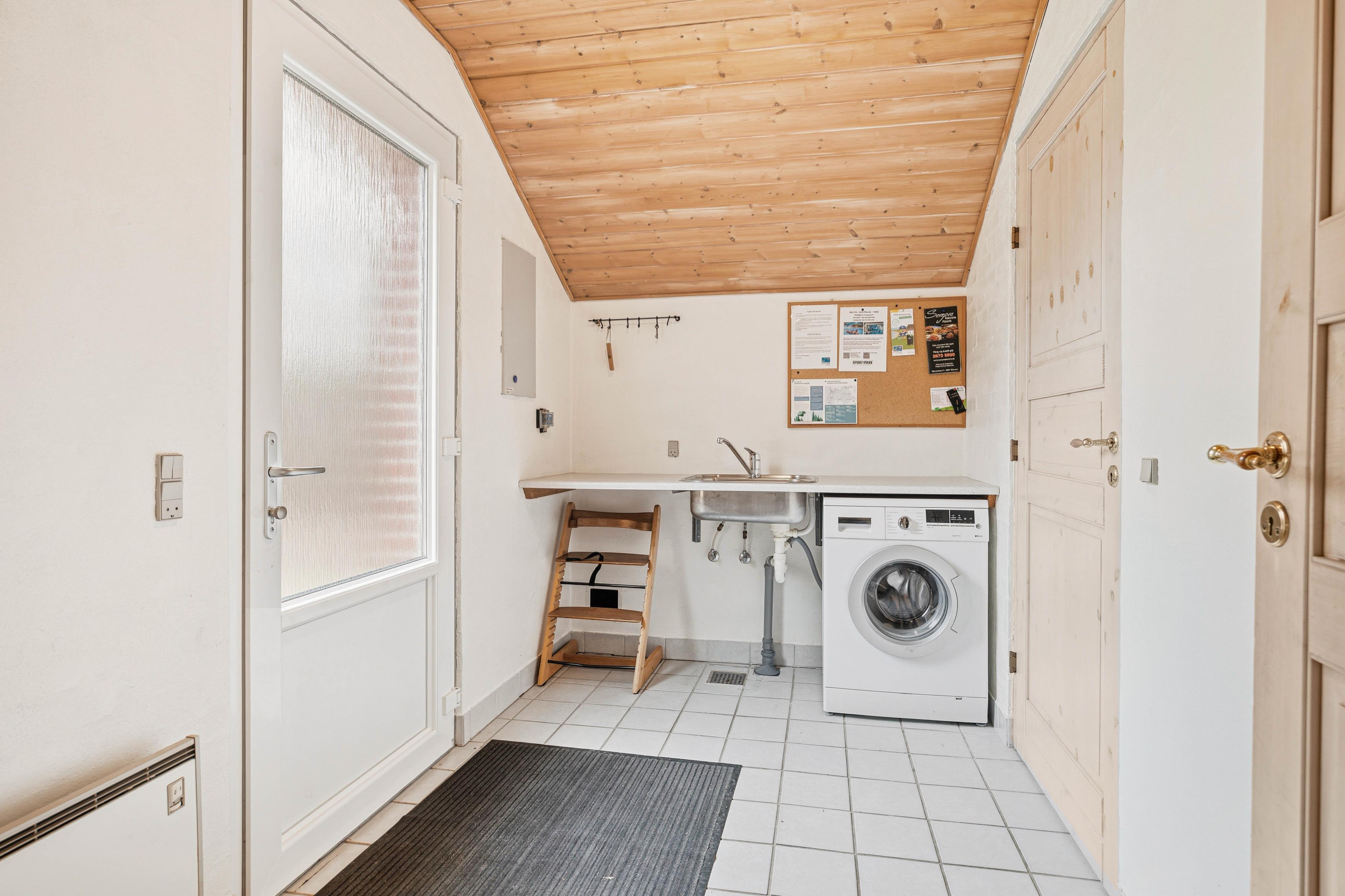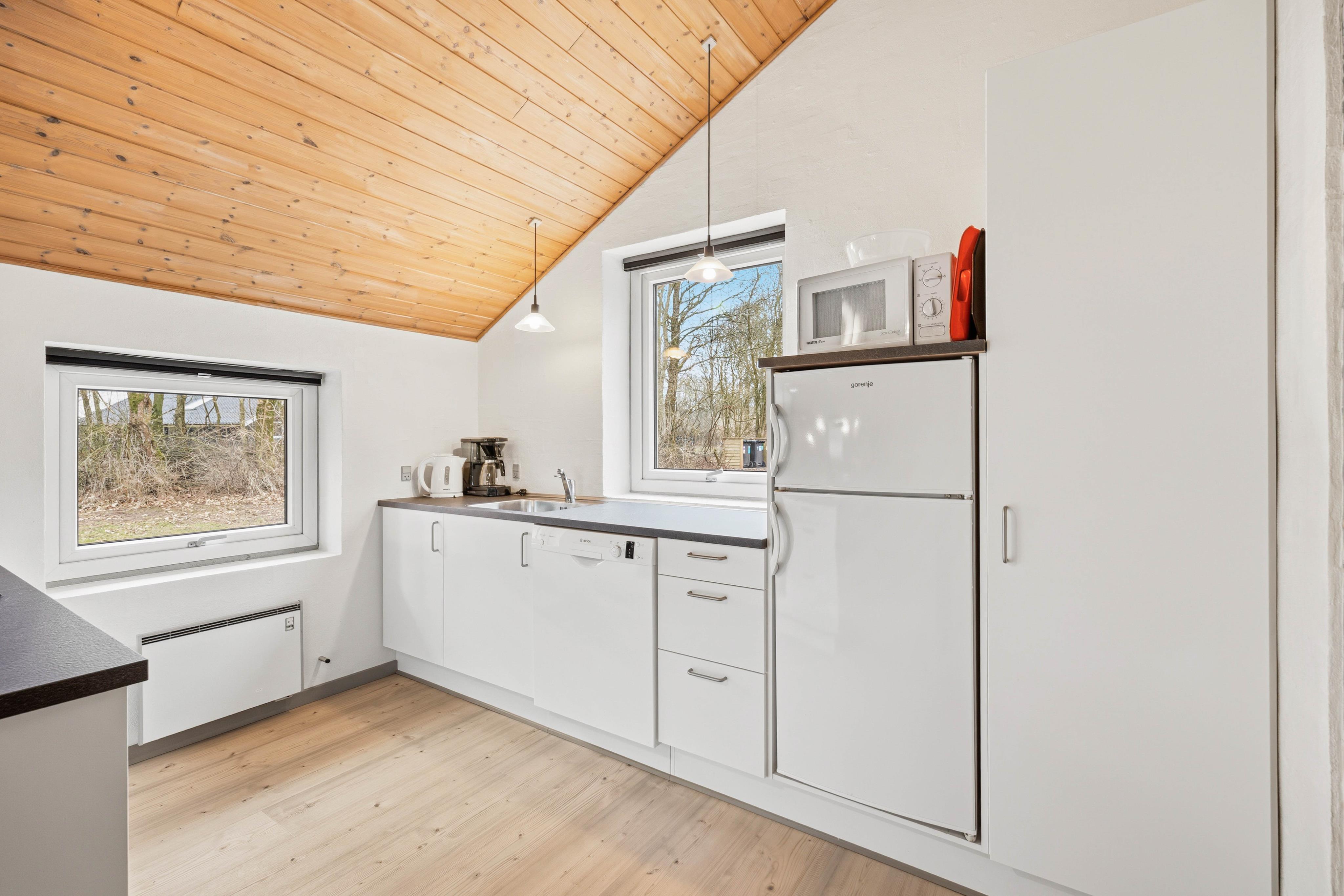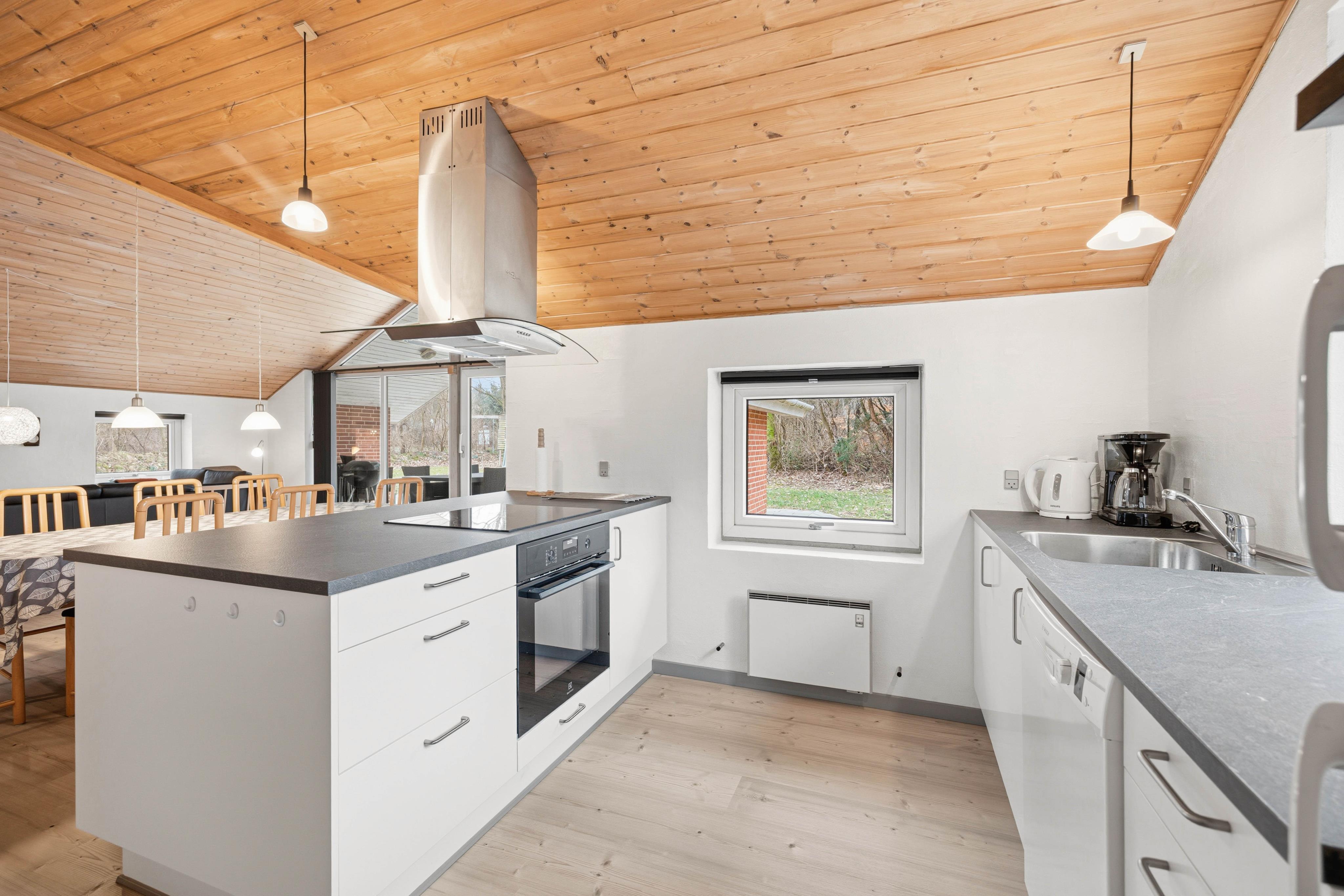 De store vinduer og lyse vægge lader dagslyset strømme ind og giver en fin udsigt over den grønne plænegrund, som omringer huset. Om aftenen kan I nyde brændeovnens varme atmosfære og lade de praktiske opgaver blive ordnet af opvaskemaskinen og vaskemaskinen.