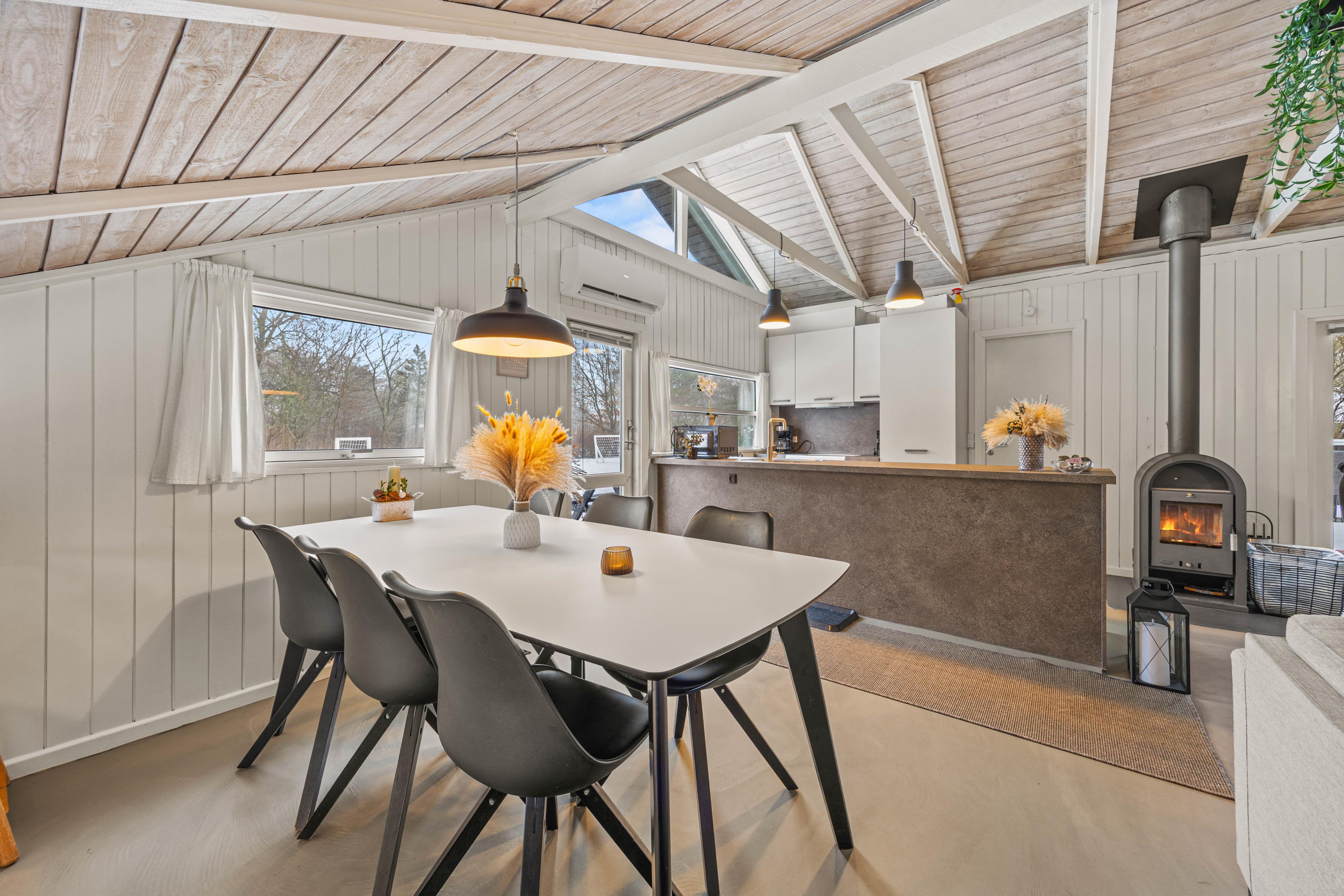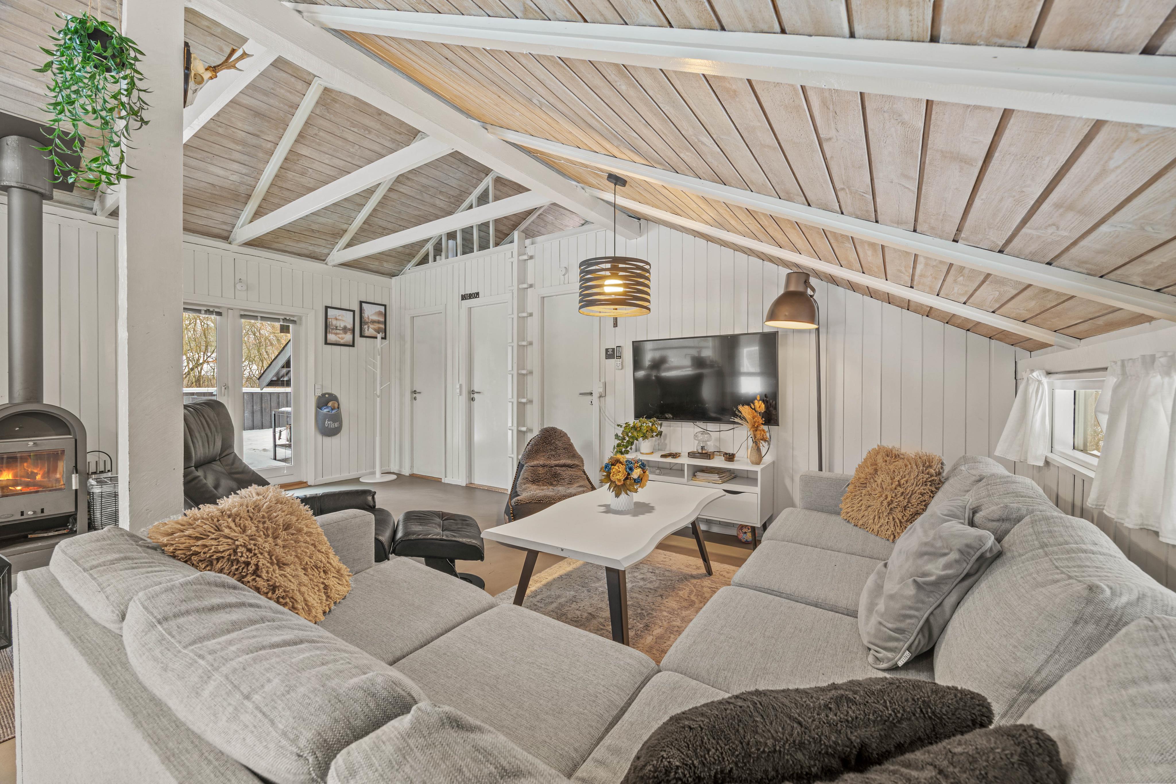 I stue-delen er der en stor sofa med plads til hele familien. Her kan I samles om et spil ved sofabordet, læse den medbragte ferielæsning eller se en film sammen på stuens TV, hvor det er muligt at streame. I sommerhuset finder E også en PlayStation 4, så der er mulighed for underholdning på de regnfulde dage. Skal feriehuset varmes op eller elsker I bare lyden af knitrende ild, kan I tænde op i brændeovnen.