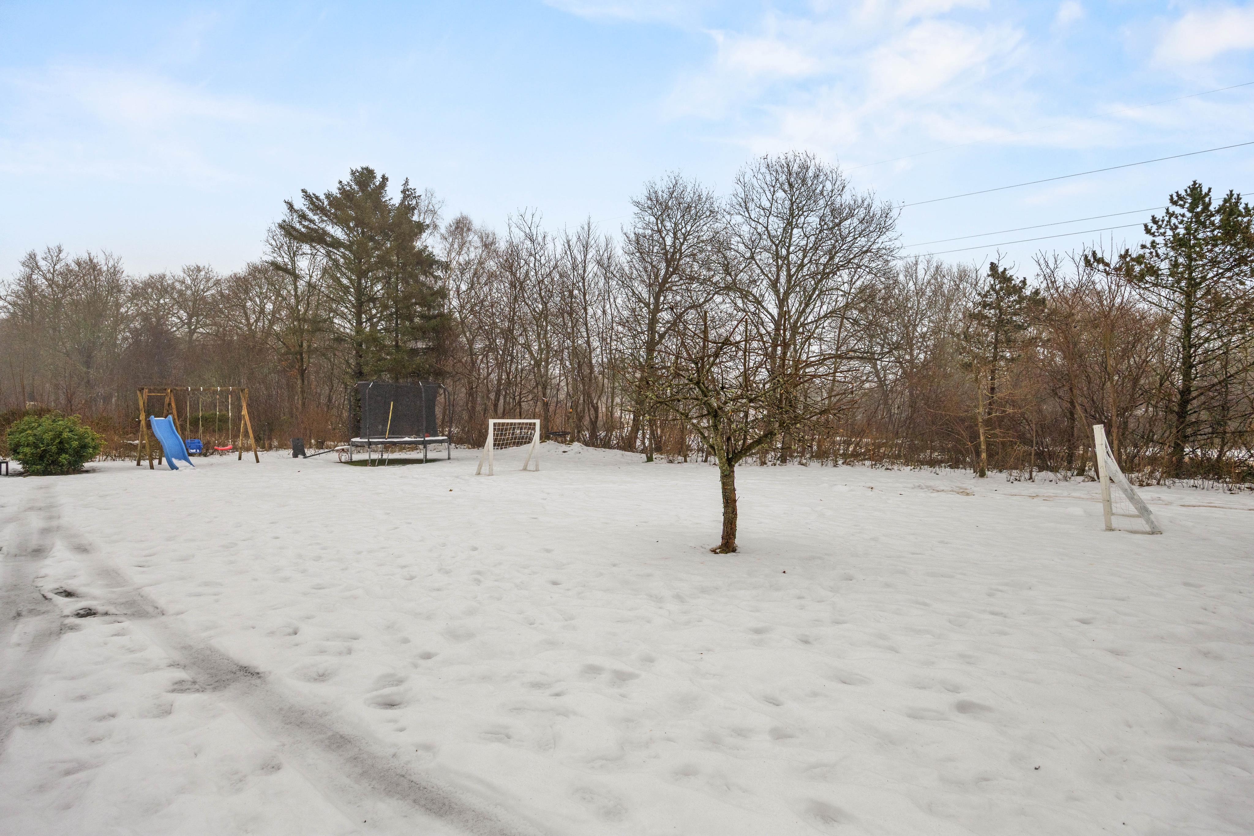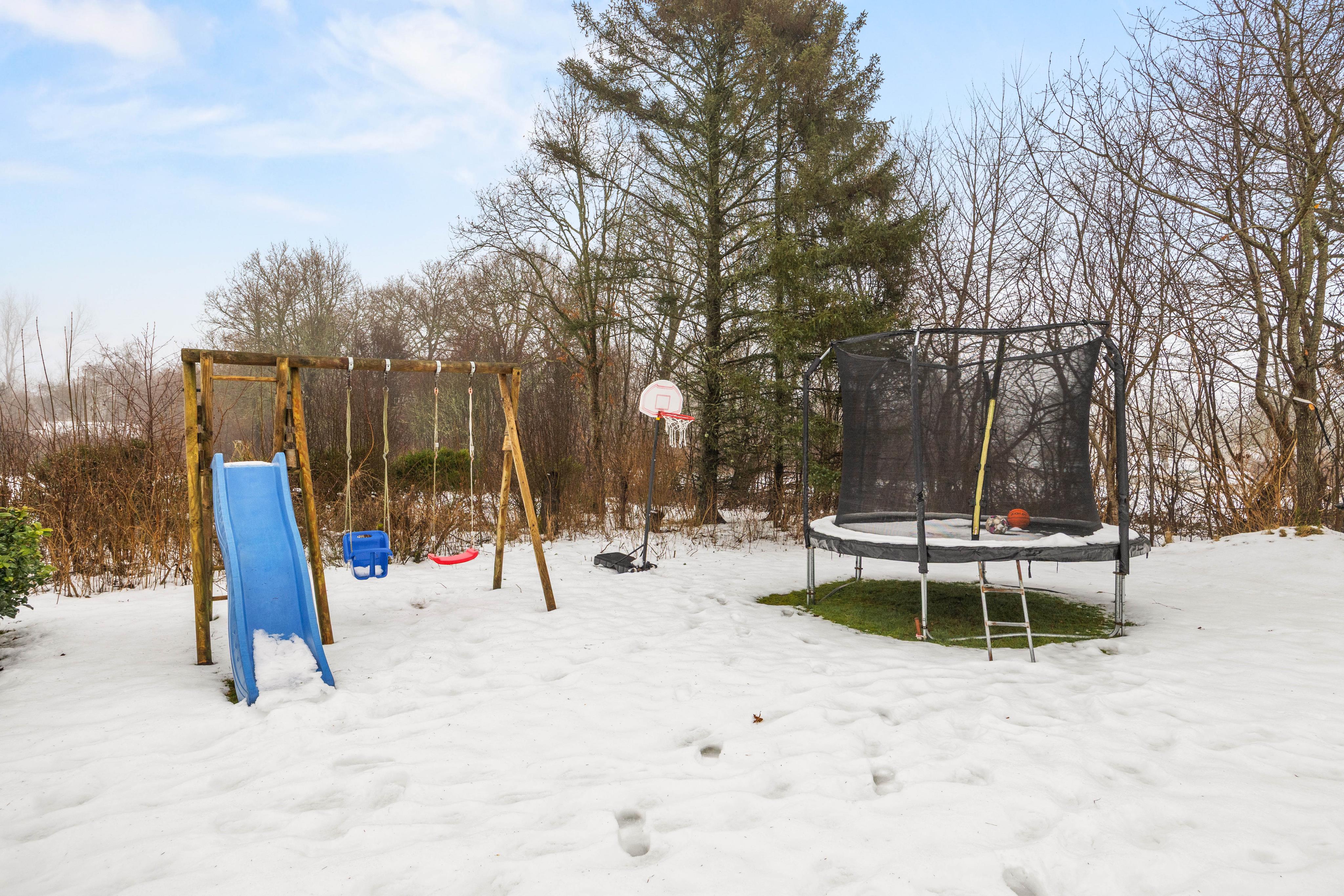 Mange timer venter jer ude. På terrassen kan I slå jer ned i havemøblerne eller på liggestolene, og hvis I trænger til en pause fra solen, så kan I slå parasollen op. Haven har en stor græsplæne med masser af sjove ting: trampolin, gynge, rutsjebane og en basketkurv. Her kan børnene lege løs og få brændt en masse krudt af. Når himlen bliver rød og solen er på vej ned, kan I tænde op i grillen og lave jeres aftensmad her. Mens maden simrer, er det oplagt at tænde bålet til vildmarksbadet, så I kan hoppe i den under den åbne stjernehimmel efter aftensmaden.