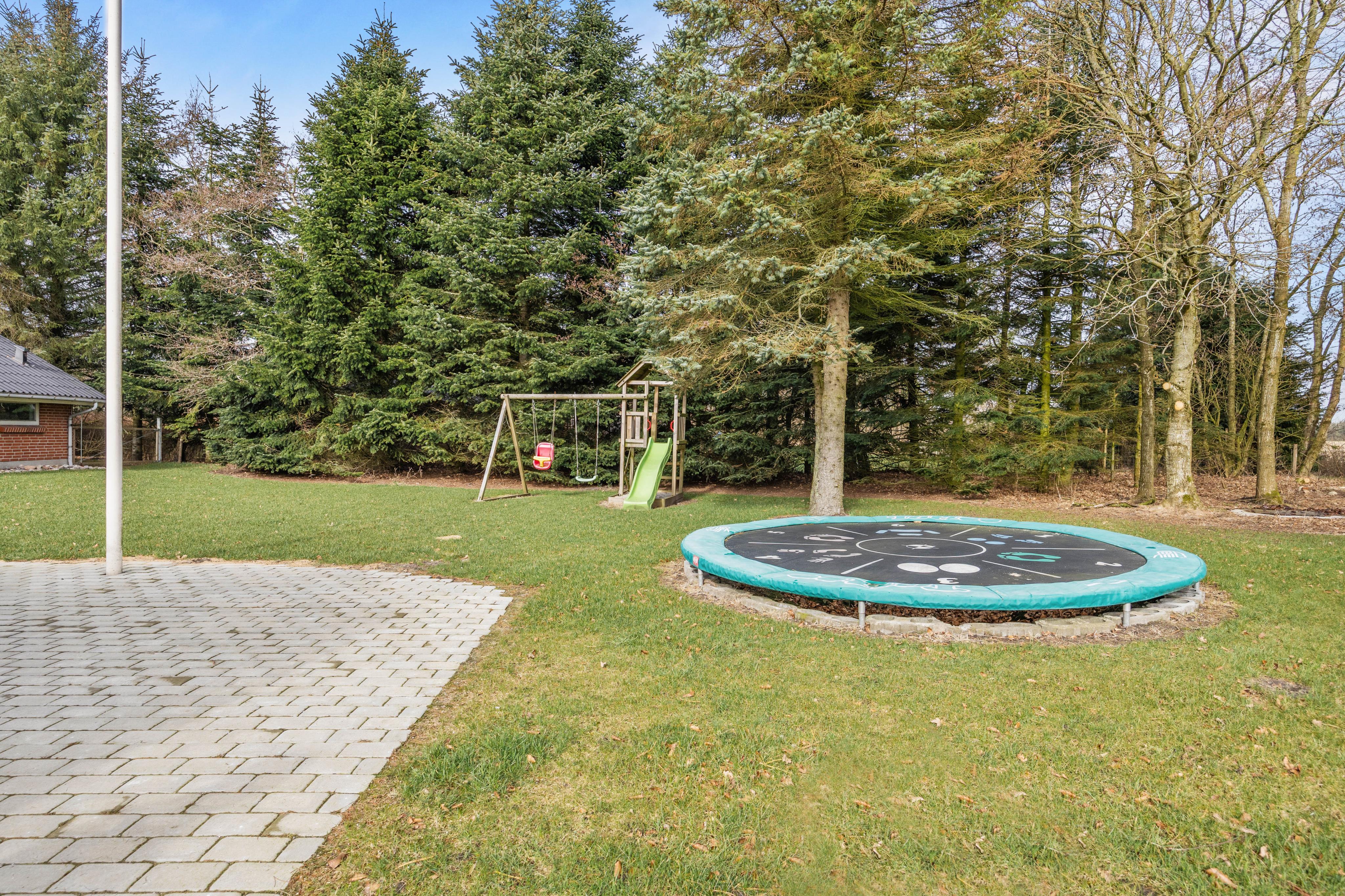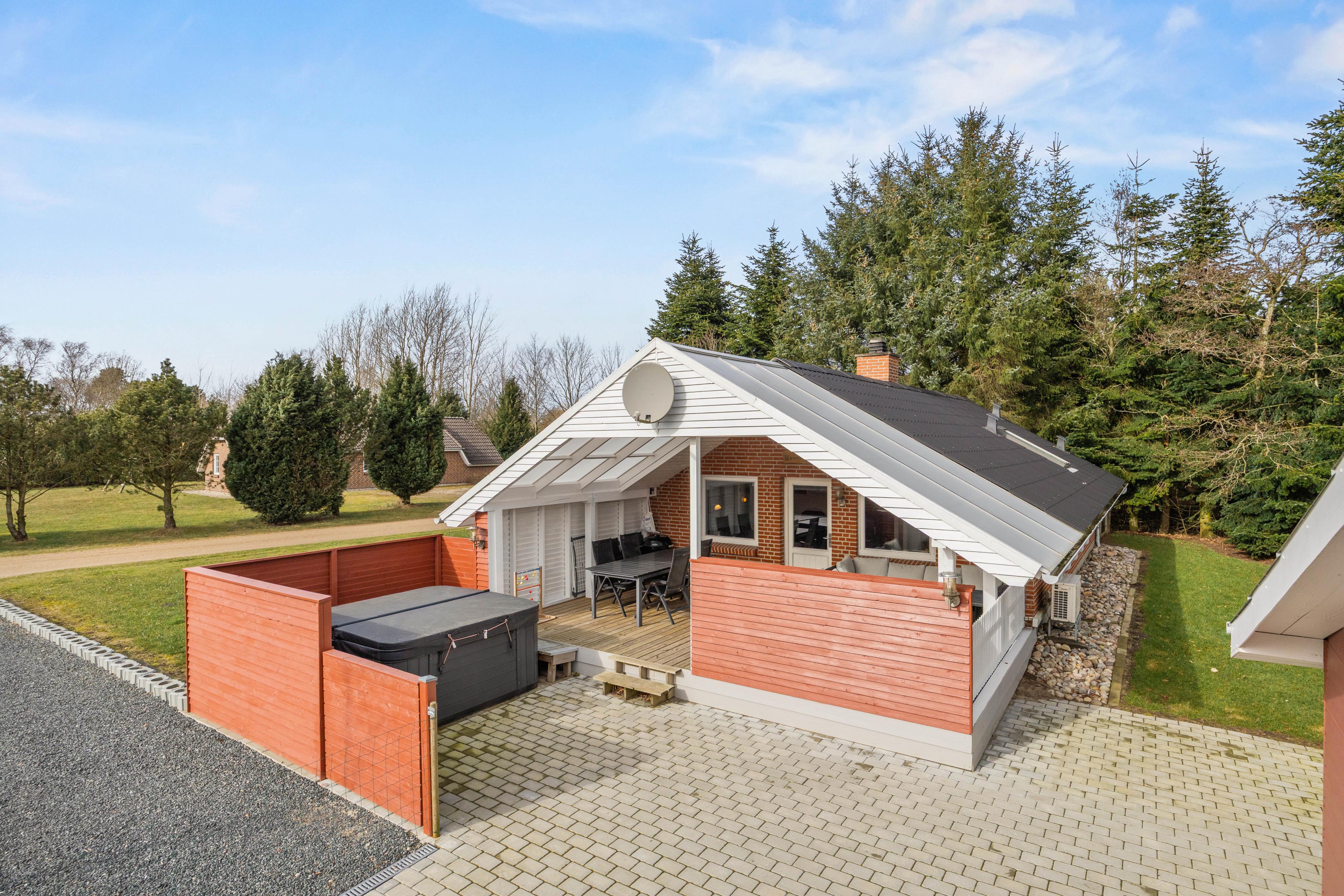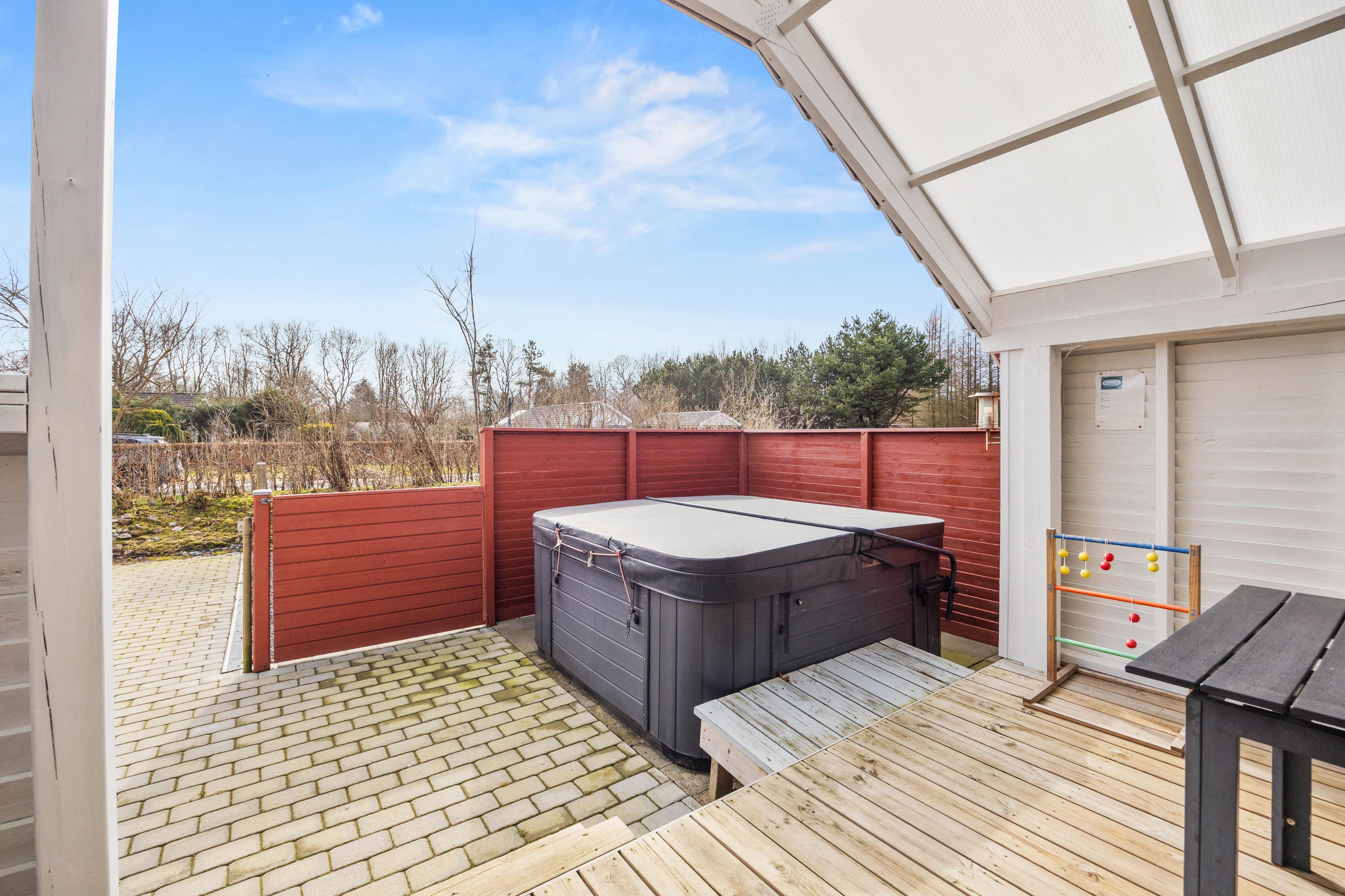 Udearealet giver dig masser af plads til at nyde ferien i det fri på den store 1622 m2 plænegrund, hvor både leg og afslapning kan fylde dagen. Du kan vælge mellem flere skønne terrassemiljøer, da sommerhuset både har en åben, afskærmet, lukket og overdækket terrassedel, så du altid kan finde læ, sol eller skygge alt efter vejr og humør. Den indhegnede grund gør det ekstra trygt, hvis du har børn eller hund med, og der er rig mulighed for at aktivere familiens mindste med sandkasse og gynge. Trampolinen indbyder til timevis af sjov og bevægelse, mens du selv kan sænke tempoet og forkæle dig med en tur i udespaen, der har plads til 6 personer og er oplagt til afslapning både dag og aften.