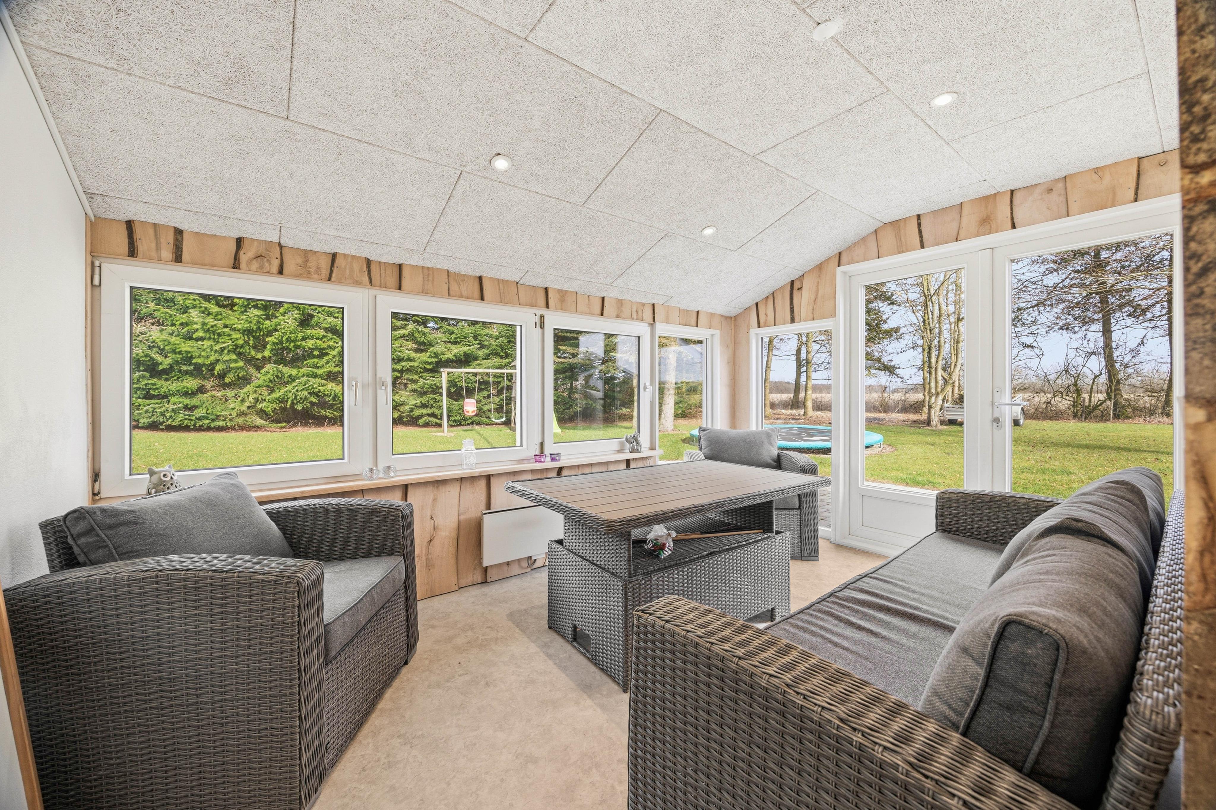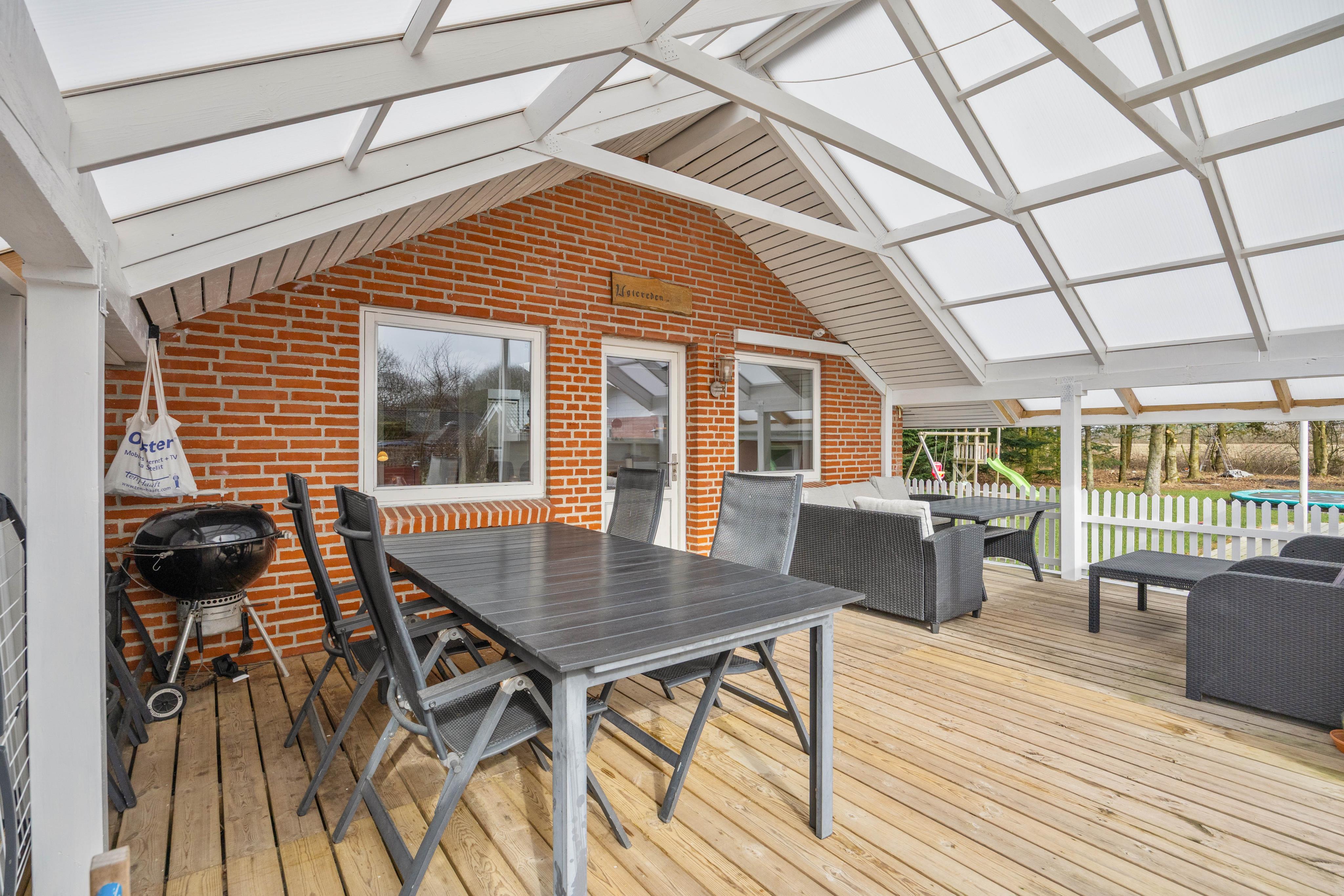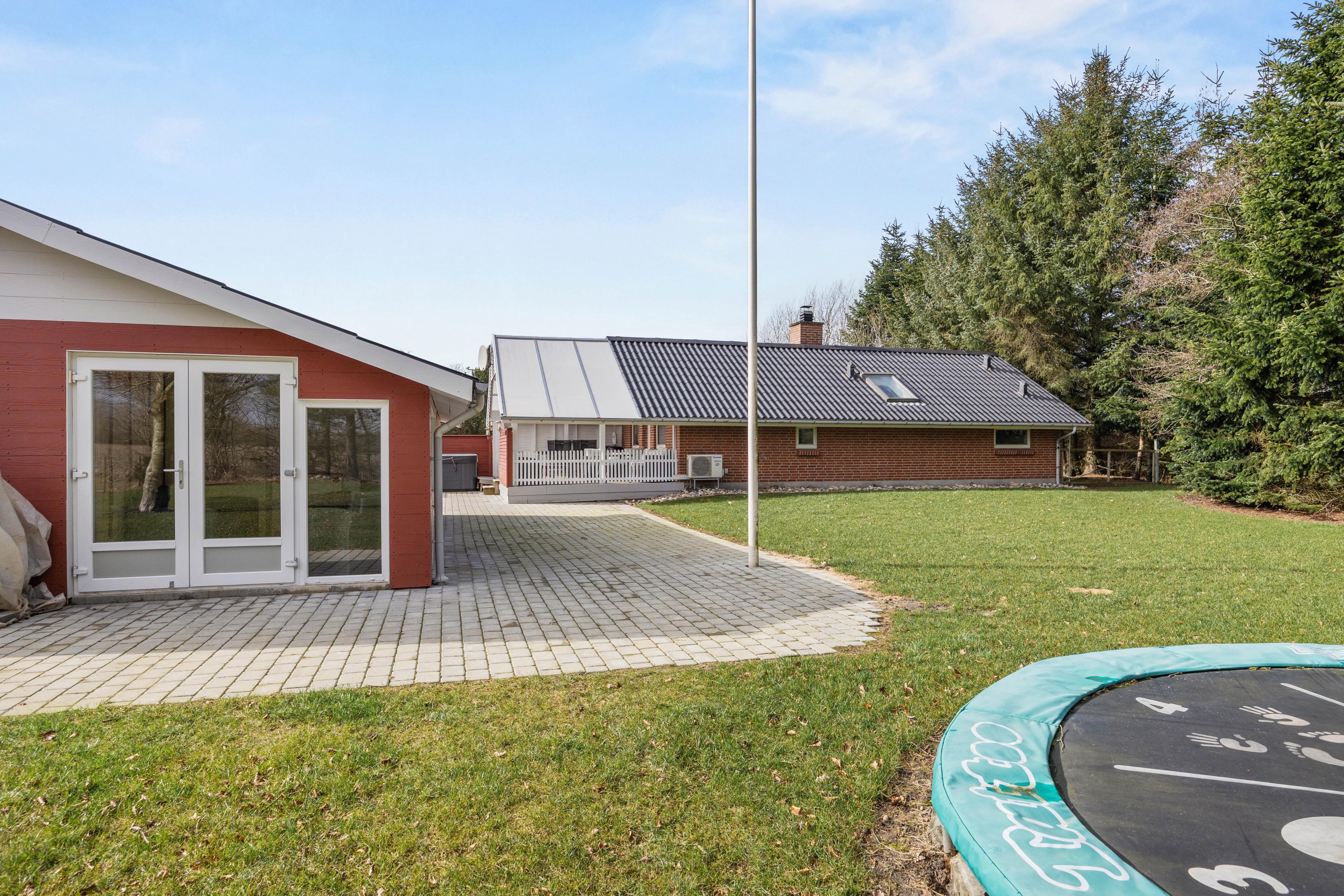 Udearealet giver dig masser af plads til at nyde ferien i det fri på den store 1622 m2 plænegrund, hvor både leg og afslapning kan fylde dagen. Du kan vælge mellem flere skønne terrassemiljøer, da sommerhuset både har en åben, afskærmet, lukket og overdækket terrassedel, så du altid kan finde læ, sol eller skygge alt efter vejr og humør. Den indhegnede grund gør det ekstra trygt, hvis du har børn eller hund med, og der er rig mulighed for at aktivere familiens mindste med sandkasse og gynge. Trampolinen indbyder til timevis af sjov og bevægelse, mens du selv kan sænke tempoet og forkæle dig med en tur i udespaen, der har plads til 6 personer og er oplagt til afslapning både dag og aften.