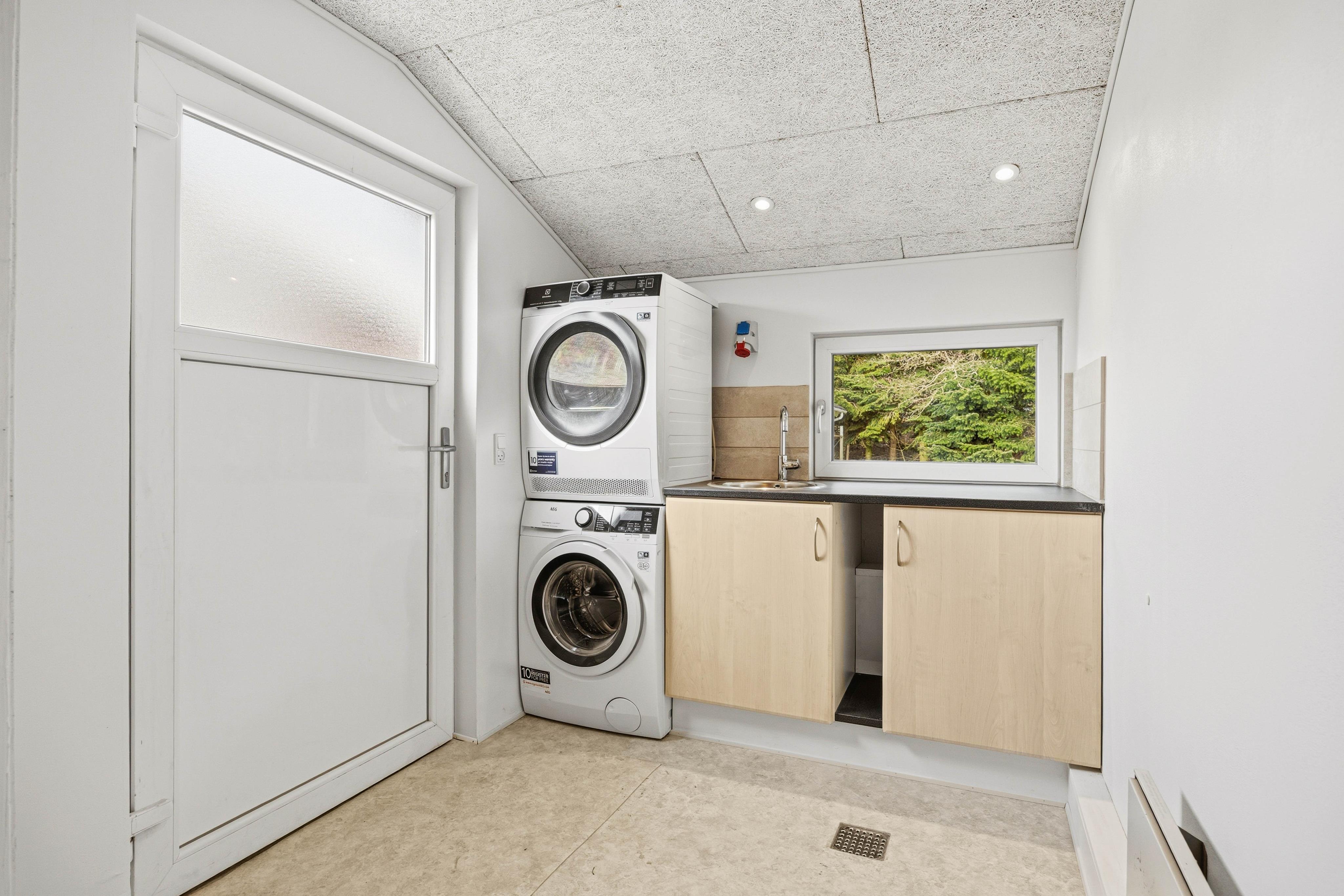 Køkkenet er godt udstyret med opvaskemaskine, så oprydningen klares på et øjeblik, og der er tid til lange middage, brætspil eller en ekstra kop kaffe i godt selskab. Med både vaskemaskine og tørretumbler ved hånden bliver hverdagen på ferien let og ubesværet – uanset om det gælder strandhåndklæder eller overtøj efter en frisk gåtur.