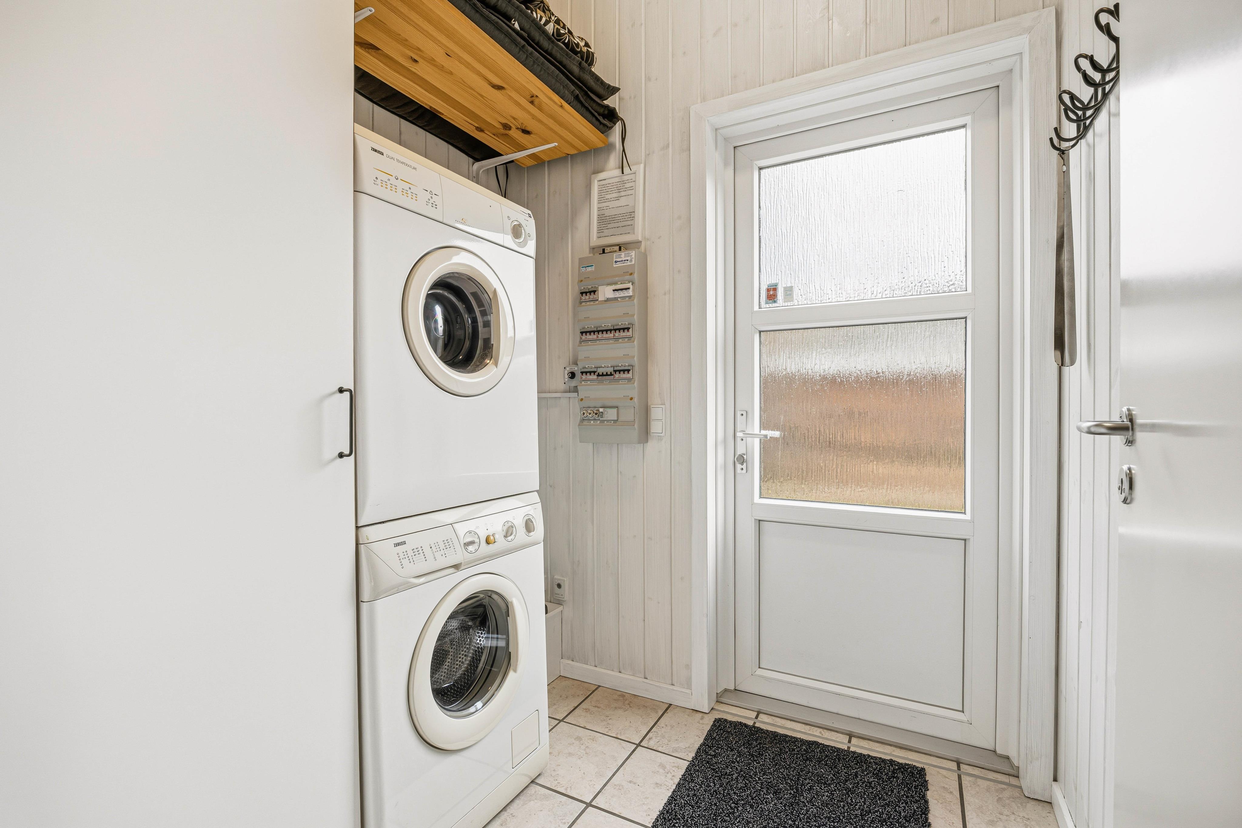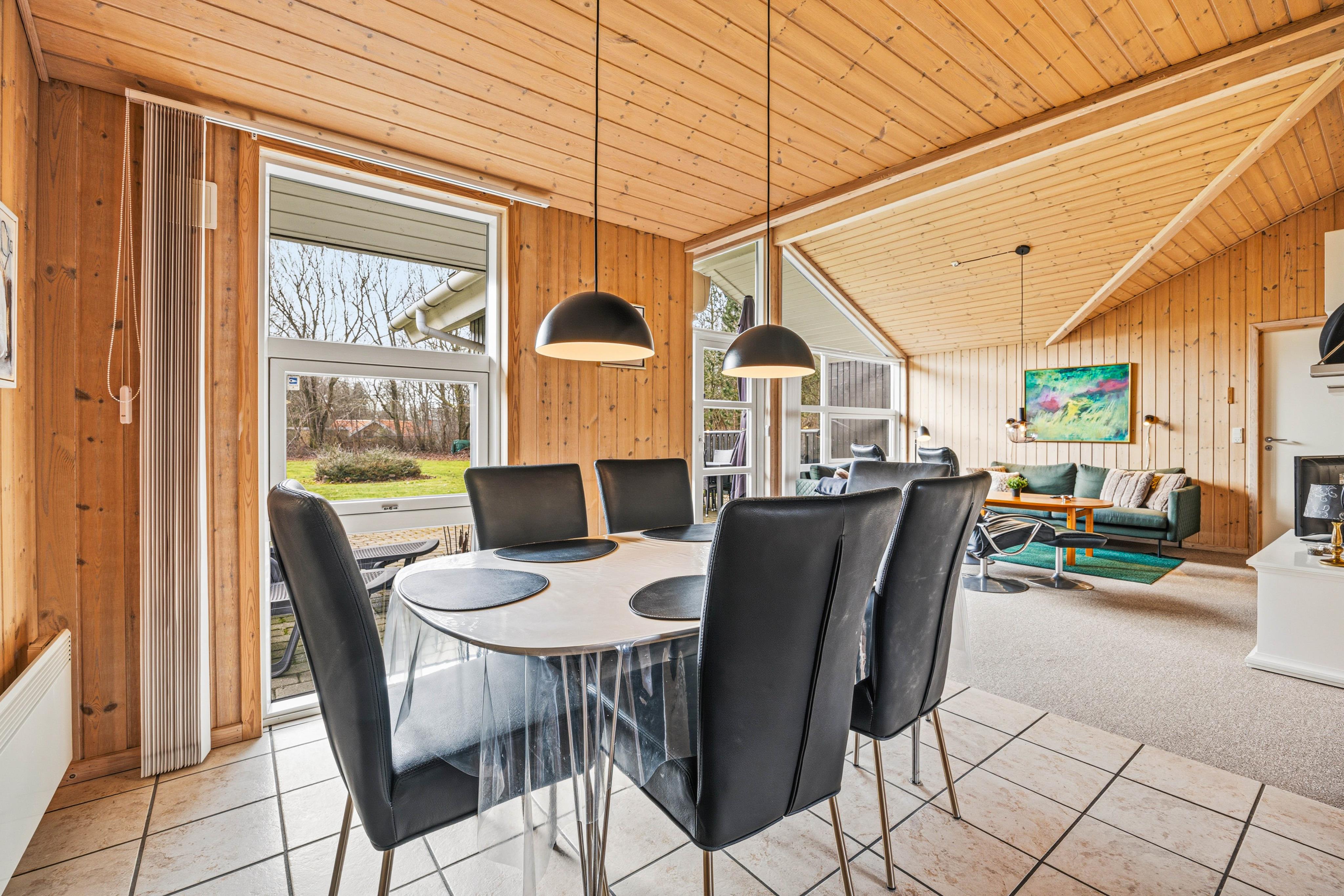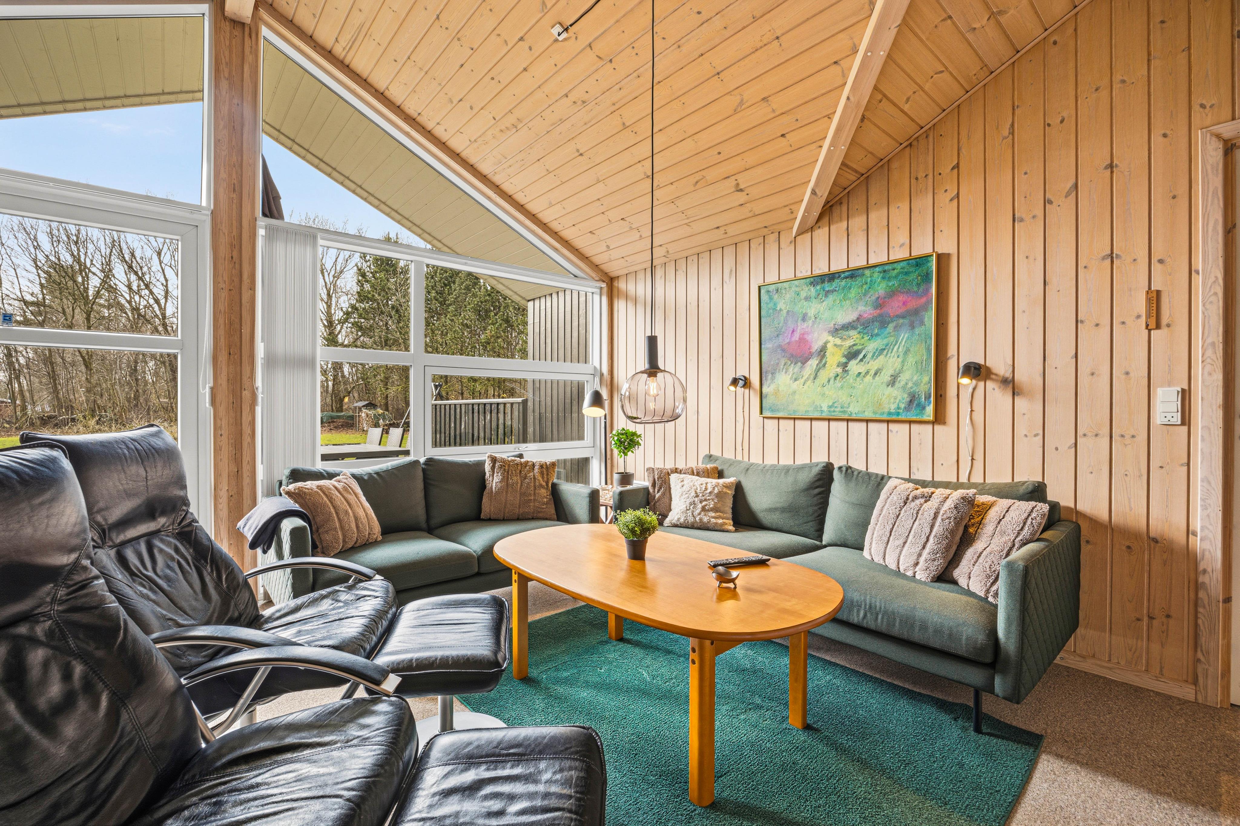 Køkkenet er praktisk indrettet med en opvaskemaskine, så I hurtigt kan tage jer af opvasken og komme videre med jeres eventyr langs Vestkysten. I stuen finder I komfortable møbler, der giver plads til alle, og en hyggelig brændeovn til at varme jer på kolde morgener. Sommerhuset er lyst med træpaneler på væggene og store vinduer, der inviterer masser af naturligt lys indenfor.