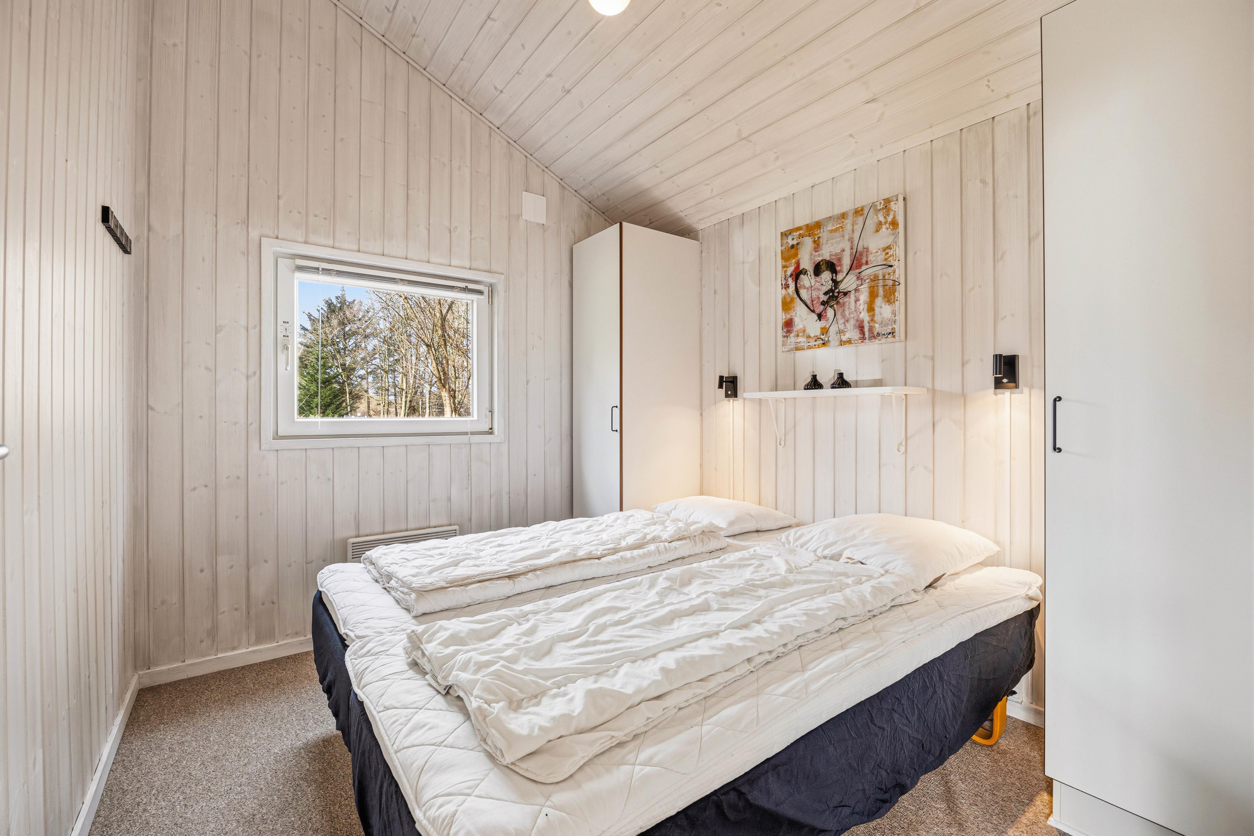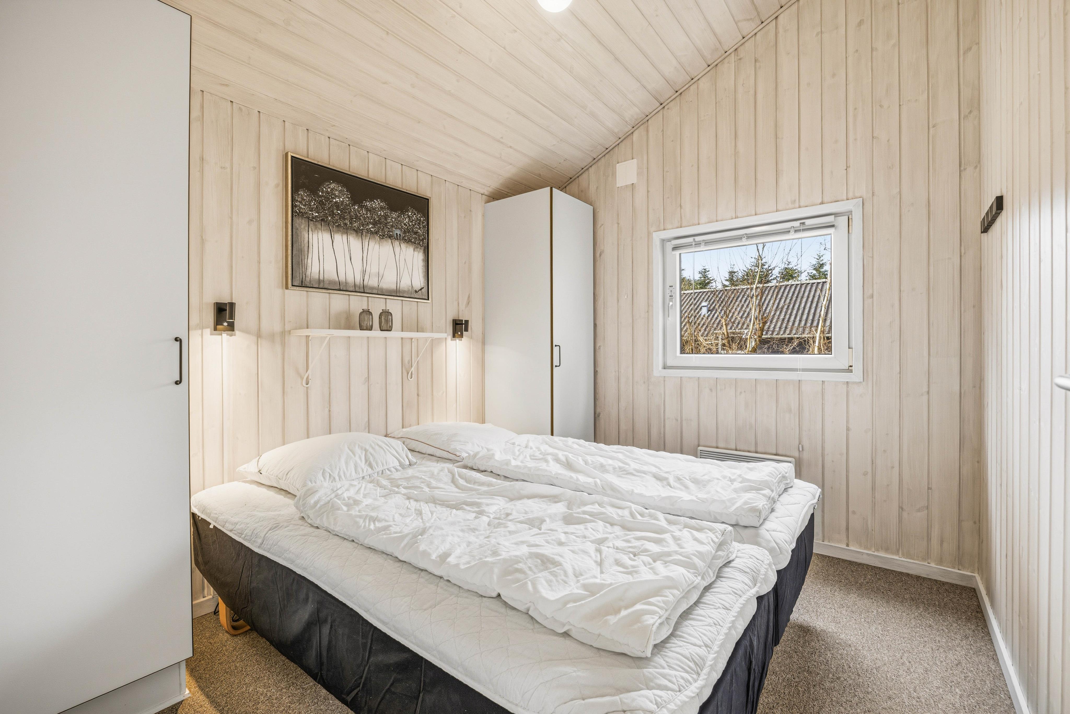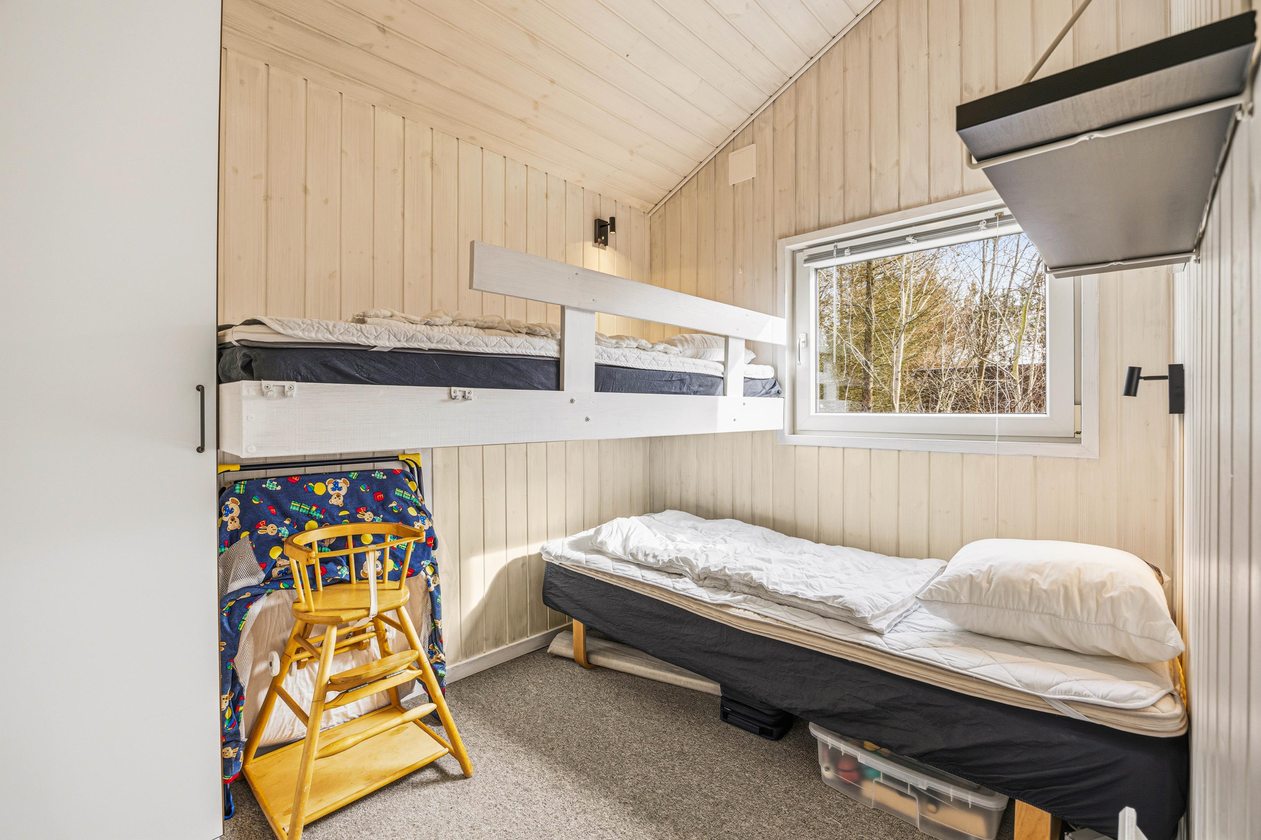 Der er 3 soveværelser i sommerhuset: 2 soveværelser med hver en dobbeltseng og det sidste soveværelse er med en køjeseng, hvilket gør det ideelt til både familier og vennegrupper. Sommerhuset byder også på et badeværelse og et gæstetoilet, begge med gulvvarme. Badeværelset er perfekt til afslapning, takket være saunaen og spaen, der har plads til 2 personer, hvor I kan slappe af efter en dag fyldt med aktiviteter. Desuden er der både vaskemaskine og tørretumbler, så I nemt kan holde styr på jeres tøj under hele opholdet.