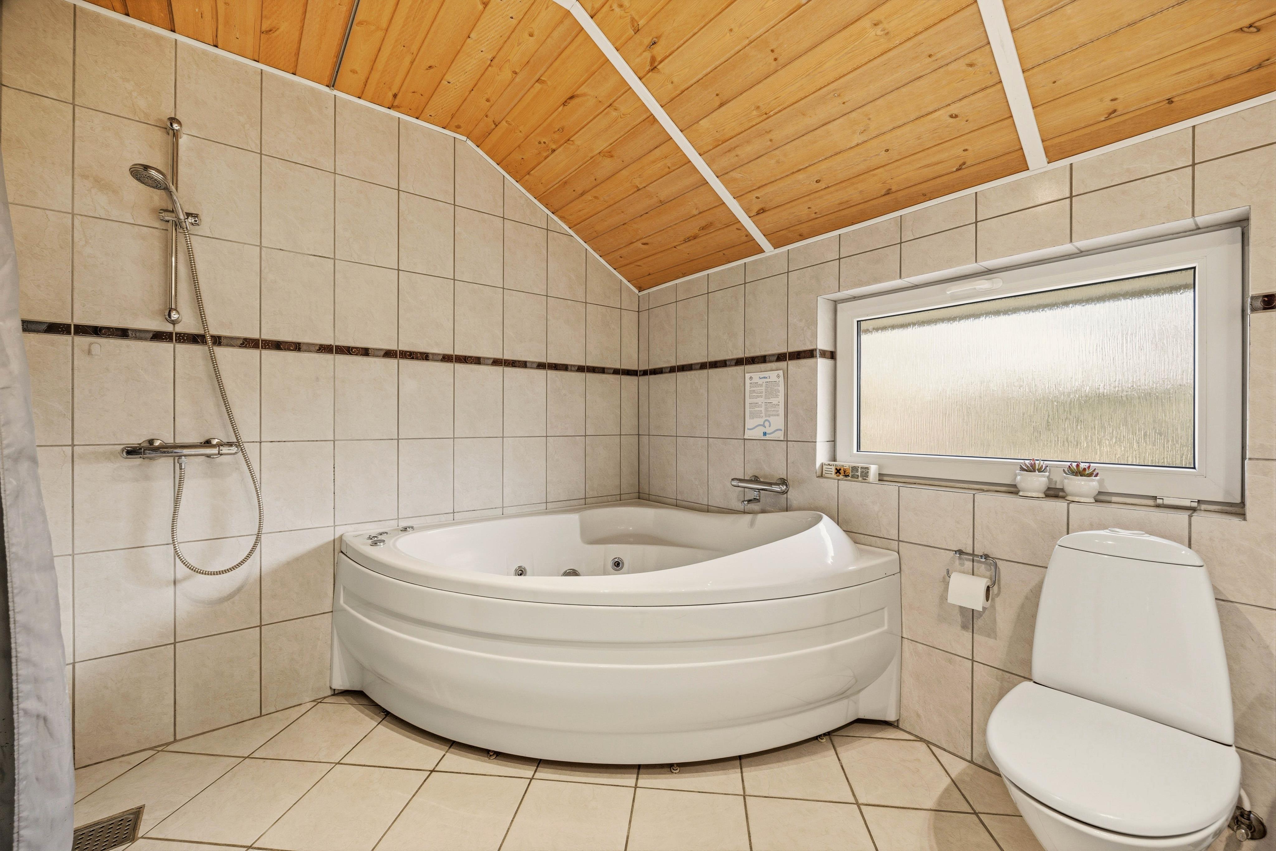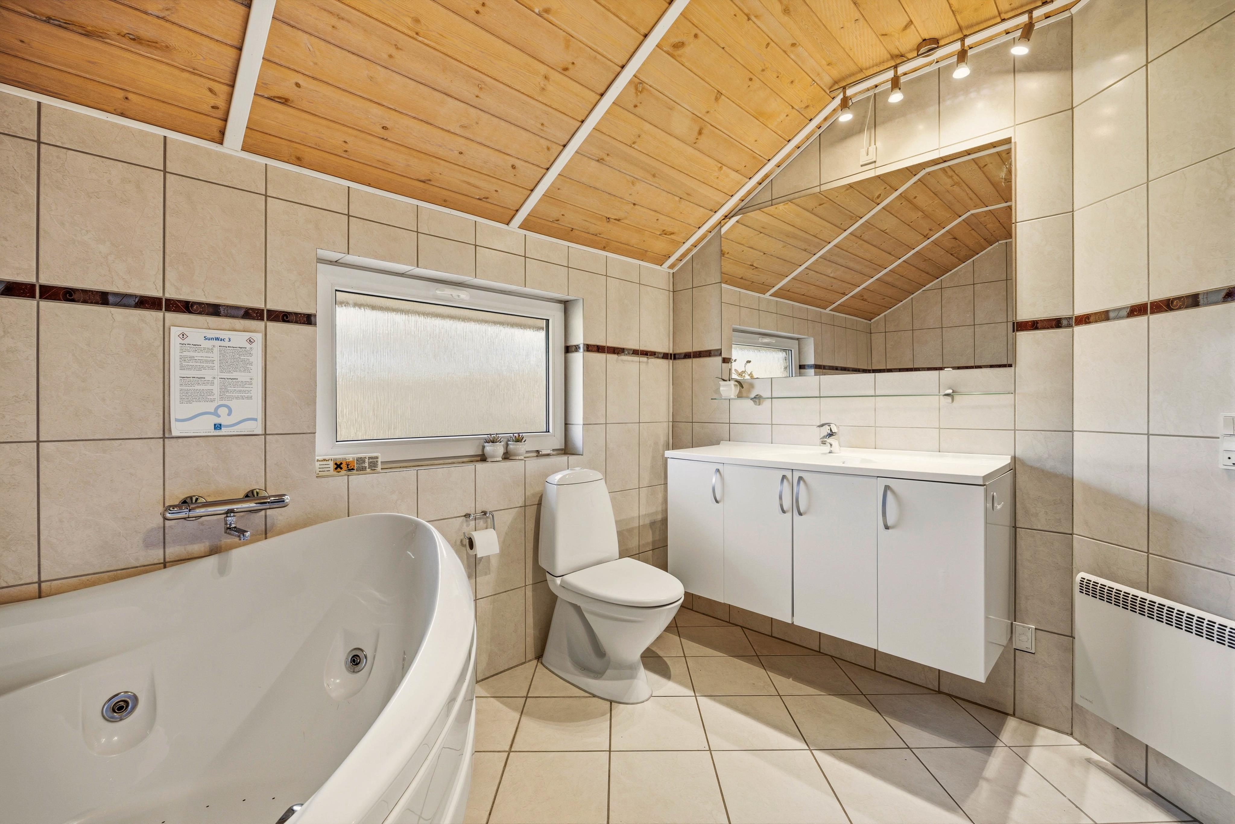 I finder derudover også 1 badeværelse og 1 gæstetoilet, hvor I, i begge rum kan nyde godt at gulvvarmen. Efter gode lange dage, er det derfor også oplagt at nyde godt af badeværelsets tømmespa og sauna. I kan lade jer synke ned i tømmespaen, eller nyde varmen fra saunaen, og slippe alle bekymringer angående vasketøjet, da vaskemaskinen og tørretumbleren sikrer en ren garderobe.