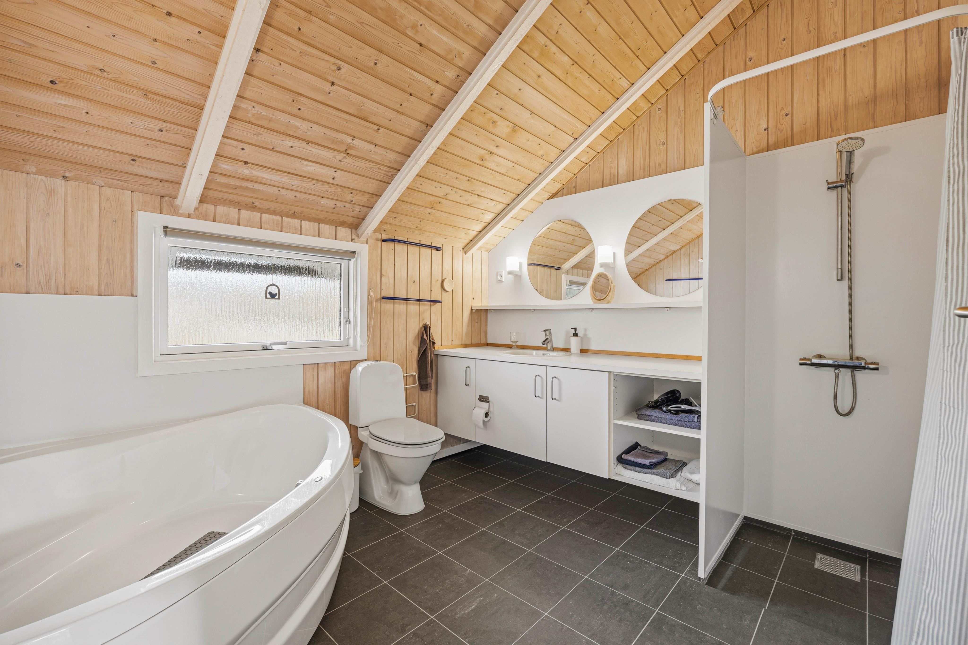 Med både et gæstetoilet og et badeværelse mindskes kødannelsen til toilettet og her har I endda et badekar, hvilket er til stor fornøjelse for både store og små. I køkkenet er der en opvaskemaskine, der gør oprydningen til en leg, og ligeledes har I adgang til en praktisk vaskemaskine, så der ikke er nogle, der løber tør for rent tøj på ferien. Sommerhusets effektive og energivenlige luft-til-luft varmepumpe sikrer et godt indeklima og at temperaturen altid er behagelig, uanset årstiden.