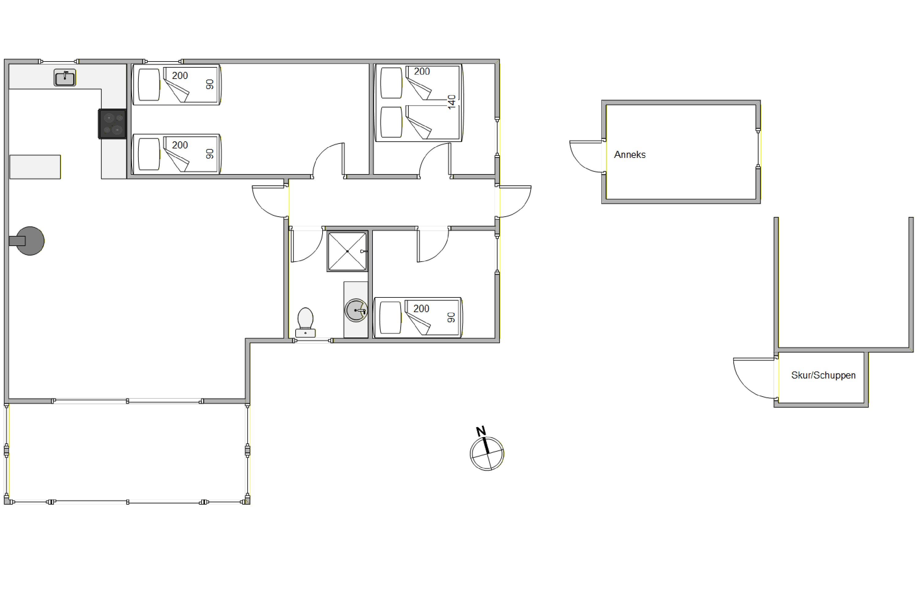 I køkkenet kan du tilberede lækre kulinariske retter eller noget enkelt som pasta med tomatsauce. Her kan børnene også være med til at hakke, og bagefter sætter de det hele i opvaskemaskinen. Efter madlavningen kan I enten sidde udenfor og nyde aftenen under åben himmel. Eller indenfor, hvor I kan tænde op i brændeovnen og sætte jer godt til rette i sofaen, mens I ser en god film på tv'et. Du kan varme feriehuset op med den energibesparende varmepumpe, hvis du har brug for at varme op hurtigt. Du vil sikkert tilbringe meget tid i udestuen, især i dårligt vejr, eller når det er køligt udenfor.
