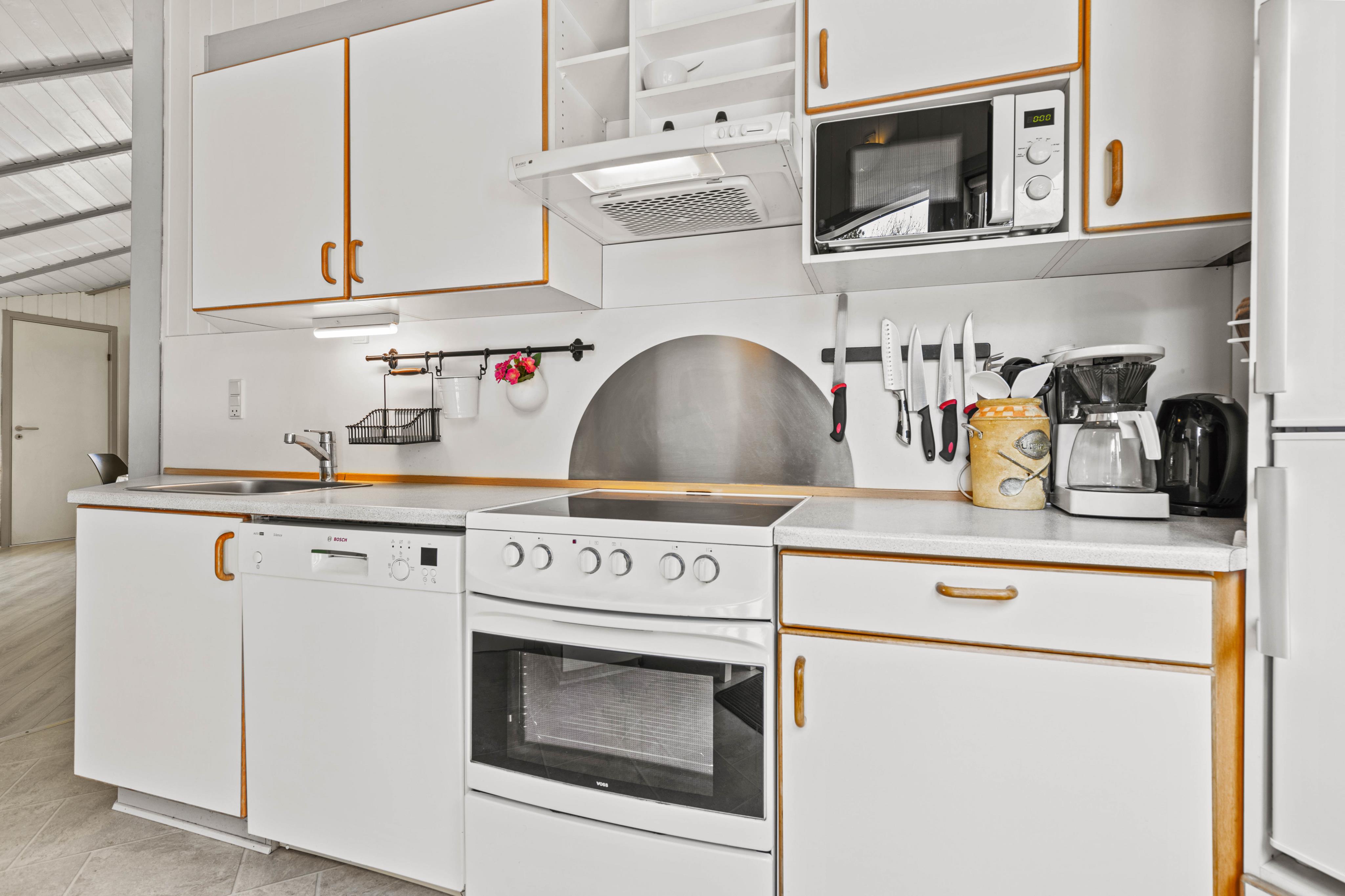 Det er et dejligt stemningsfyldt hus skabt til fællesskab og feriehygge: Køkkenet og spiseafdelingen står i åben forbindelse med opholdsstuen, hvor det, når dagen går på hæld, er ekstra skønt at tænde op i brændeovnen for ekstra varme og gyldent lys, når der skal slappes af i den bekvemme sofa.
