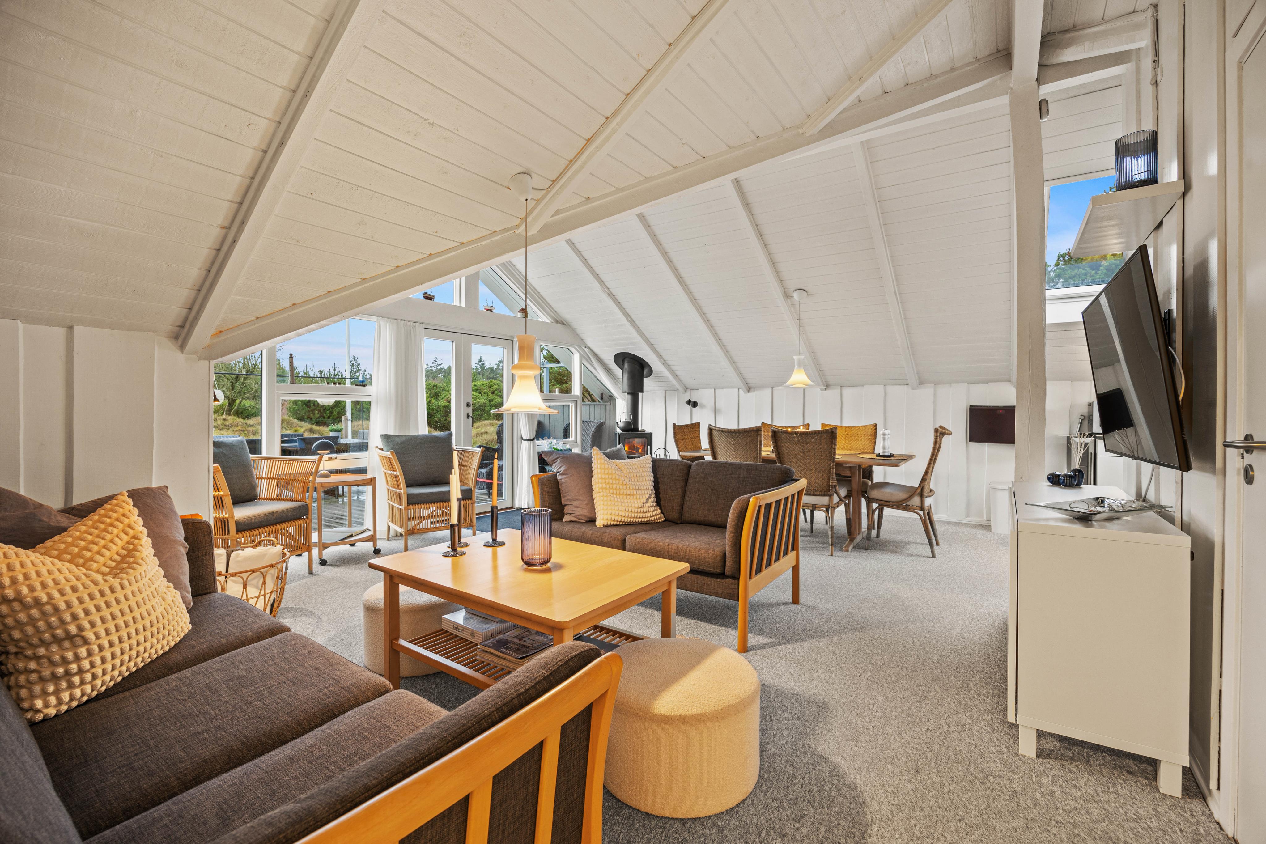 Om aftenen I kan for hyggens skyld tænde op i sommerhusets brændeovn, for den primære varmekilde er en energibesparende varmepumpe og lytte til lidt godt musik, (der kan streames). Husets gode internetforbindelse garanterer, at også teenagebørnene vil med på ferie.
