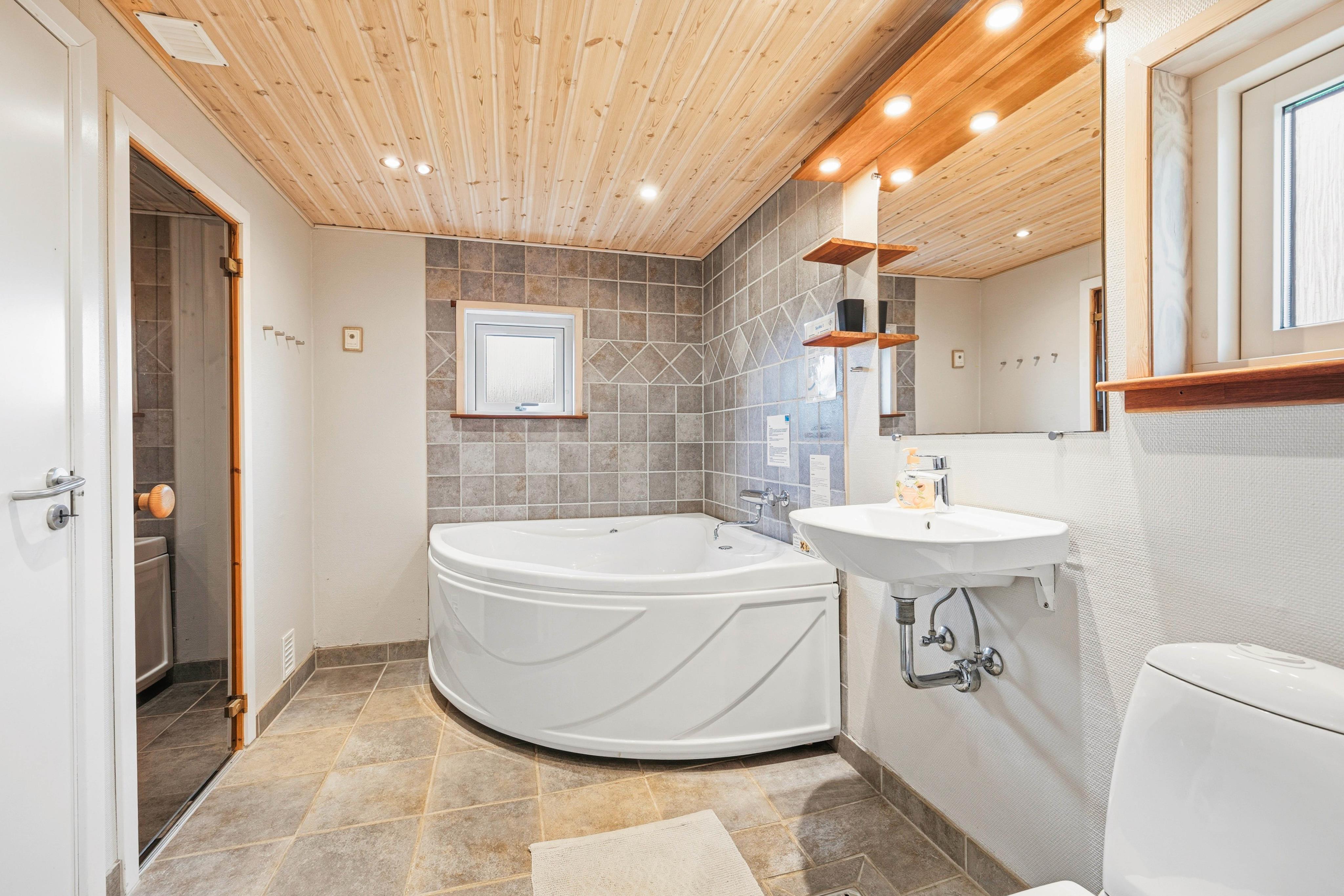 Foruden det store opholdsrum er der i sommerhuset 3 soveværelser, det ene med en sovesofa, og 1 badeværelse. På badeværelset finder I også sommerhusets spaafdeling med et lækkert spabad og sauna, hvor I kan få lige den afslapning, I har brug for.