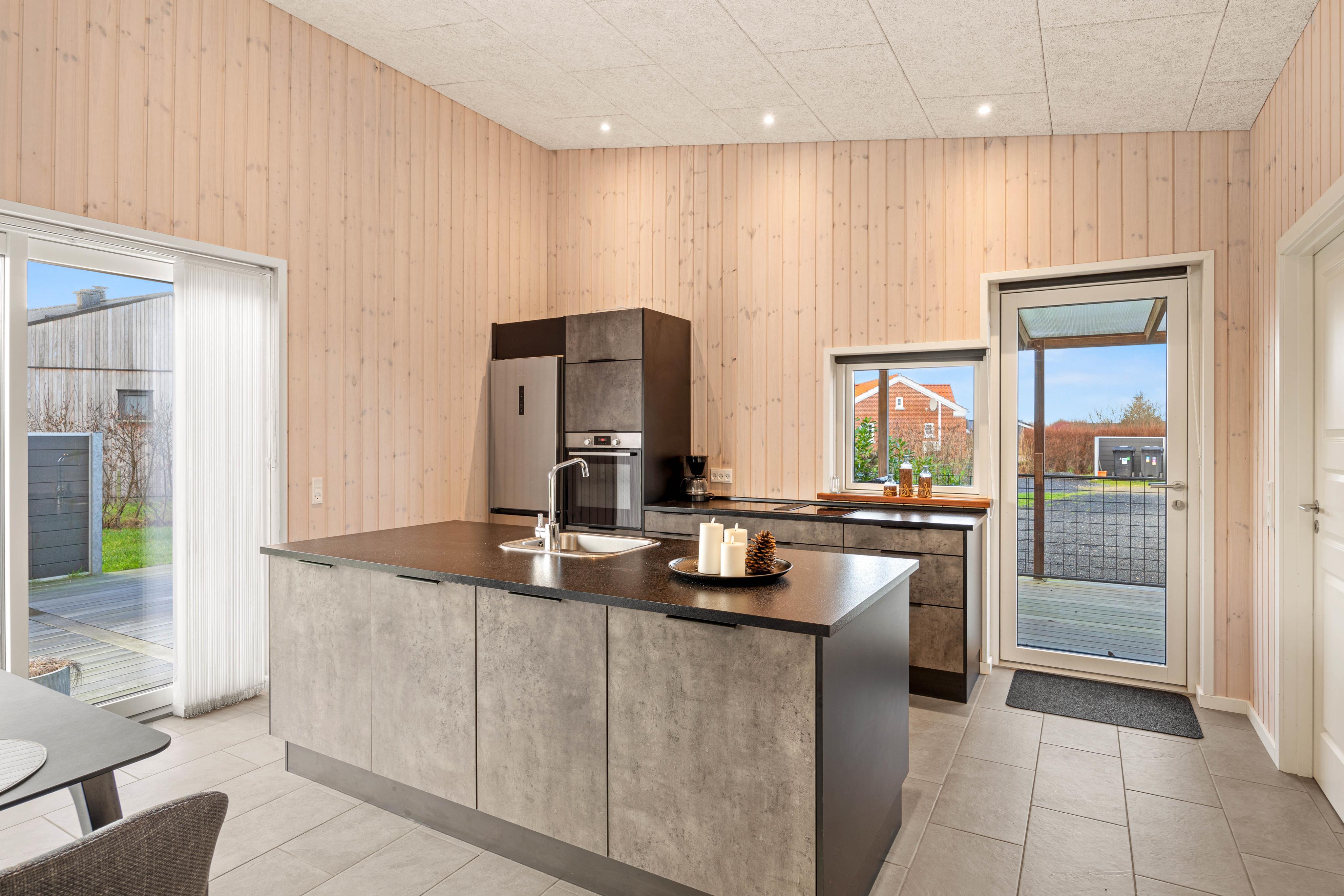 Når I træder ind i sommerhuset, vil I blive mødt af den charmende og stilrene indretning som går igen igennem hele huset. Varmen skal I ikke tænke på, da sommerhuset både har varmepumpe og gulvvarme som sikrer behagelige temperaturer. Når man holder ferie, skal der mange måltider til og det sørger det skønne køkken for, som også er udstyret med en opvaskemaskine til at klare opvasken.