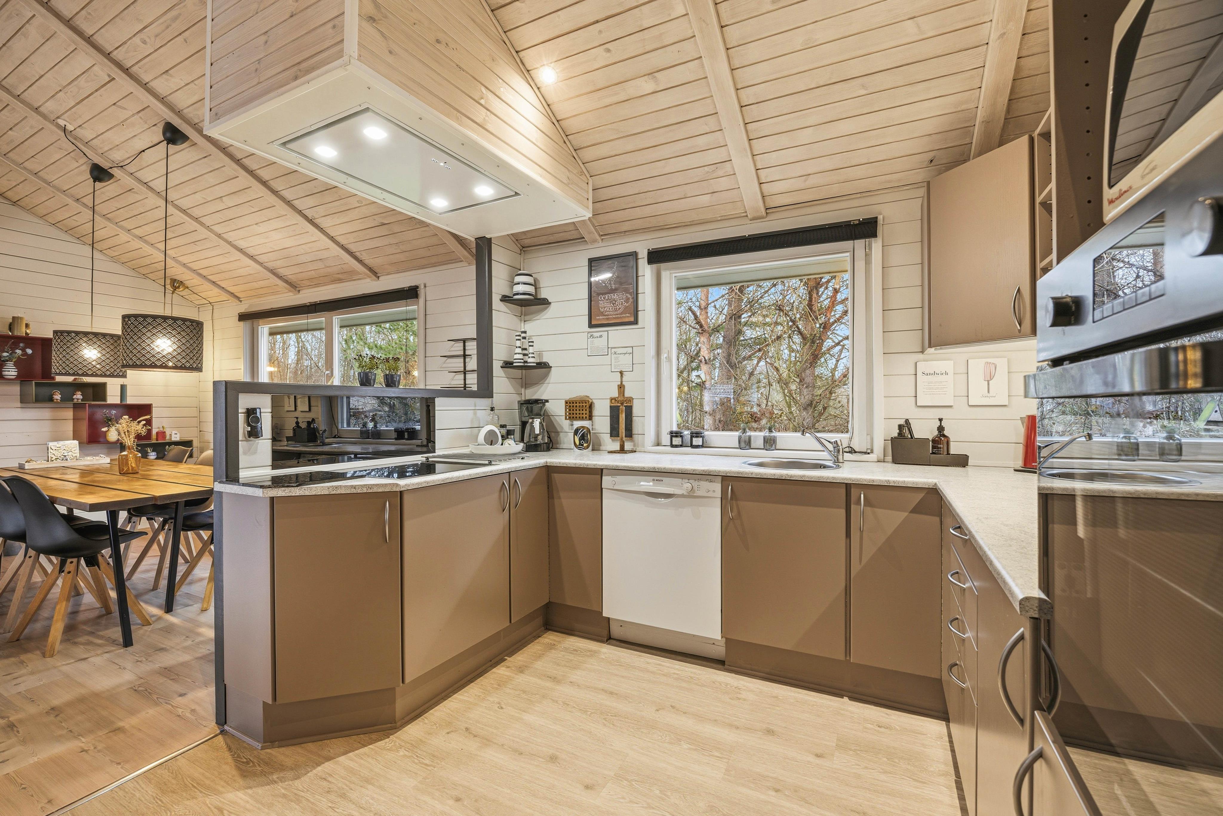 Det store vinduesparti i karnappen og terrassedørene giver et fint lysindfald i stuen. Her kan I hygge jer i sofagruppen, imens ilden knitrer i brændeovnen. Eller I kan arrangere en fælles madlavningsaften i det åbne køkken. Her er alt, hvad I behøver for at forkæle hinanden med lækre retter – prøv for eksempel en fiskeaften eller nogle af de lokale egnsretter.