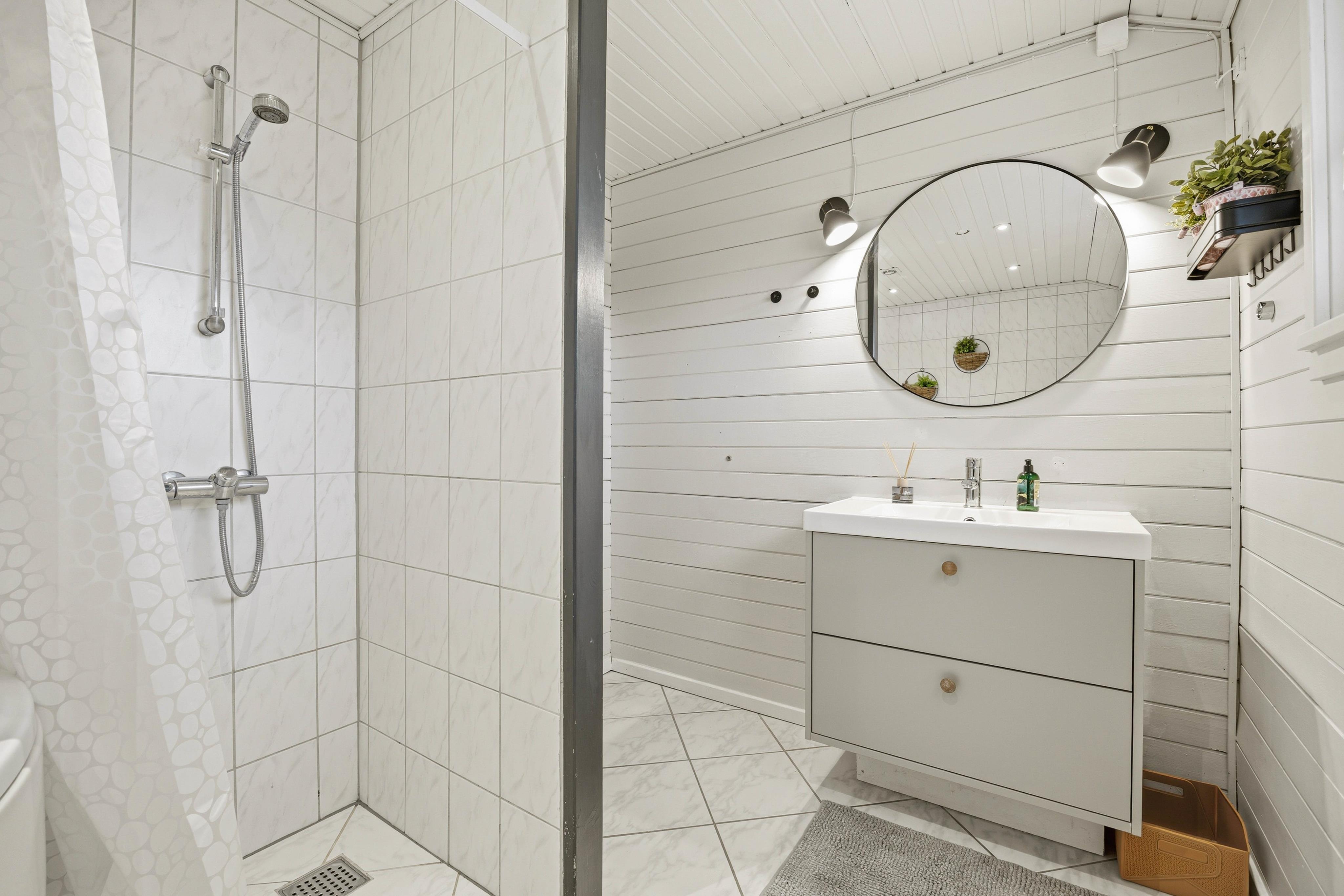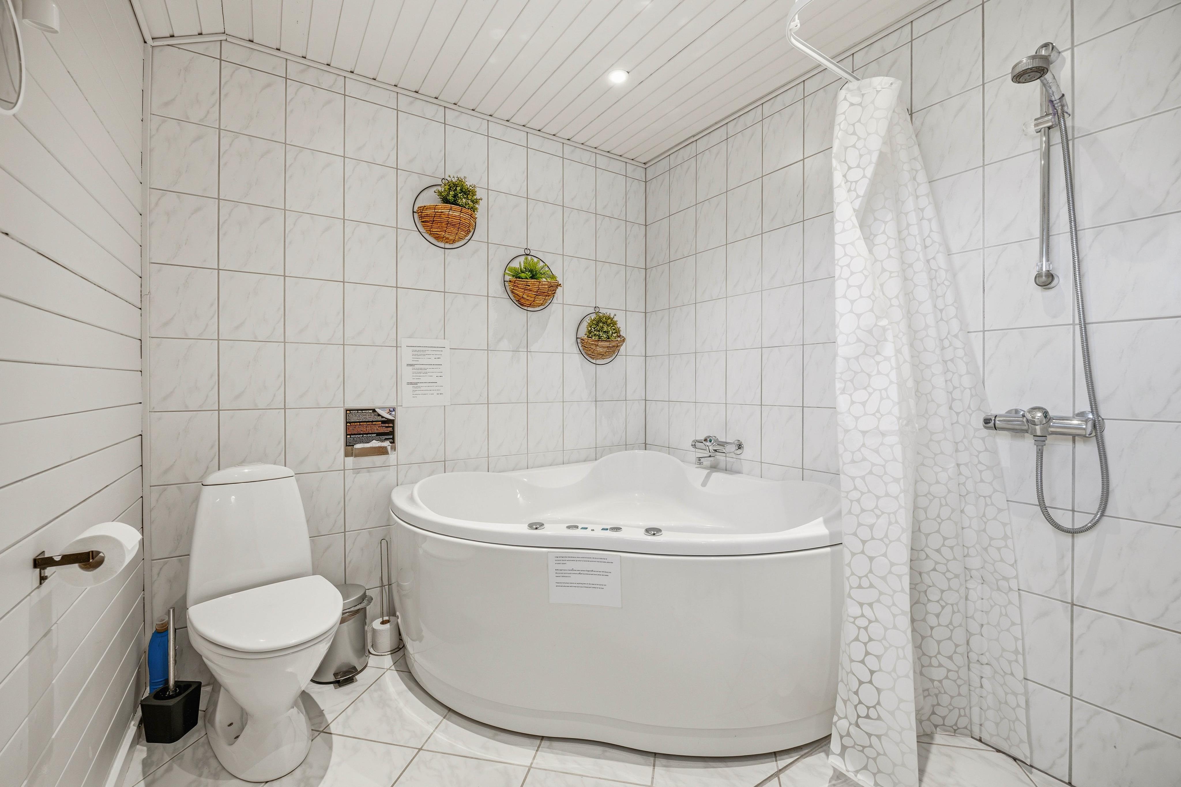 I forbindelse med det store badeværelse med gulvvarme er der et spabad, hvor I kan bruge tid på egen-wellness og muskelafslapning. Med et ekstra gæstetoilet med gulvvarme behøver I ikke at stå i kø til tandbørstningen. Moderne hvidevarer og faciliteter skal I naturligvis ikke mangle på ferien – her er opvaskemaskine, vaskemaskine, tørretumbler og en energibesparende varmepumpe.