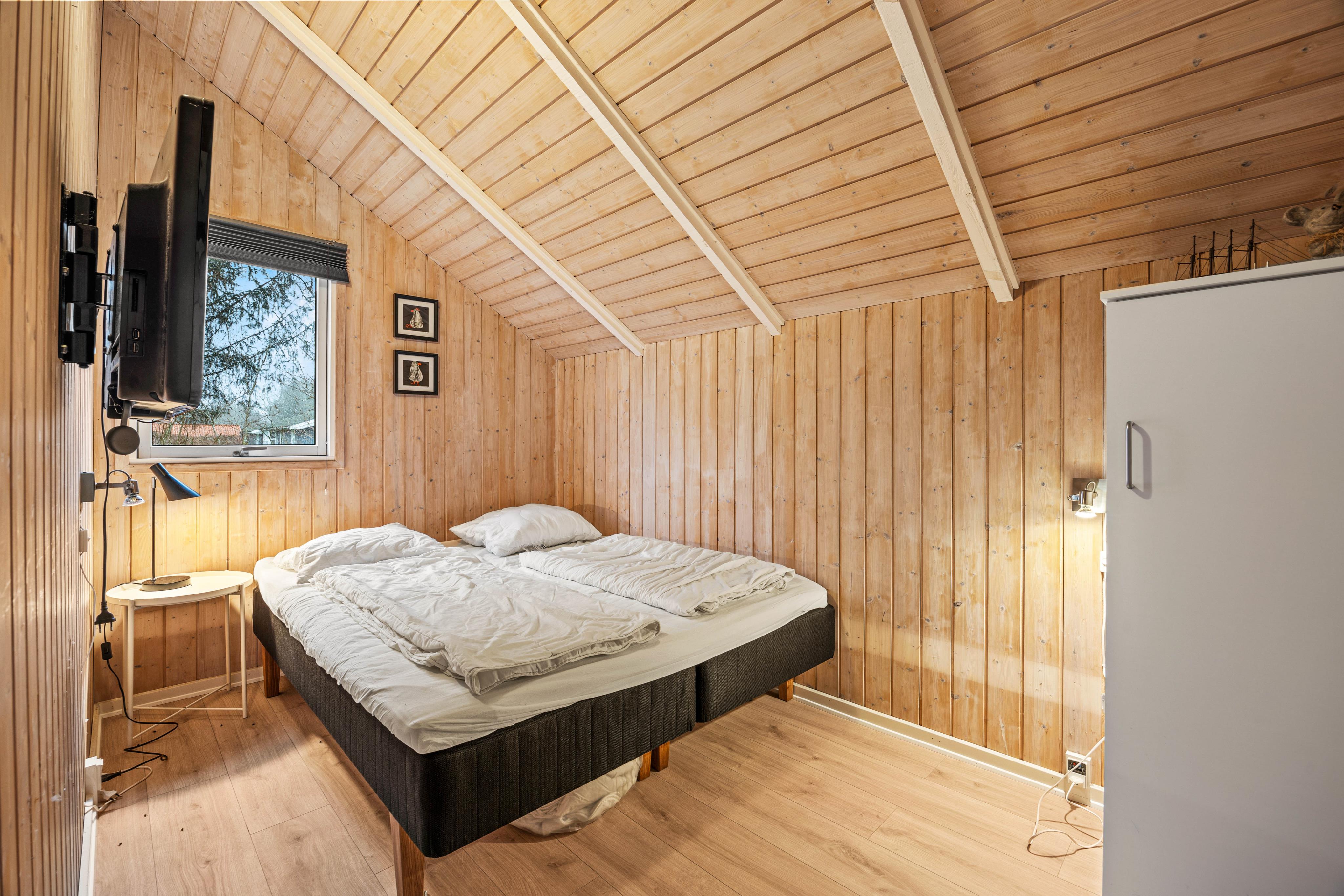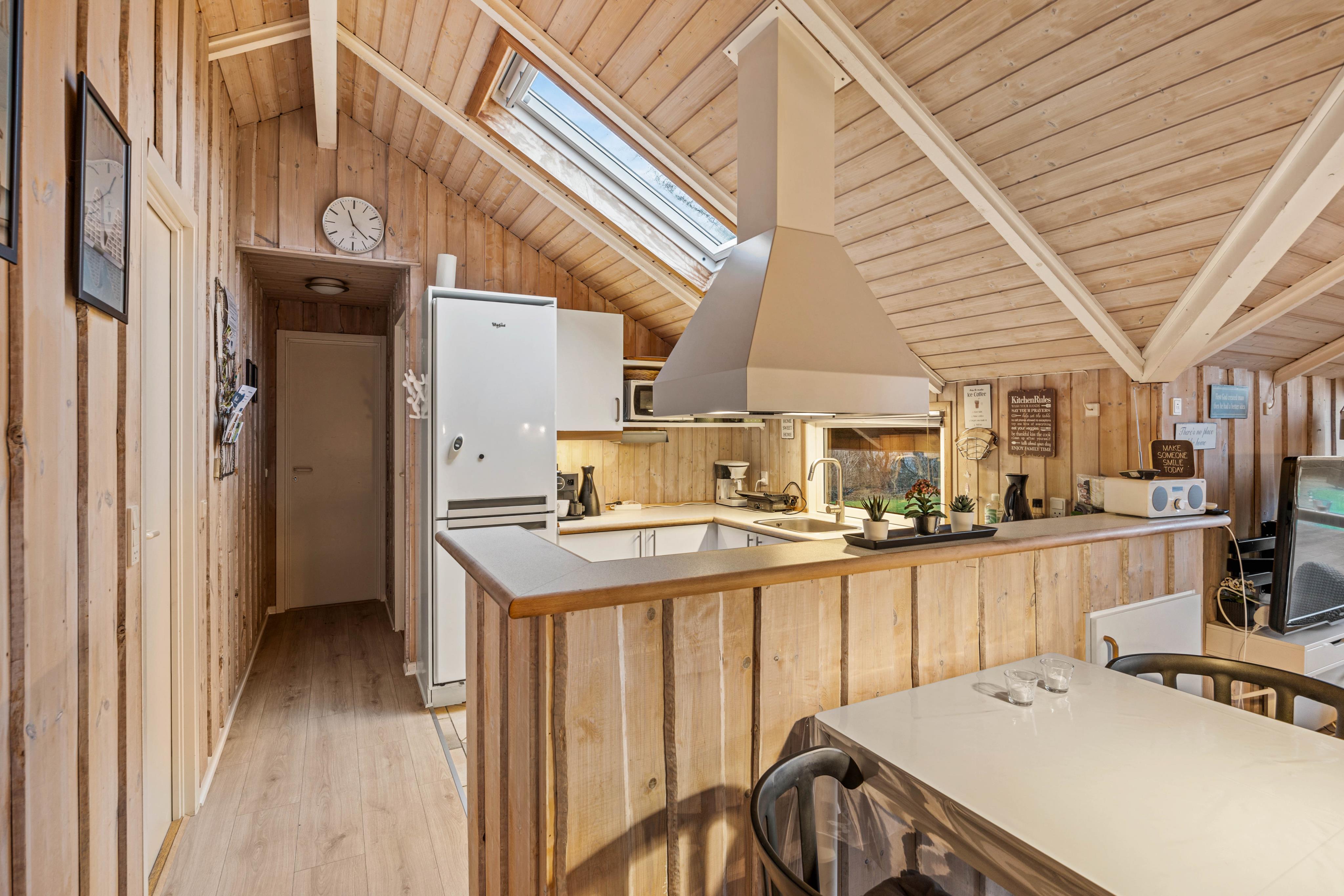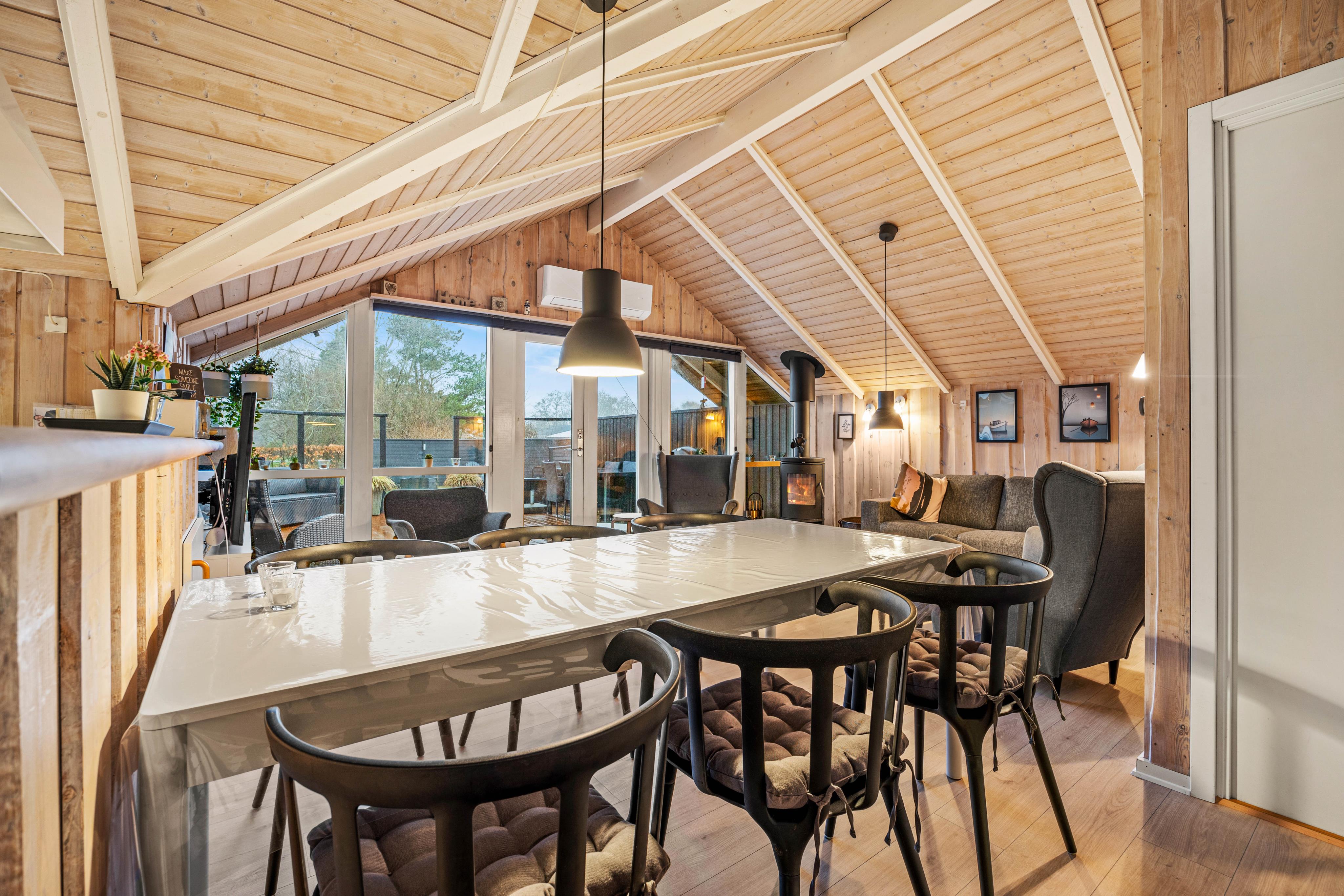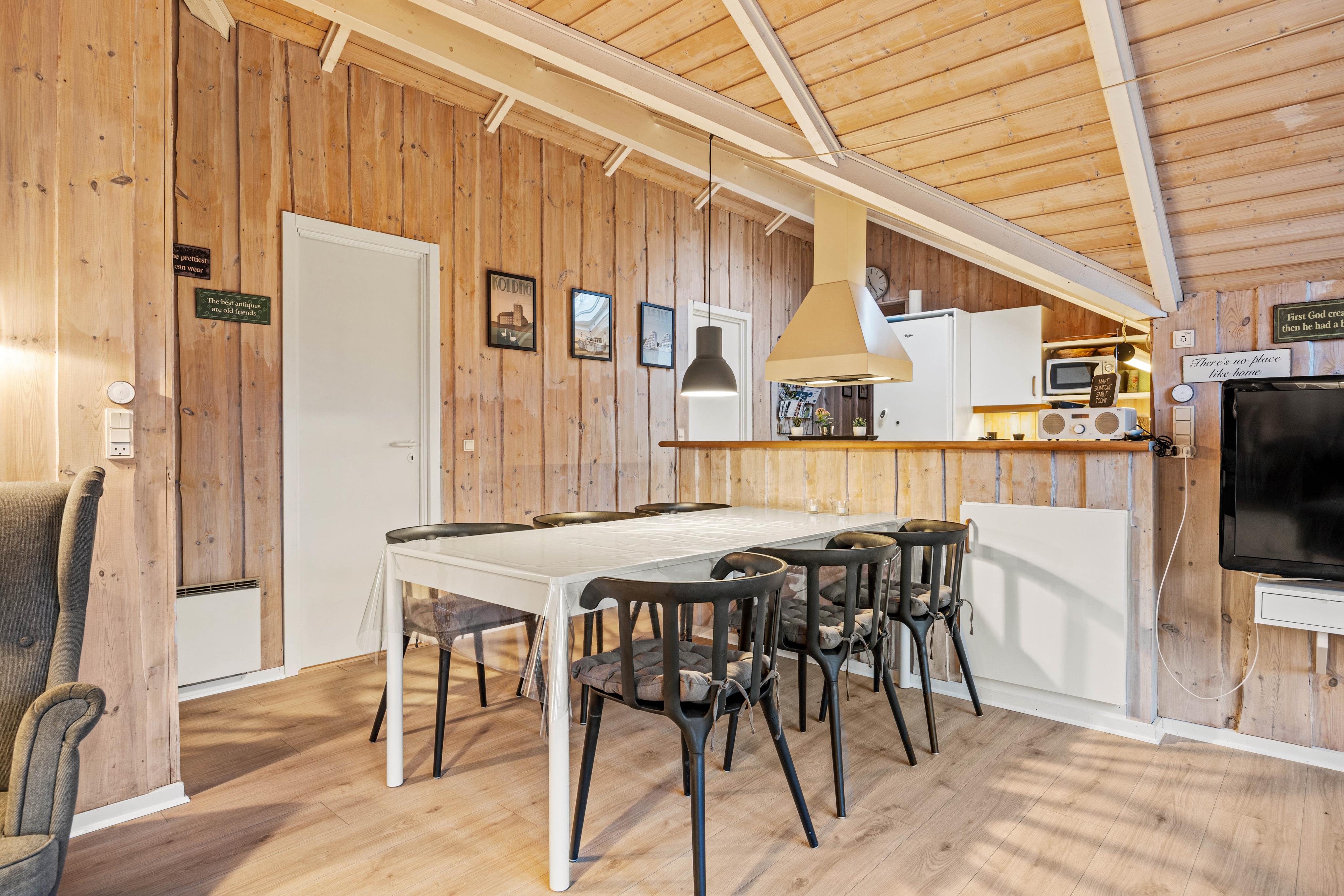 Allerede når I træder ind i sommerhuset, vil I føle den klassiske stemning af dansk sommerhusferie. Alle vægge og lofter indenfor er beklædte med træ, hvilket giver et lyst og naturligt udseende. Fra gangen kan I gå videre ind i det store opholdsrum, hvor stue, køkken og spisestue er samlet i samme rum. På den måde kan I nyde hinandens nærvær, selvom I hver især slapper af med noget forskelligt. Nogle bager måske en lækker kage i køkkenet, mens de andre lægger puslespil ved spisebordet eller nyder en god bog i sofaen – eller måske streamer yndlingsserien via sommerhusets Chromecast.
