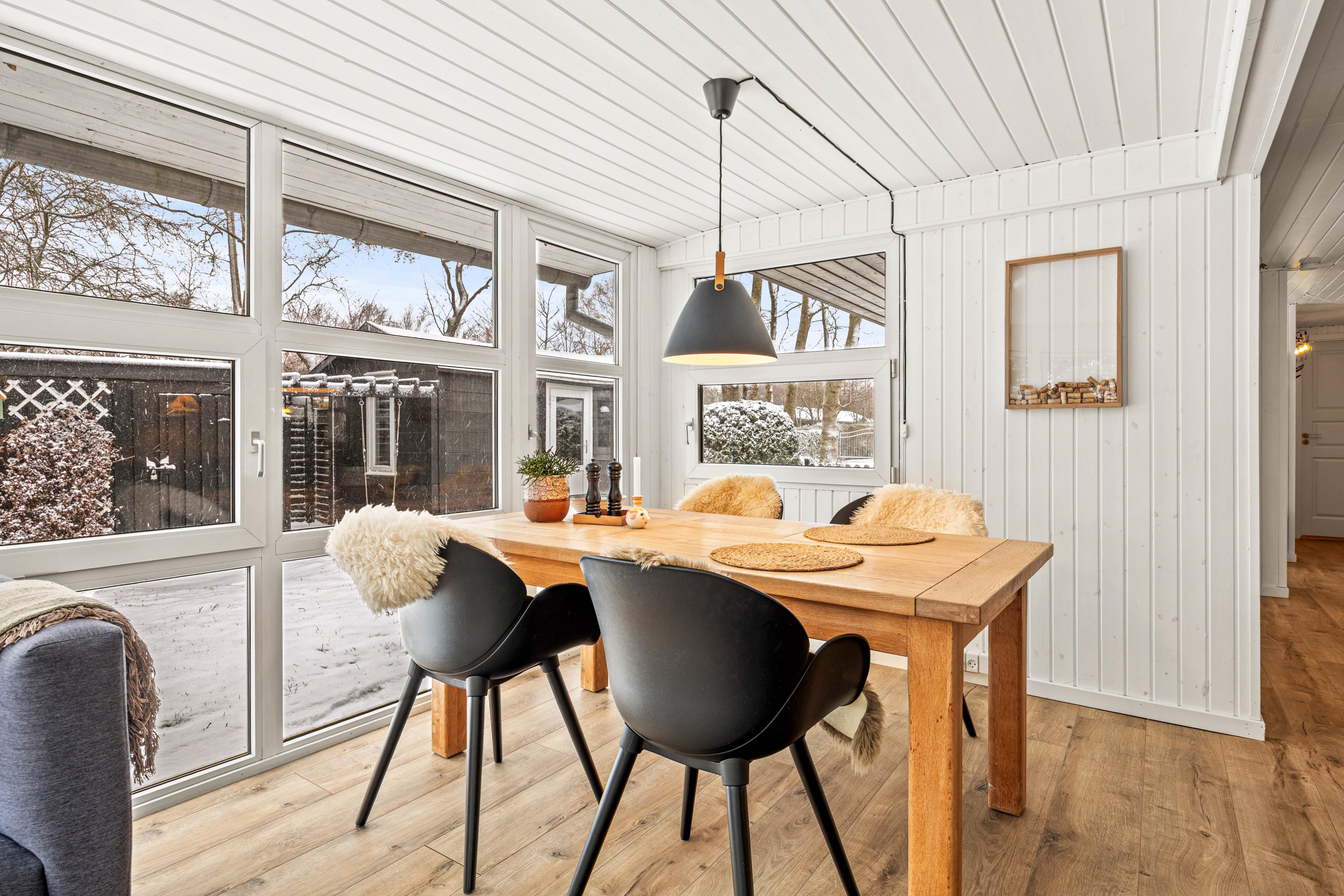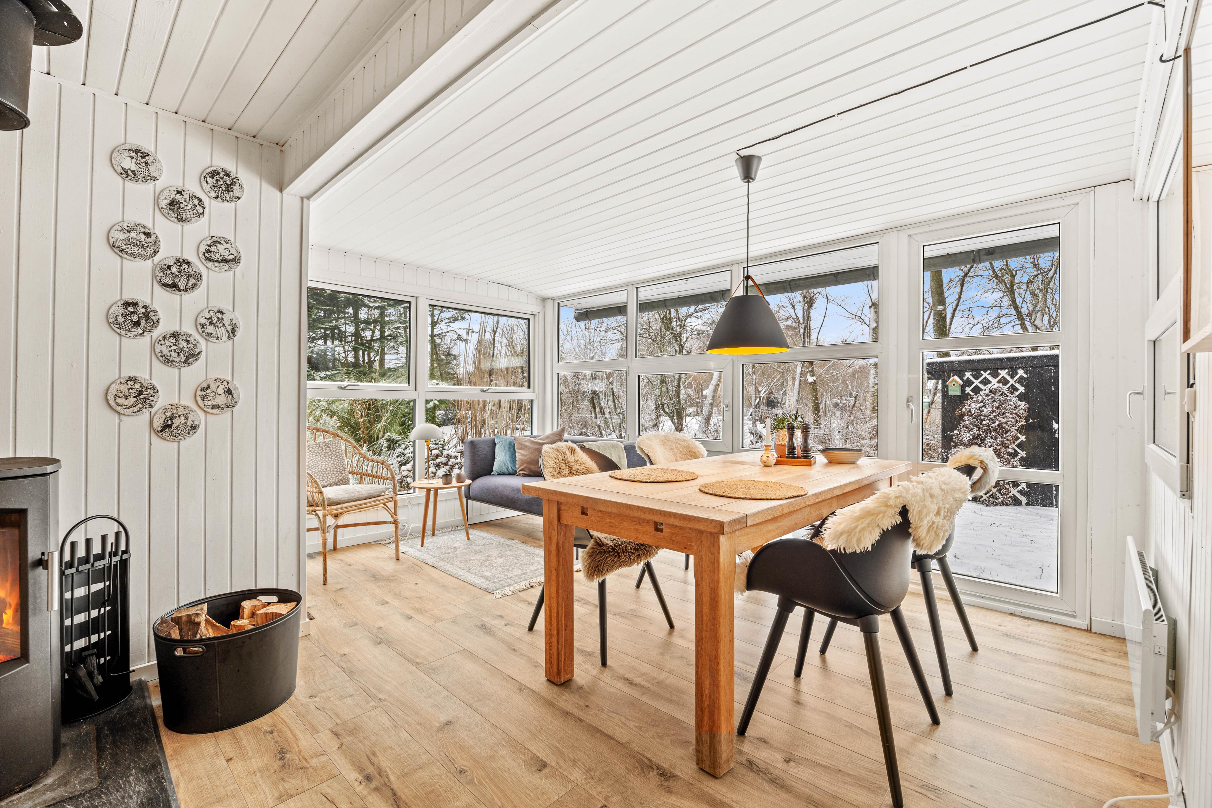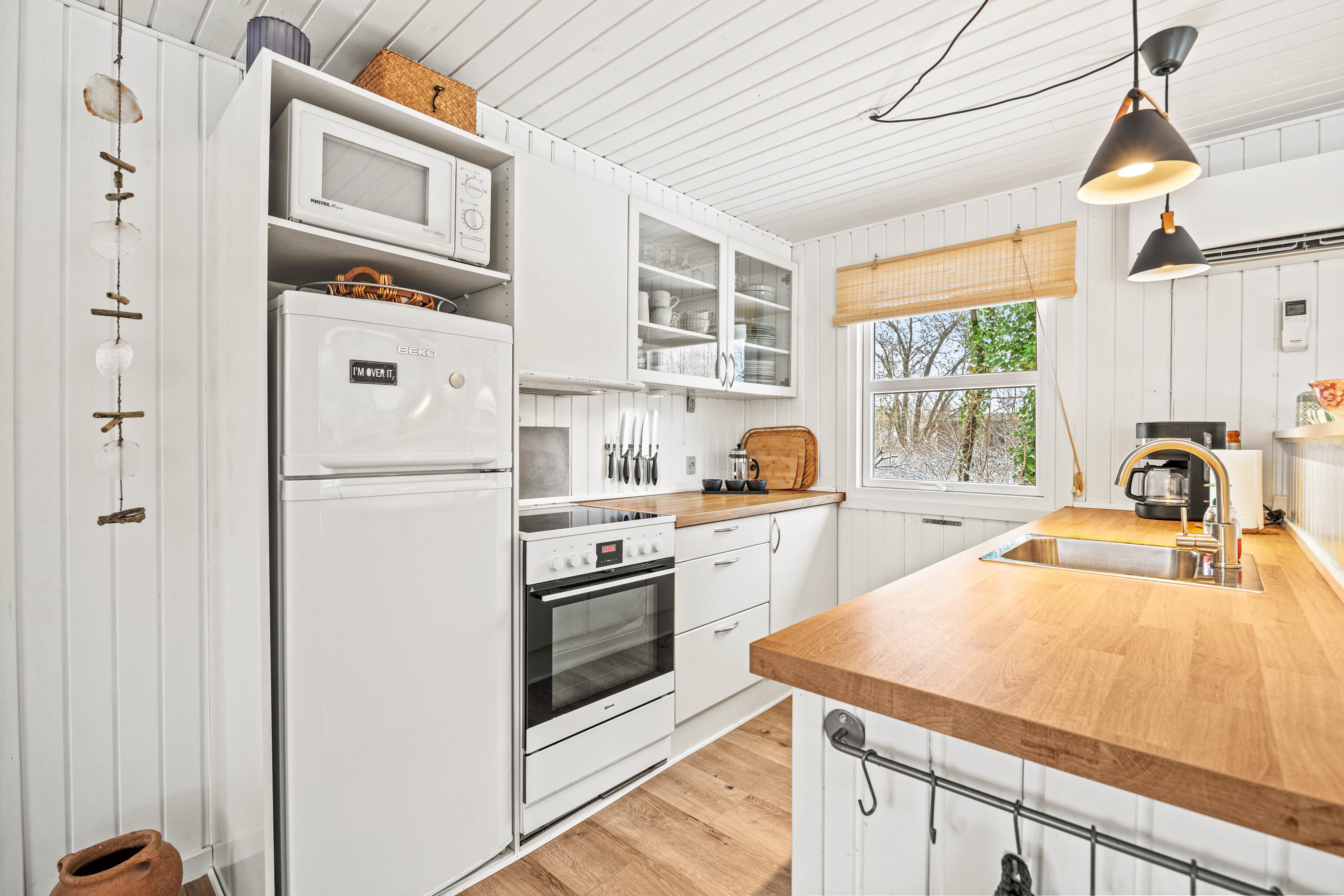 Sommerhusets indeareal byder på både komfort og funktionalitet, der gør jeres ophold afslappende. I stuen kan I samles i sofaen omkring den hyggelige brændeovn, der skaber en varm og indbydende atmosfære, perfekt til afslapning efter en dag ved havet. Køkkenet er udstyret med alle nødvendigheder, inklusiv en praktisk opvaskemaskine, der gør det nemt at holde styr på opvasken.