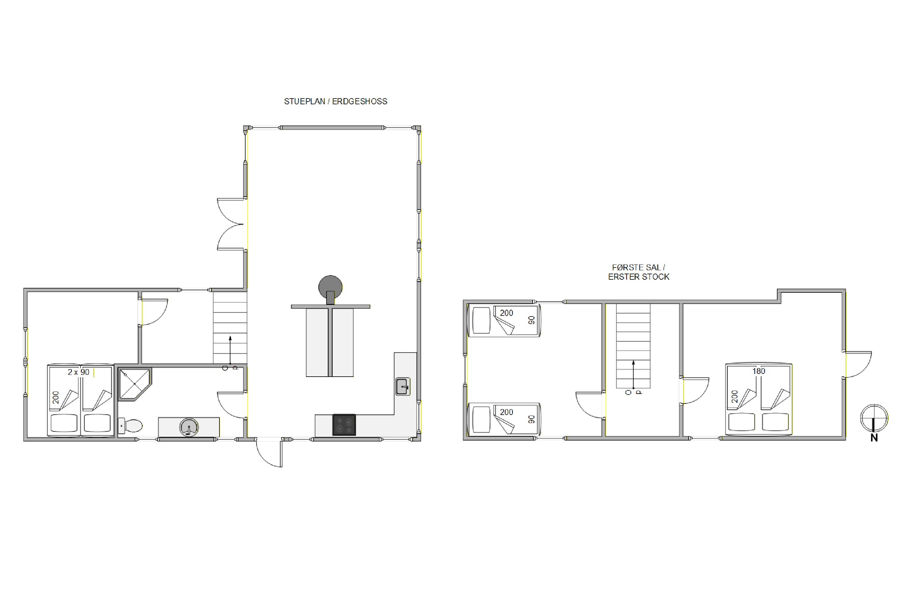 Sommerhusets 3 soverum er perfekt til familier eller grupper af venner. I det største soverum finder I en behagelig dobbeltseng, mens de 2 øvrige værelser byder på enkeltsenge. Det ene soveværelse med enkeltsenge er placeret i stueetagen, de andre soveværelser befinder sig på første sal, og er tilgængelig via en praktisk trappe.