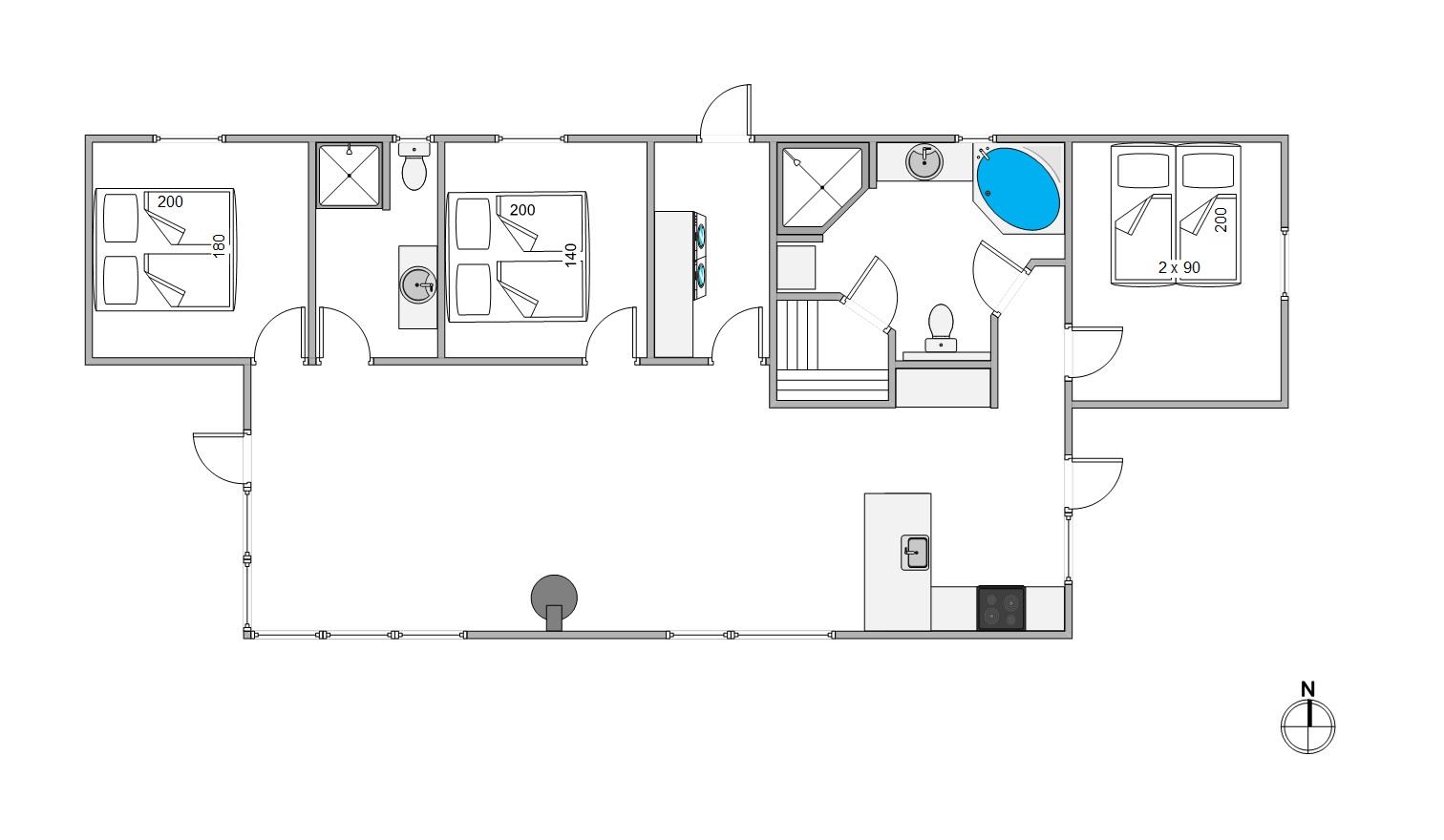 Sovepladserne er fordelt over 3 hyggelige og rummelige soveværelser, som giver muligheden for et privat frirum til alle. Desuden er der 2 badeværelser, begge med indlagt gulvvarme. I det ene badeværelse kan I endda nyde både sauna og spabad – perfekt til afslapning og selvforkælelse efter en skøn tur ved stranden.