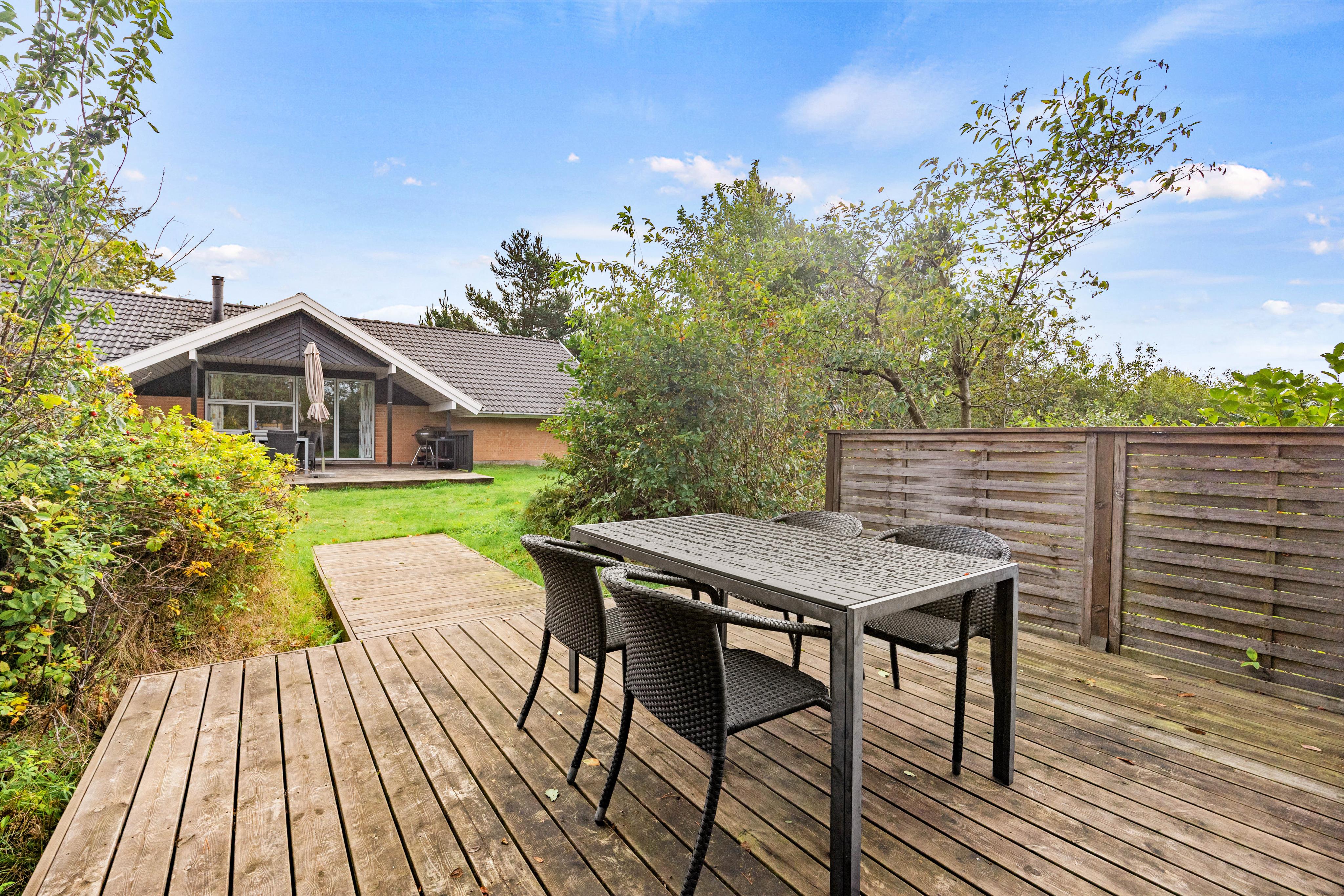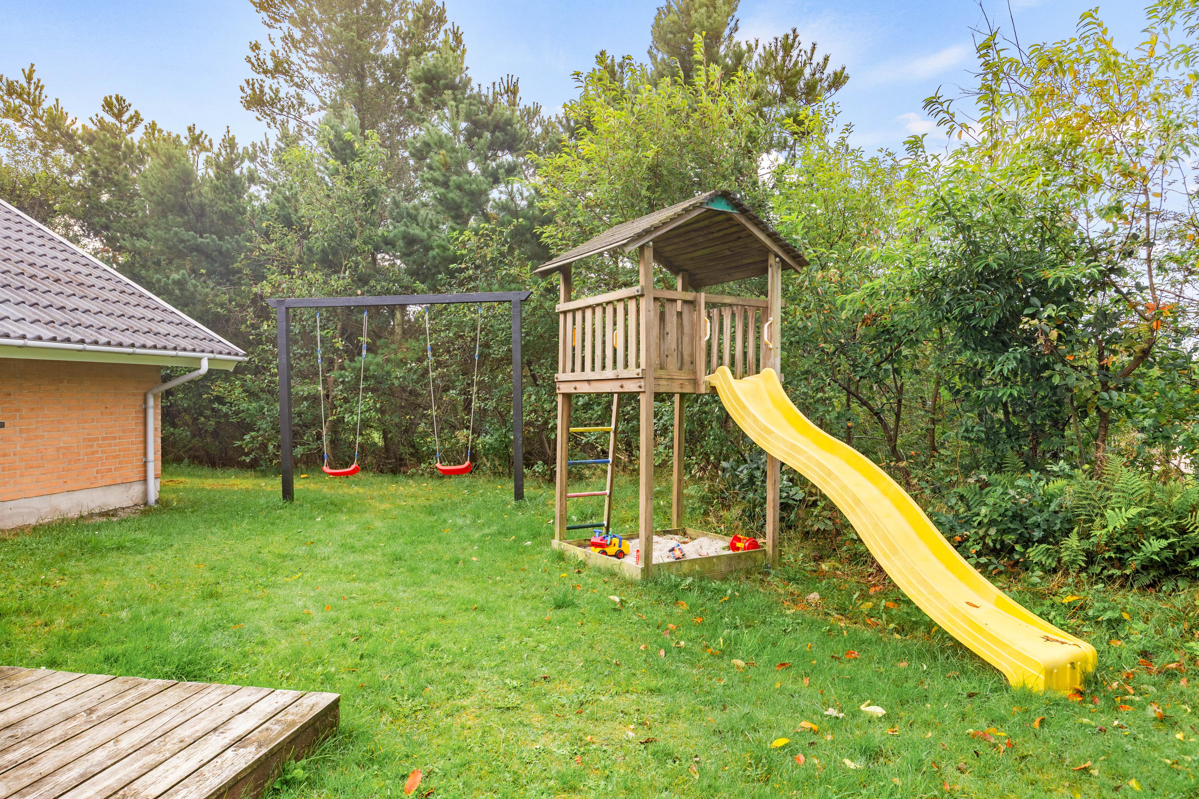 Nyd ferien i den skønne natur, på en af de to terrasser, hvor der både er plads til at nyde et dejligt måltid, og slappe af med en god bog. På den store naturgrund, er der plads til både store og små. Der er rutsjebane, gynger samt sandkasse for de mindste, og plads til diverse spil på den store plæne, for de større.