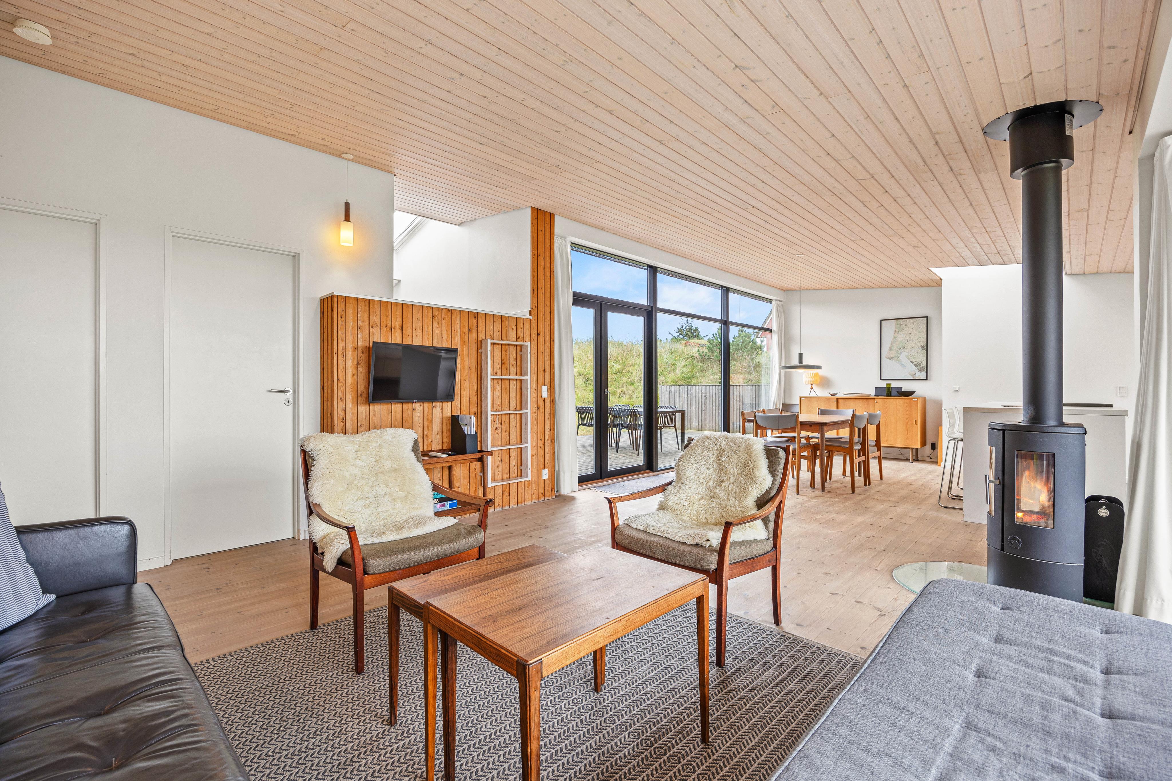 De store vinduespartier og ovenlysvinduer lukker masser af lys ind i sommerhuset, der skaber en god atmosfære at være i, og giver en god udsigt til den omkringliggende natur og de smukke klitter.