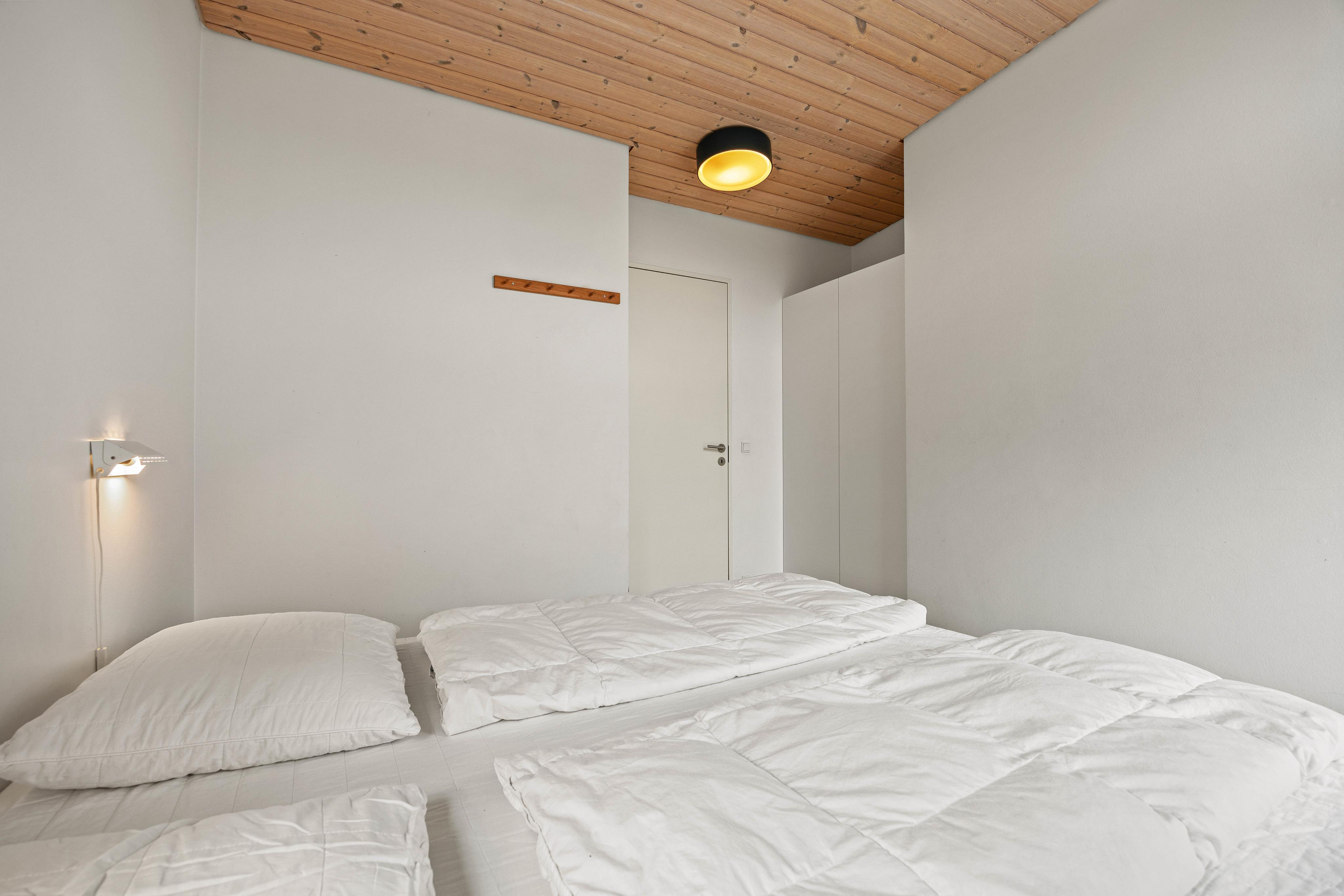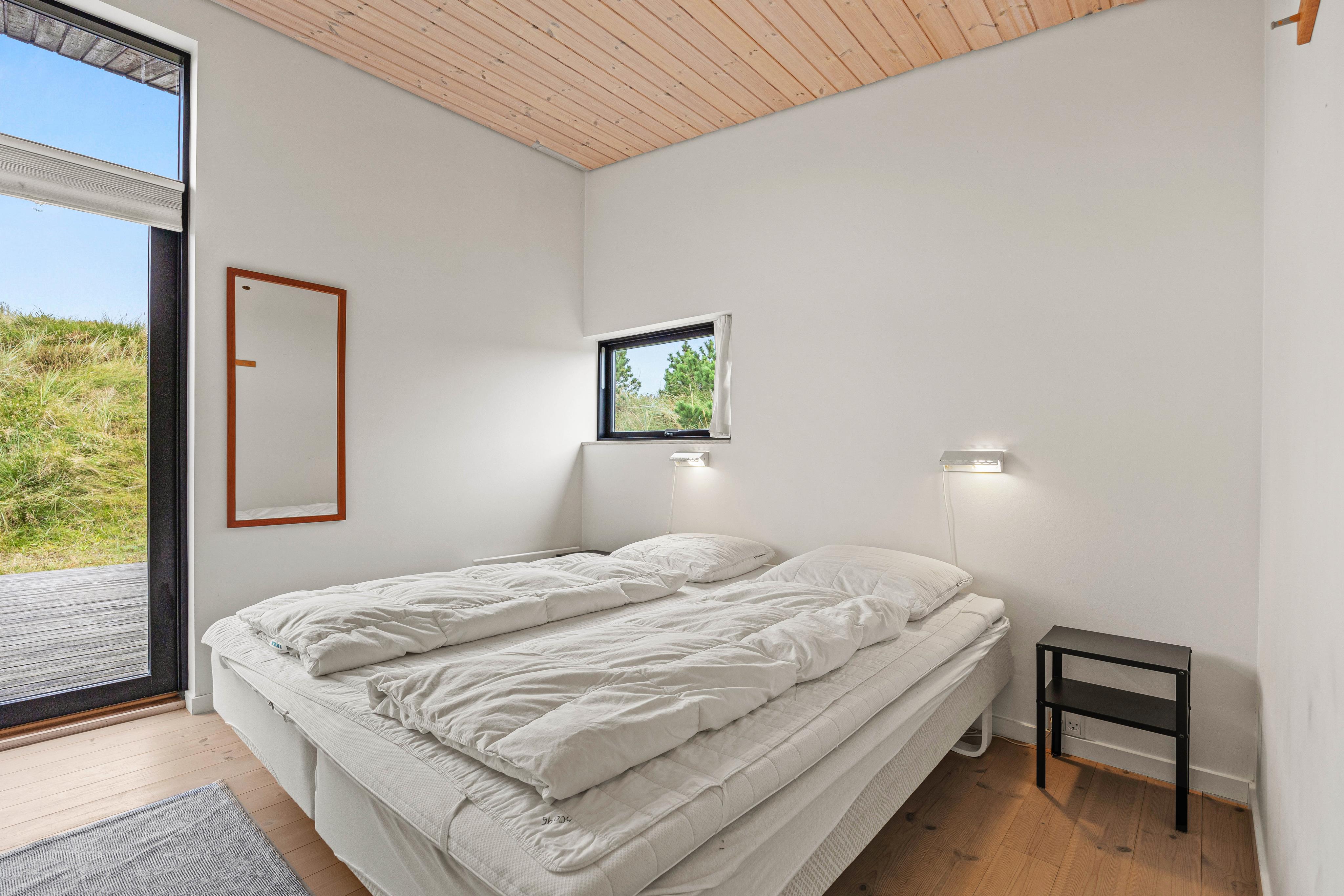 Moderne, lyst hus med moderne møbler i 1960'ernes stil. Højkvalitets indretning i velholdt, rent stand. Det store opholdsområde er om vinteren meget godt opvarmet gennem gulvvarme i køkkenet og yderligere gennem den smukke brændeovn og/eller varmepumpen, ligeledes kan de to moderne badeværelser opvarmes tilstrækkeligt gennem gulvvarme. Til det store badeværelse med bruser og tilstødende sauna er der et mindre badeværelse med bruser og toilet. Der er også mulighed for en udendørs bruser med varmt vand. Sengene i de tilstrækkeligt store 3 soveværelser har gode madrasser. Sengen i et rum er en hyggelig alkove. Et yderligere plus er et ekstra soveplan med 3 madrasser, som man kan nå via en lodret stige fra opholdsområdet. Selvom huset ligger ved vejen, er det roligt og omgivet af klitter. Den korte vej til stranden går over en klit.