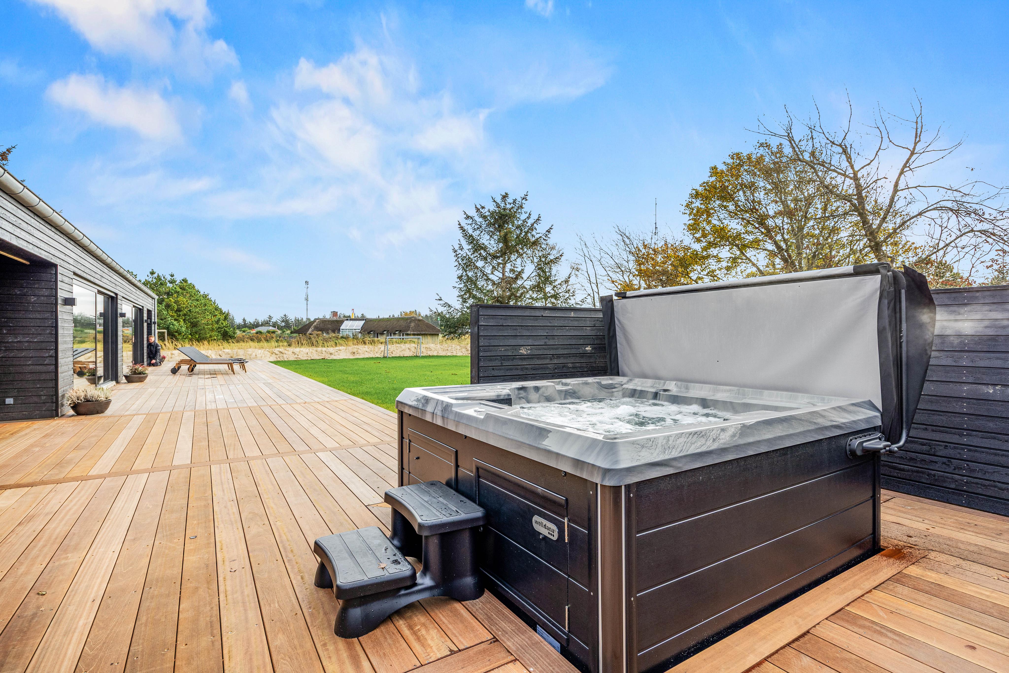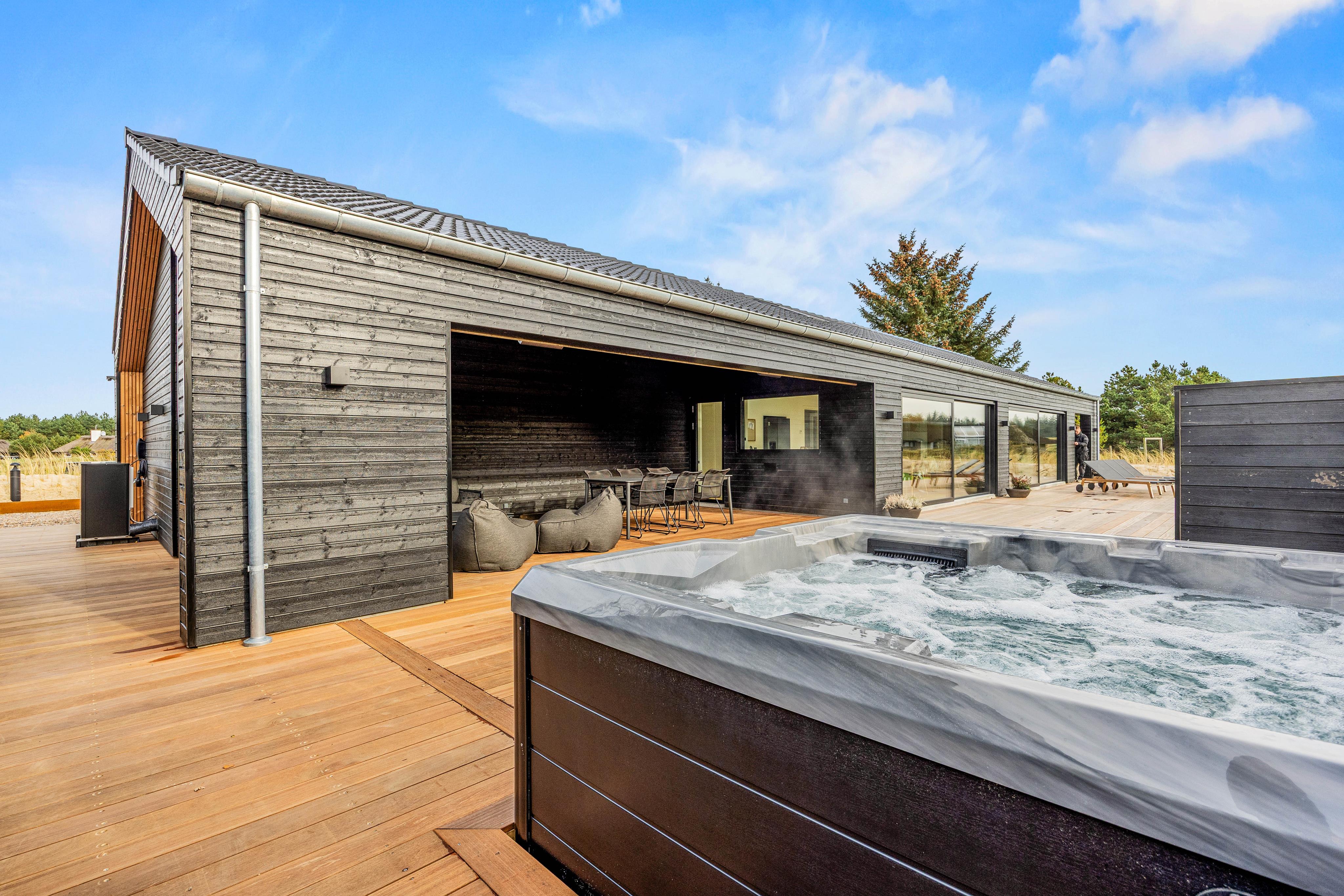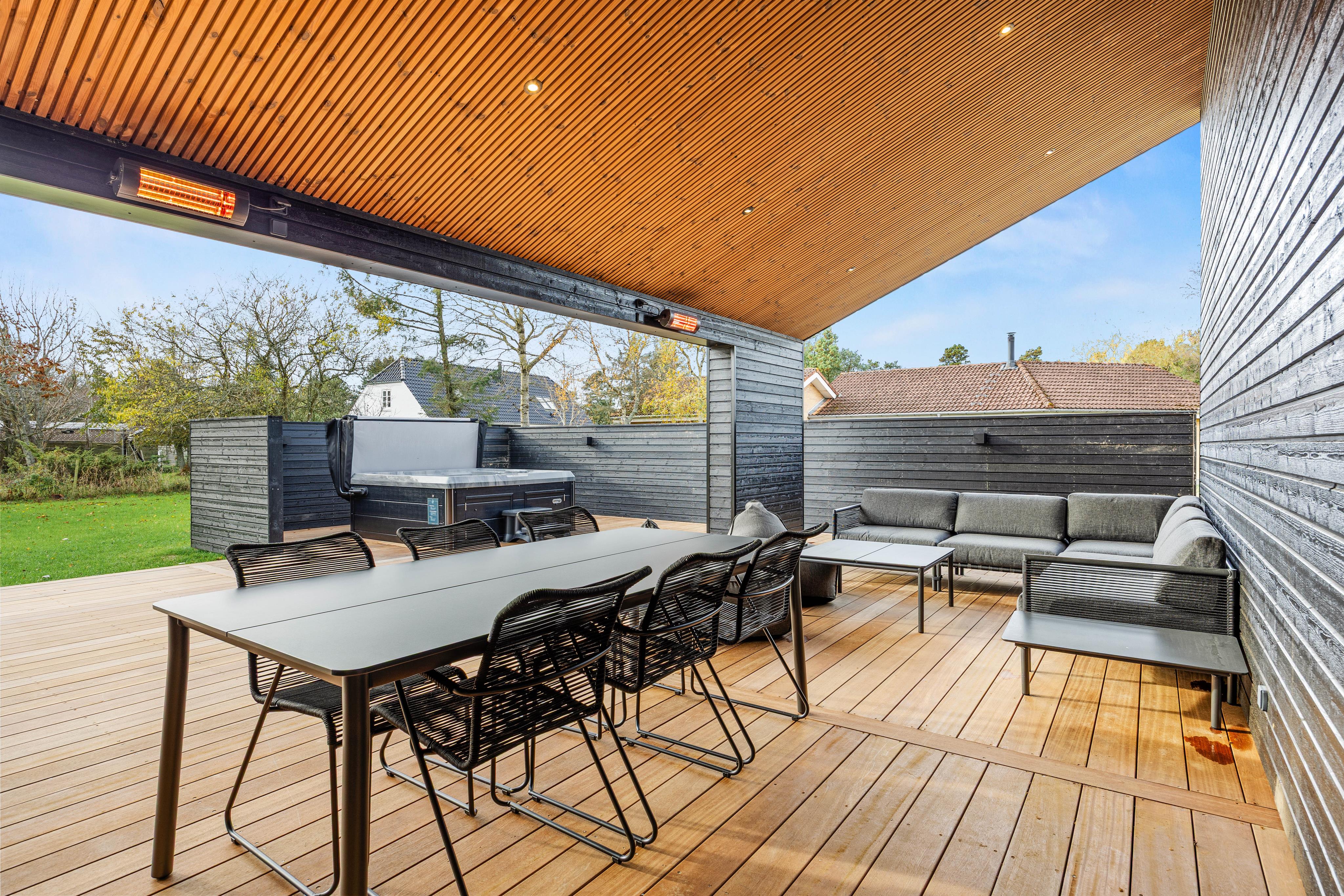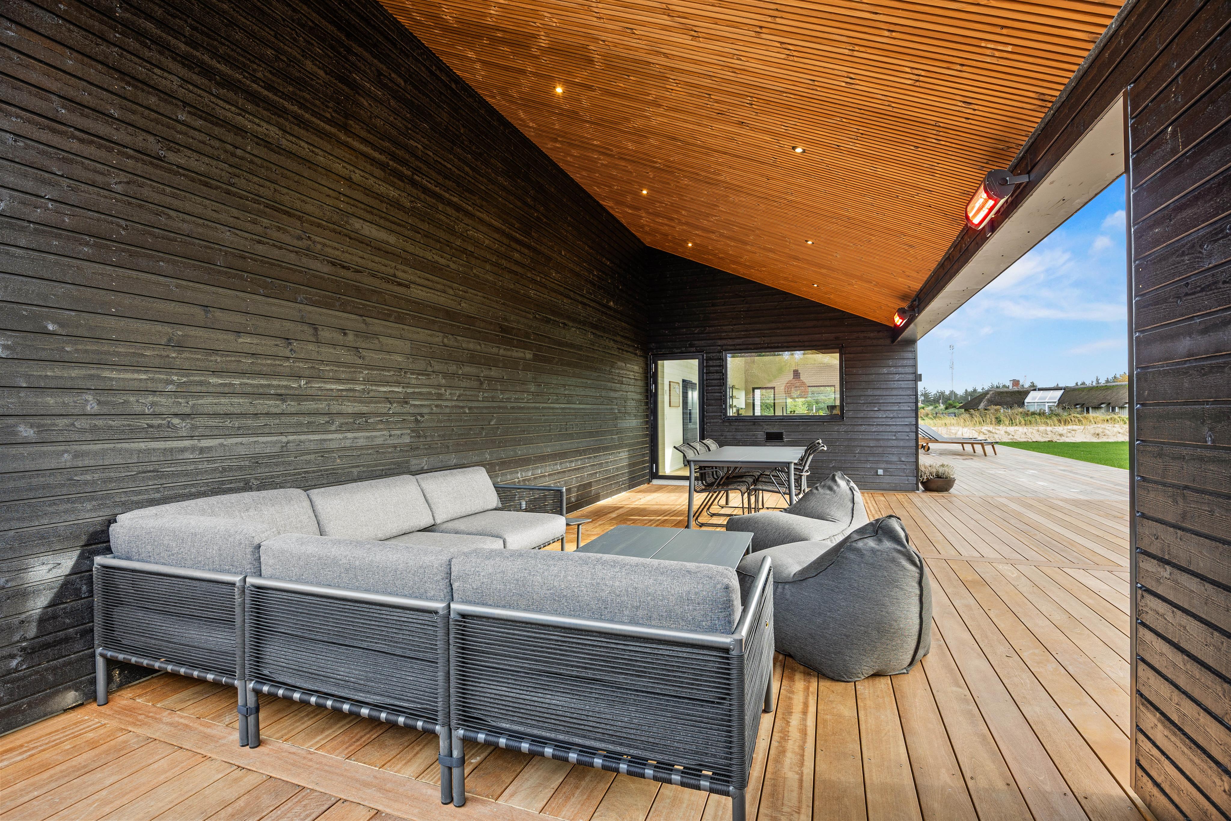 Sommerhuset i Vejers tilbyder en imponerende grund på 1552 m², der stiller et privat udendørsparadis til rådighed for jer. Slap af på den åbne eller overdækkede terrasse på i alt ca. 60 m2, mens børnene leger i den rummelige have. Nyd luksuriøse øjeblikke i et udendørs spabad og oplev ultimativ komfort takket være varmelamper på en af de to overdækkede terrasser. På terrasserne kan I slappe af i komfortable loungemøbler, der indbyder til afslapning.