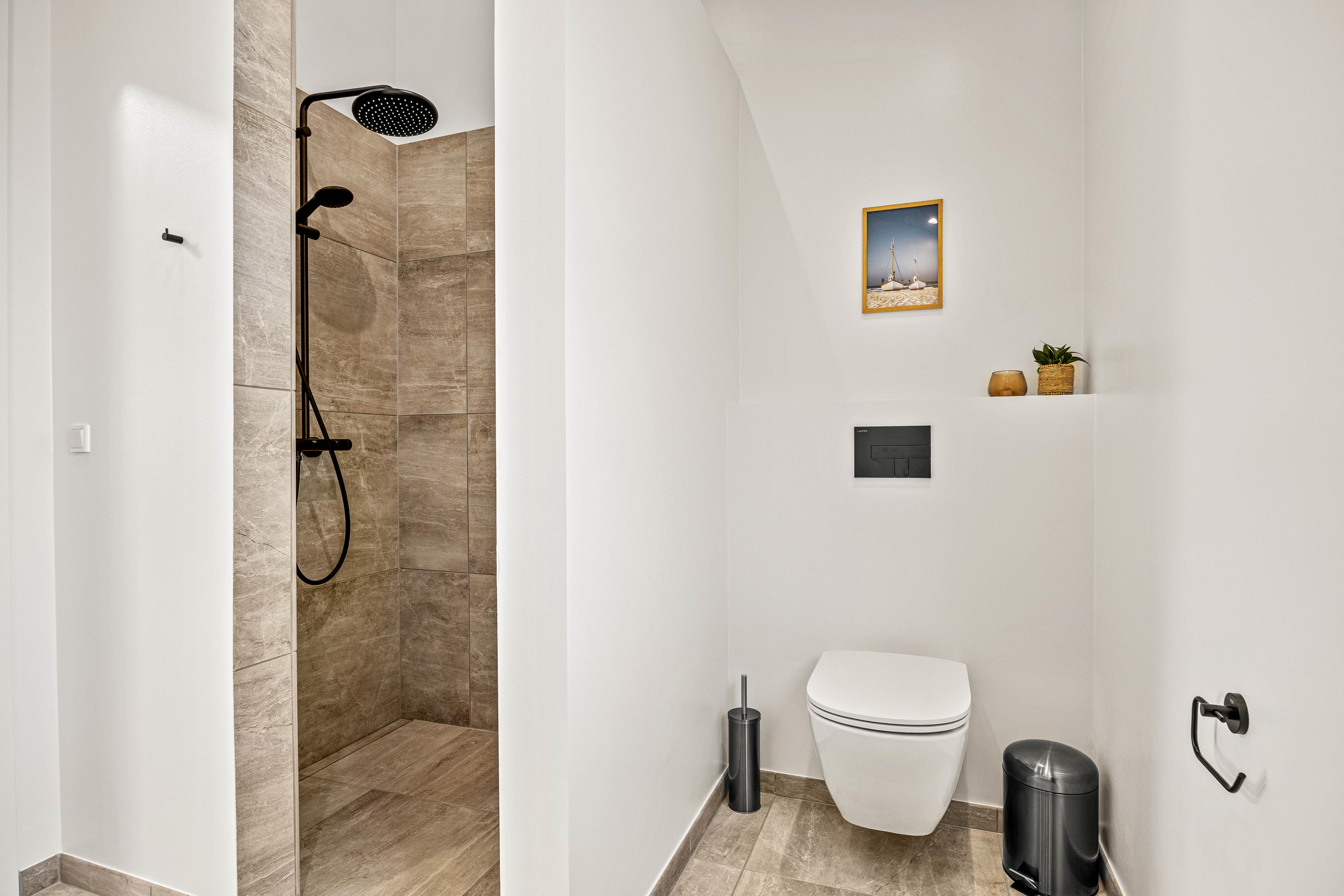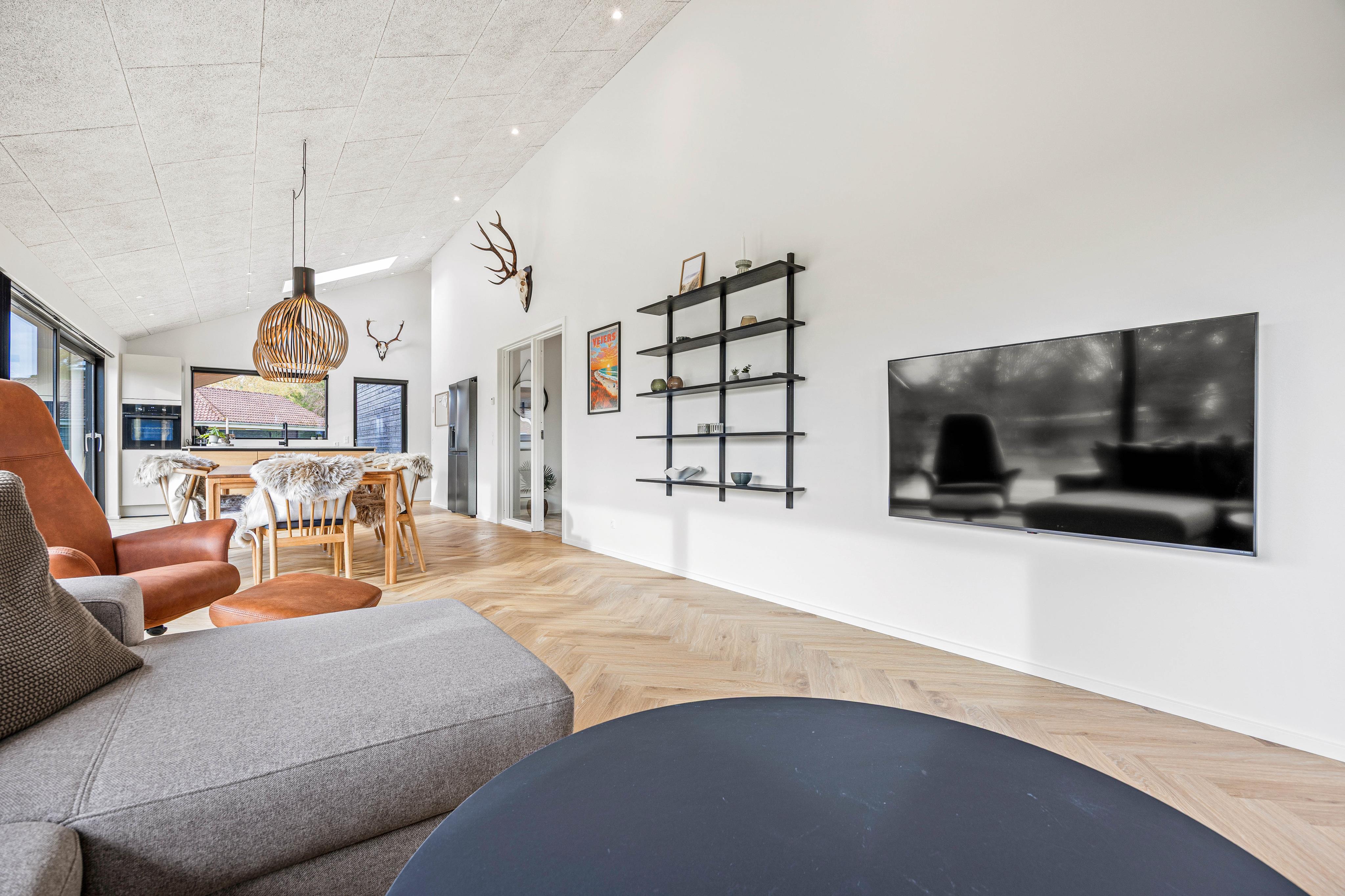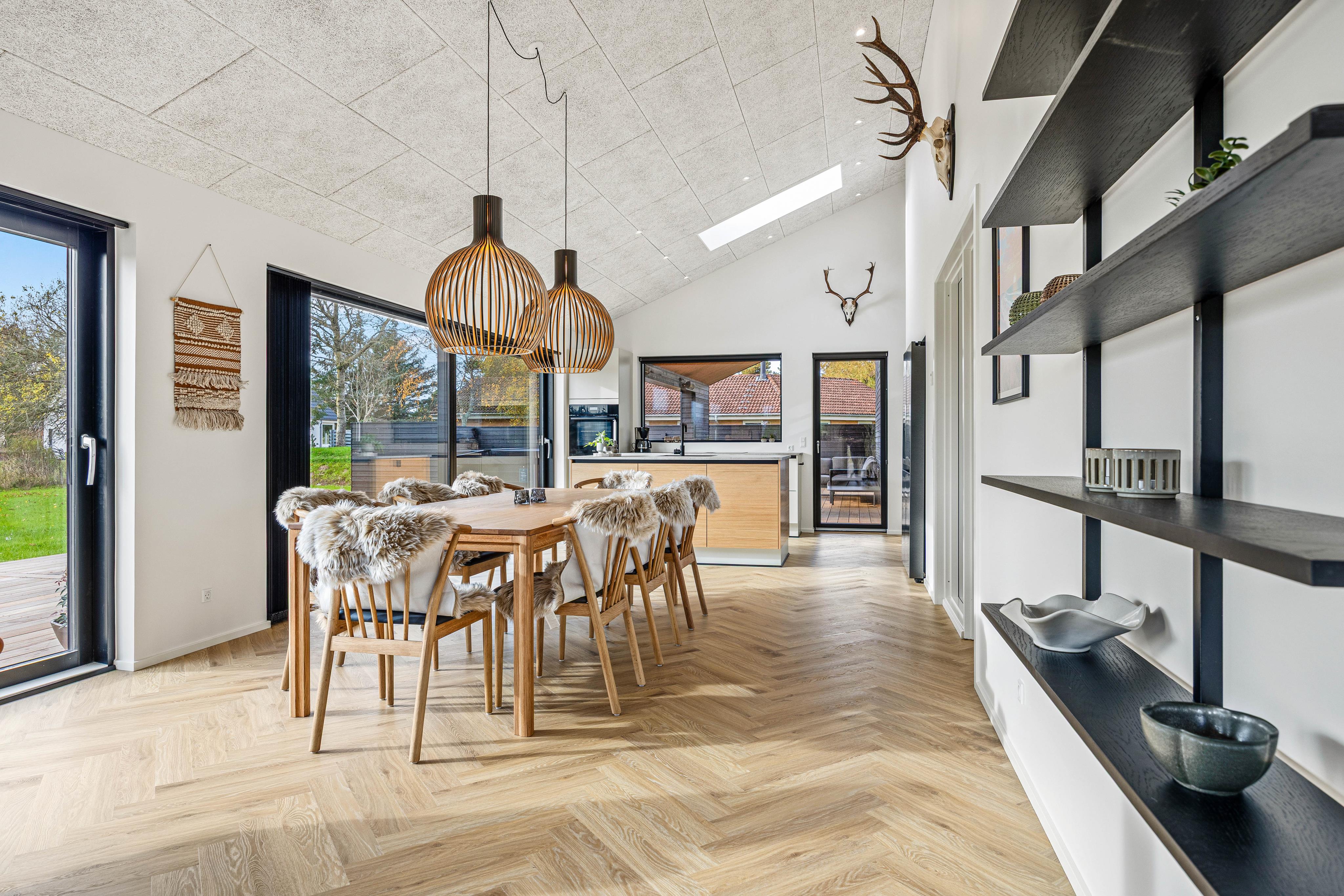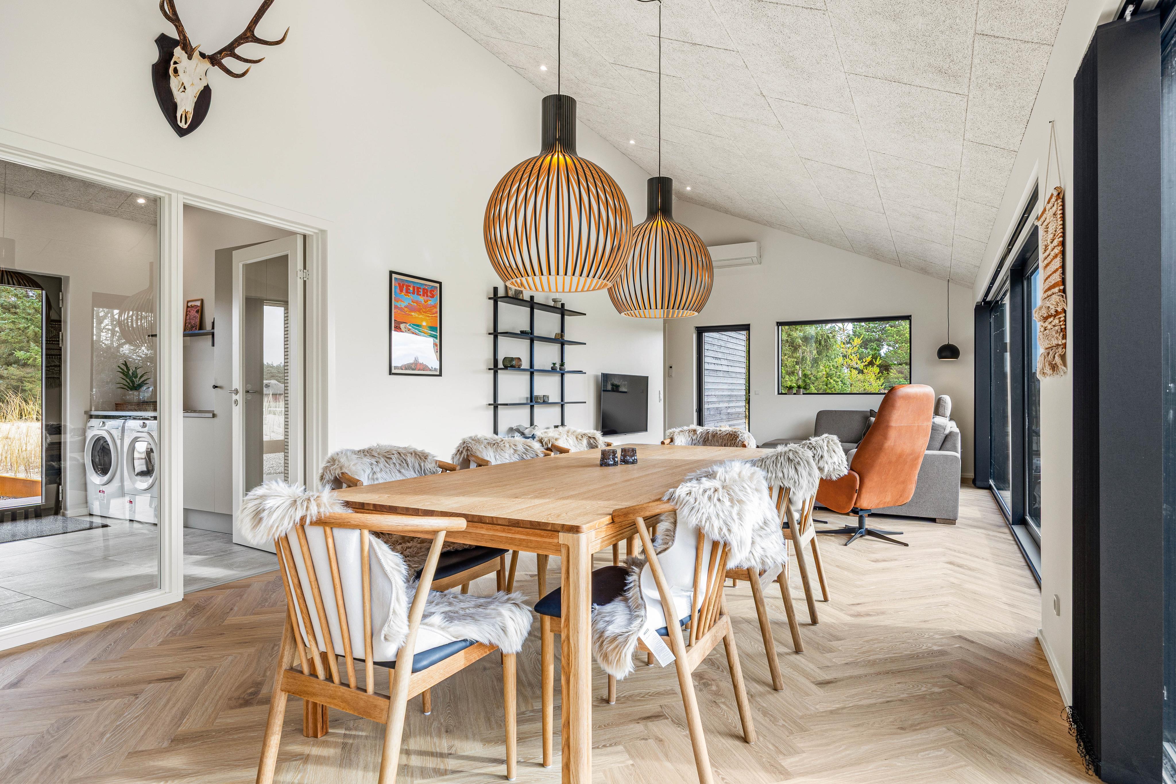 I kan glæde jer til et sommerhus, der kombinerer komfort med bæredygtighed. Udstyret med en moderne luft-vand-varmepumpe, gulvvarme i badeværelserne og en ladeforbindelse til jeres elbil, kan I nyde jeres ferie miljøbevidst. Den lyse opholdsstue åbner sig mod begge terrasser og skaber en harmonisk forbindelse mellem indendørs og udendørs.