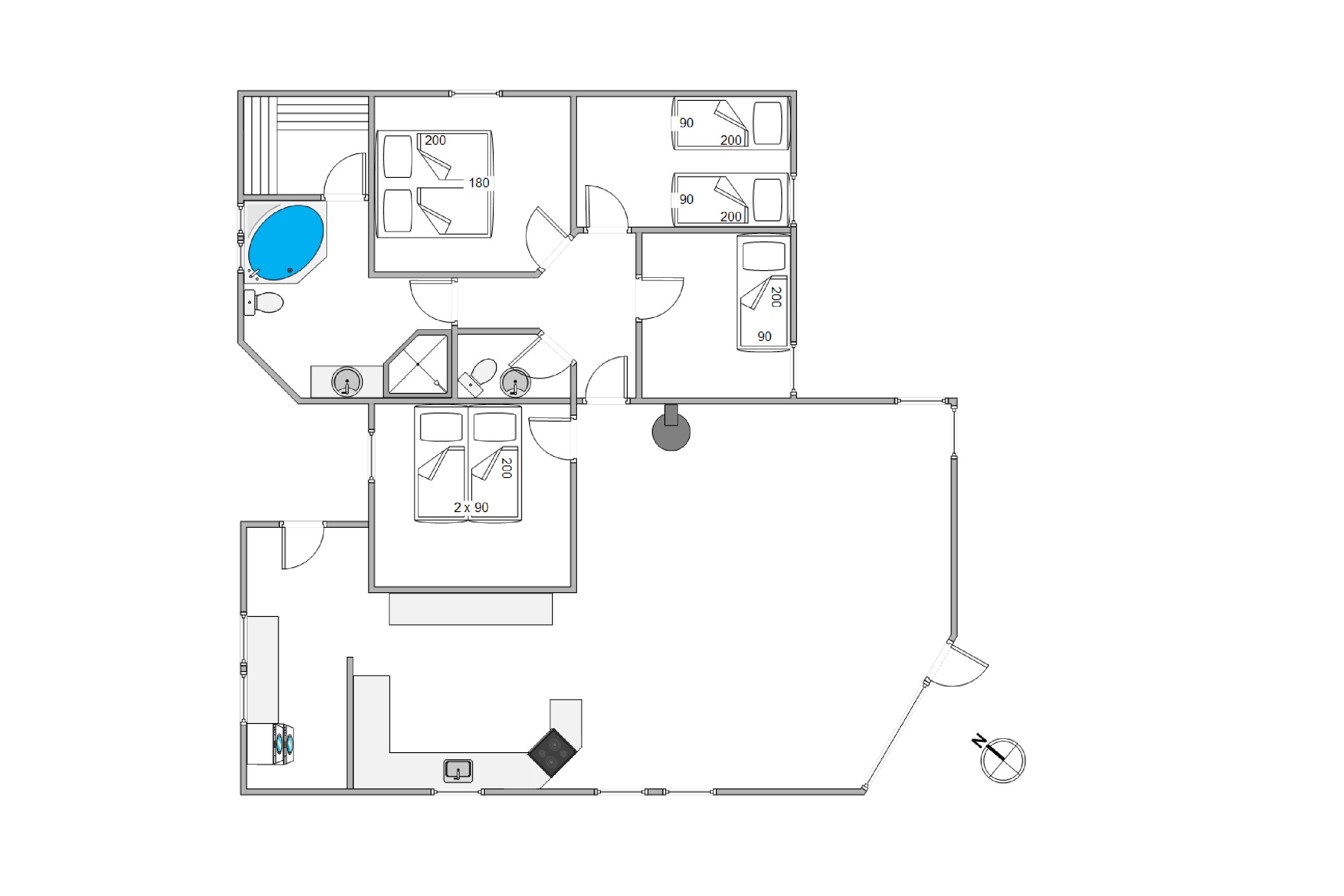 3 gode soverum, 2 af dem med dobbelt-, det sidste med 2 enkeltsenge, lover god uforstyrret nattesøvn. Med både badeværelse og gæste-wc er den gode feriestemning sikret. I baggangen er der, sikkert til stor glæde for især småbørnsfamilier, både vaskemaskine og tørretumbler.