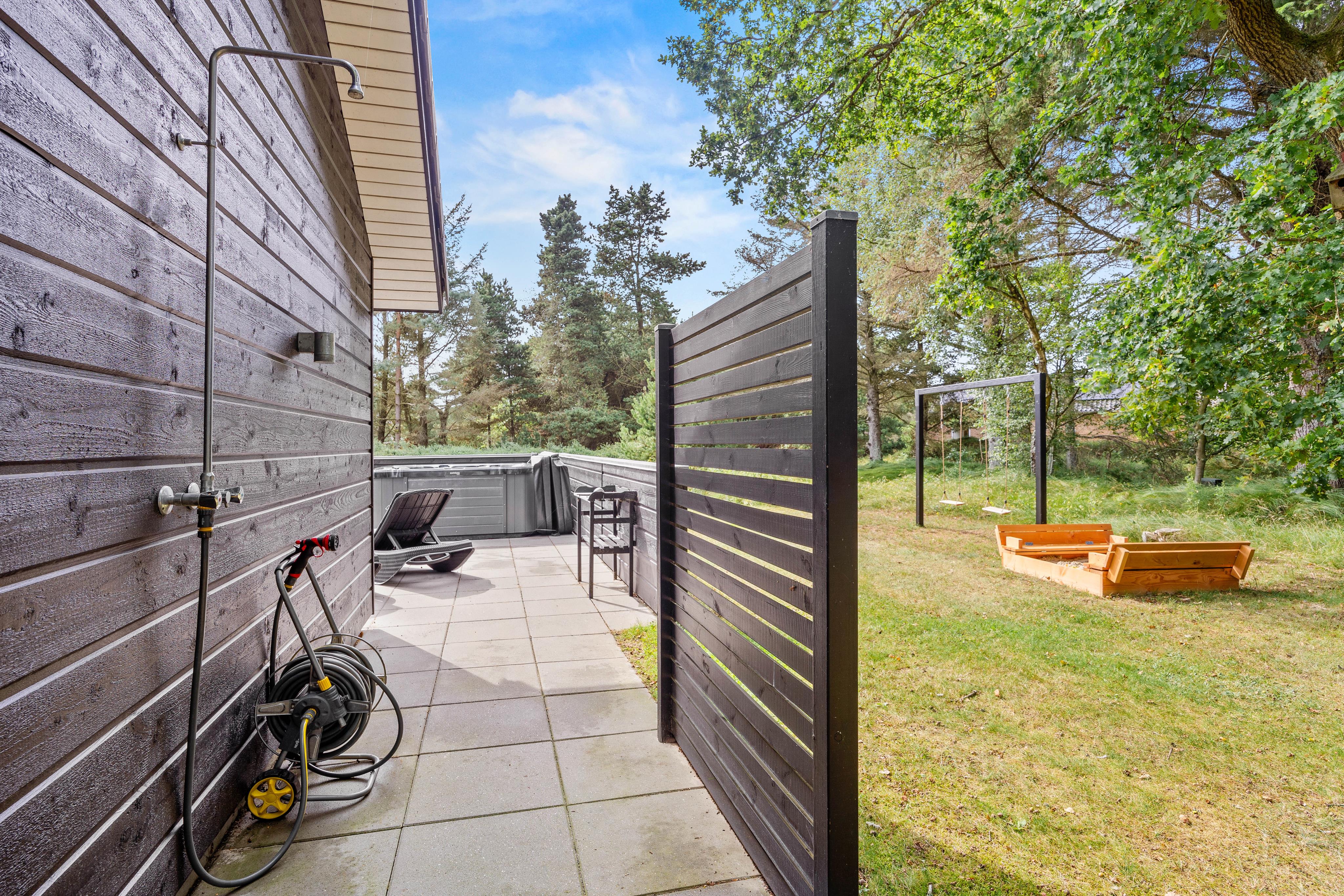 Stor terrasse med udendørs spabad, trampolin, gynge og sandkasse