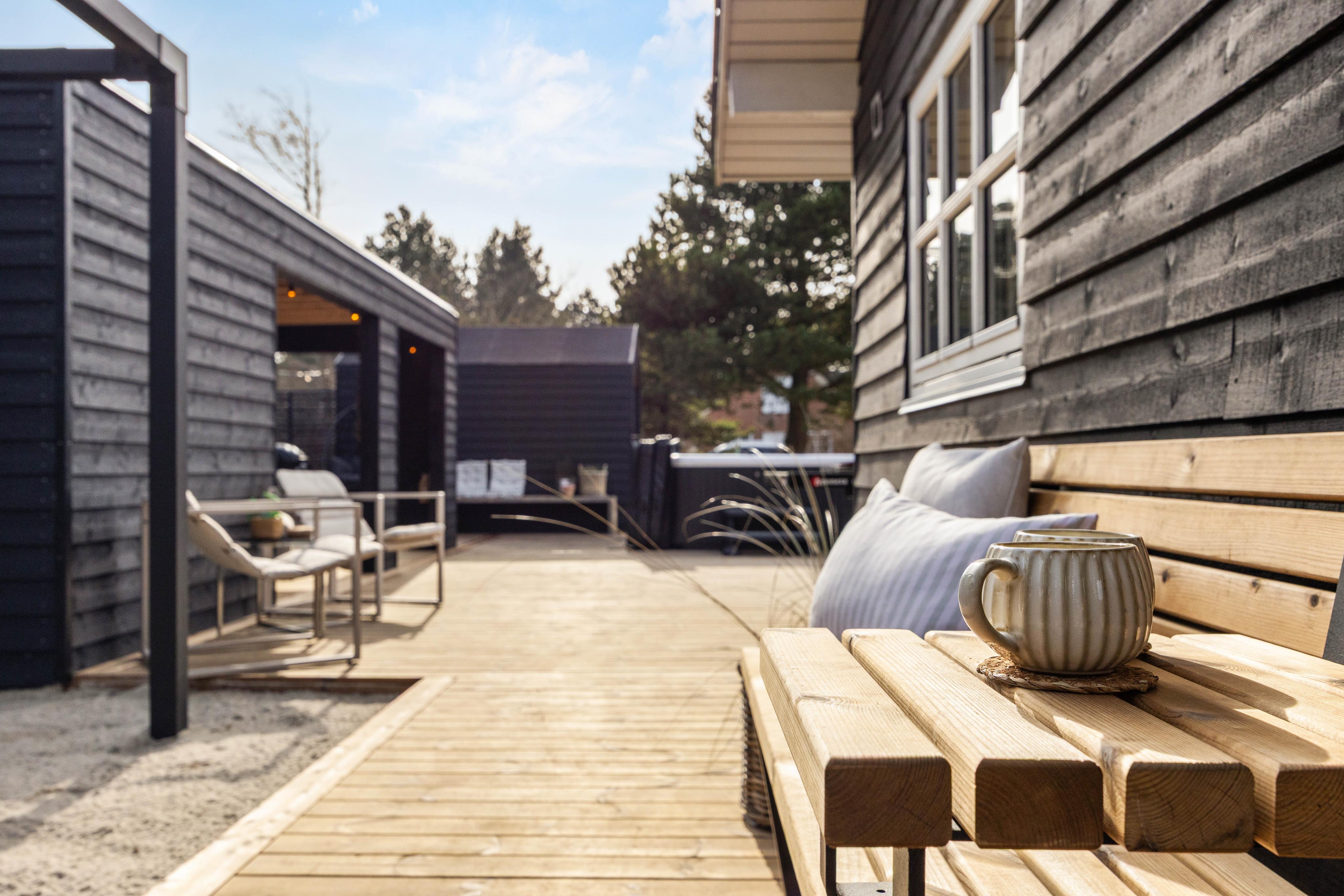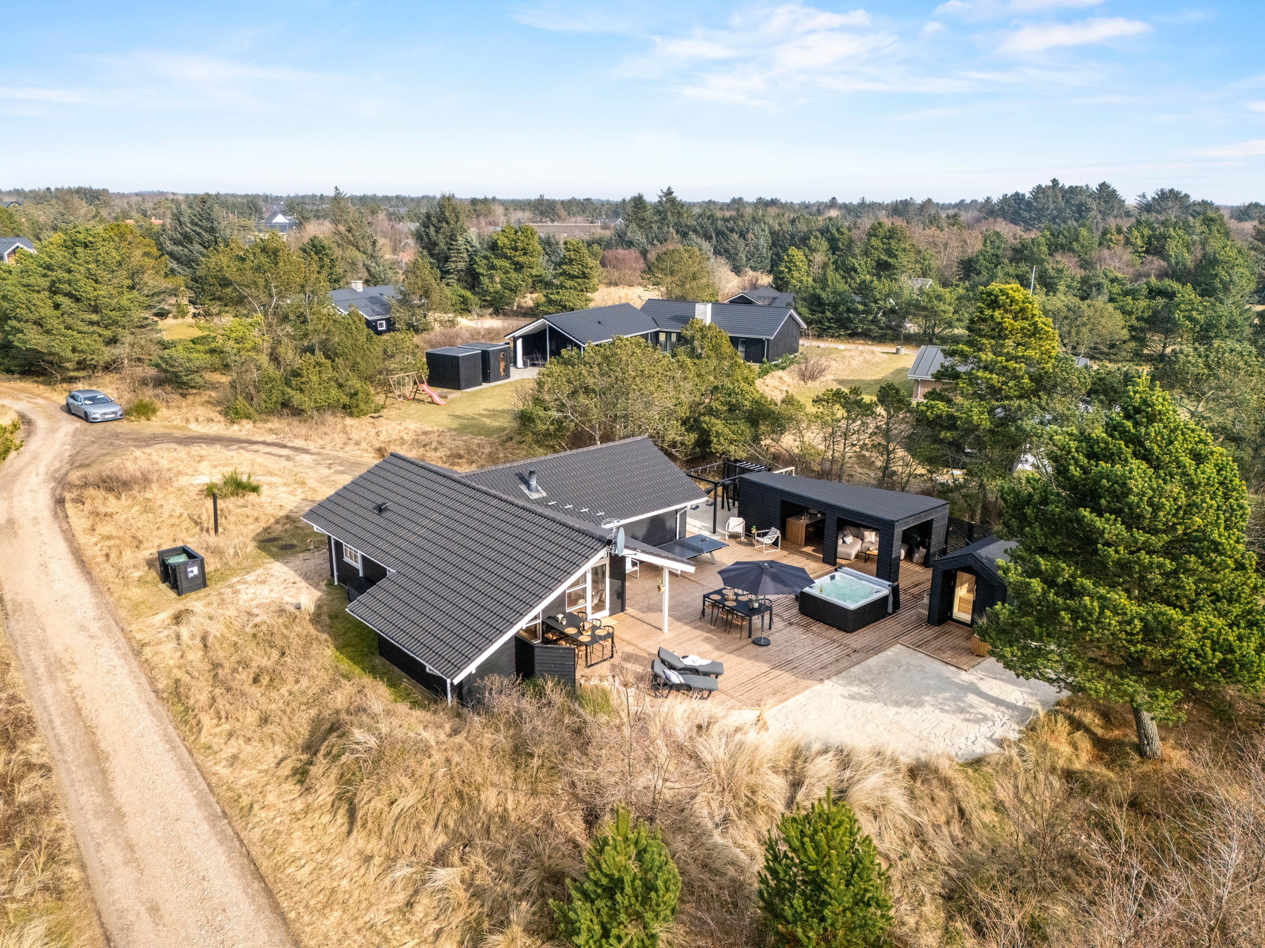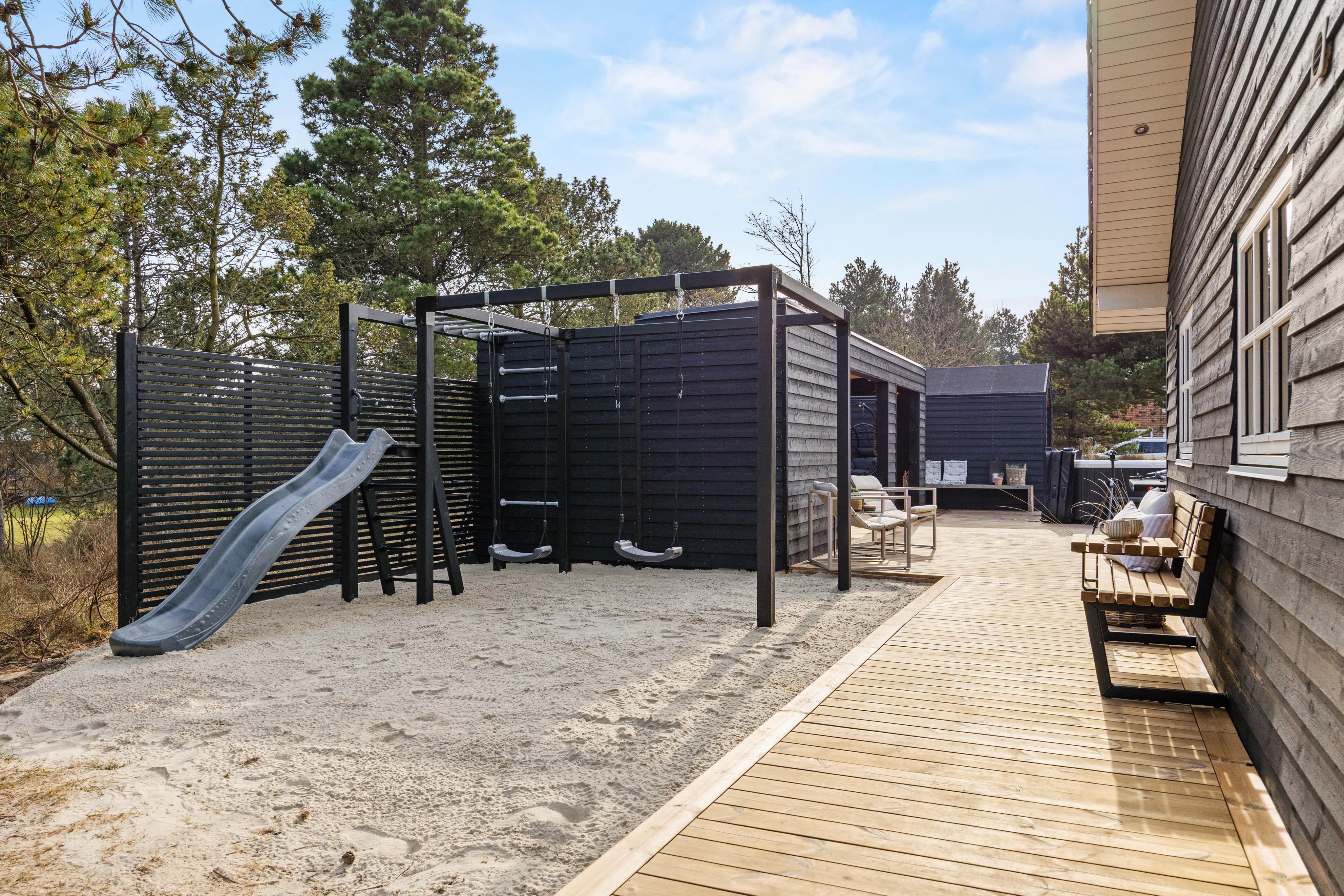 Med udeområdet får I en udespa, en udesauna og udendørs bordtennis at hygge jer med på den 170 m2 store terrasse, og her kan børnene også slå sig løs på legepladsen med sandkassen og gyngen, måske efter en god, fælles gåtur på de fine strande i Blåvand.