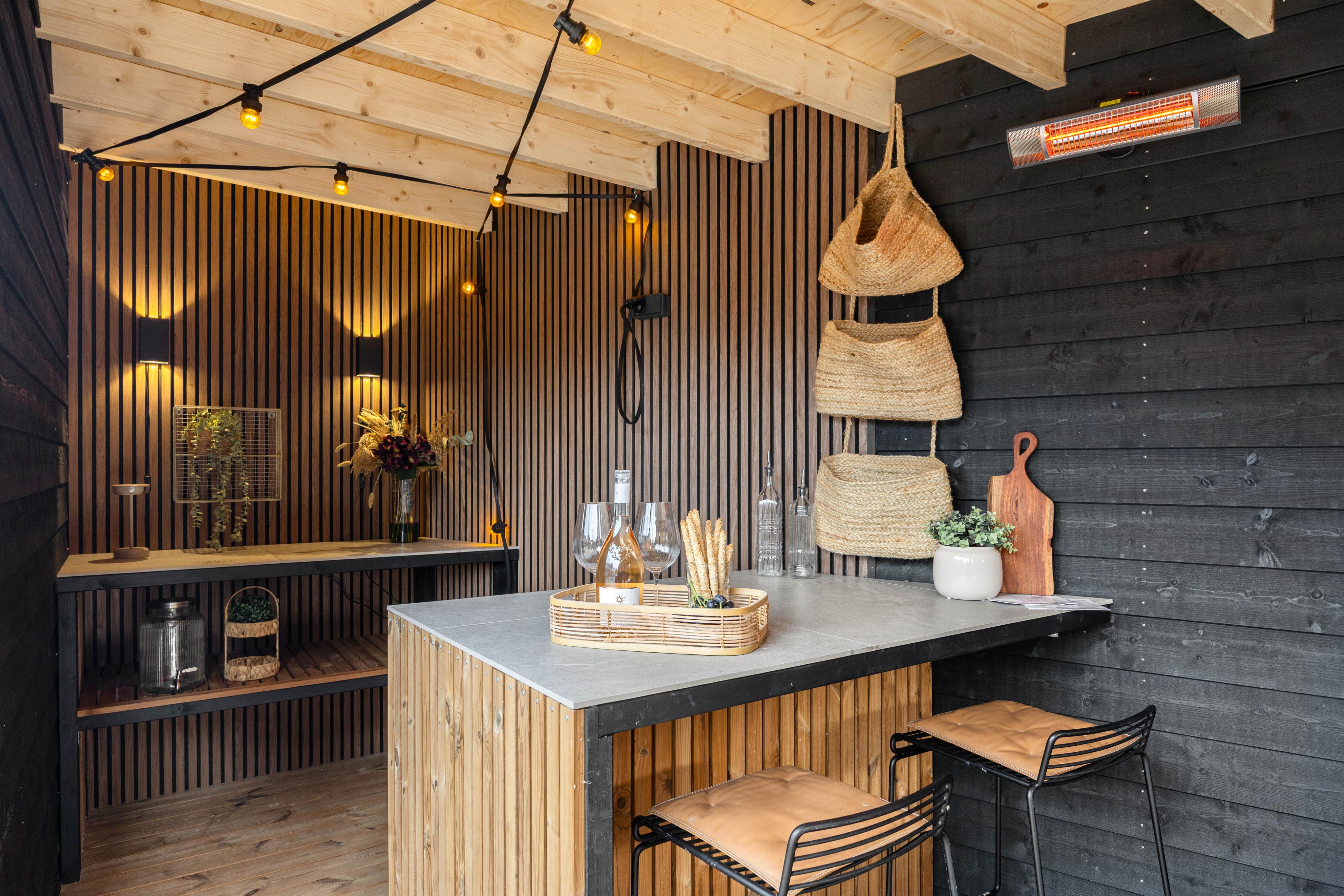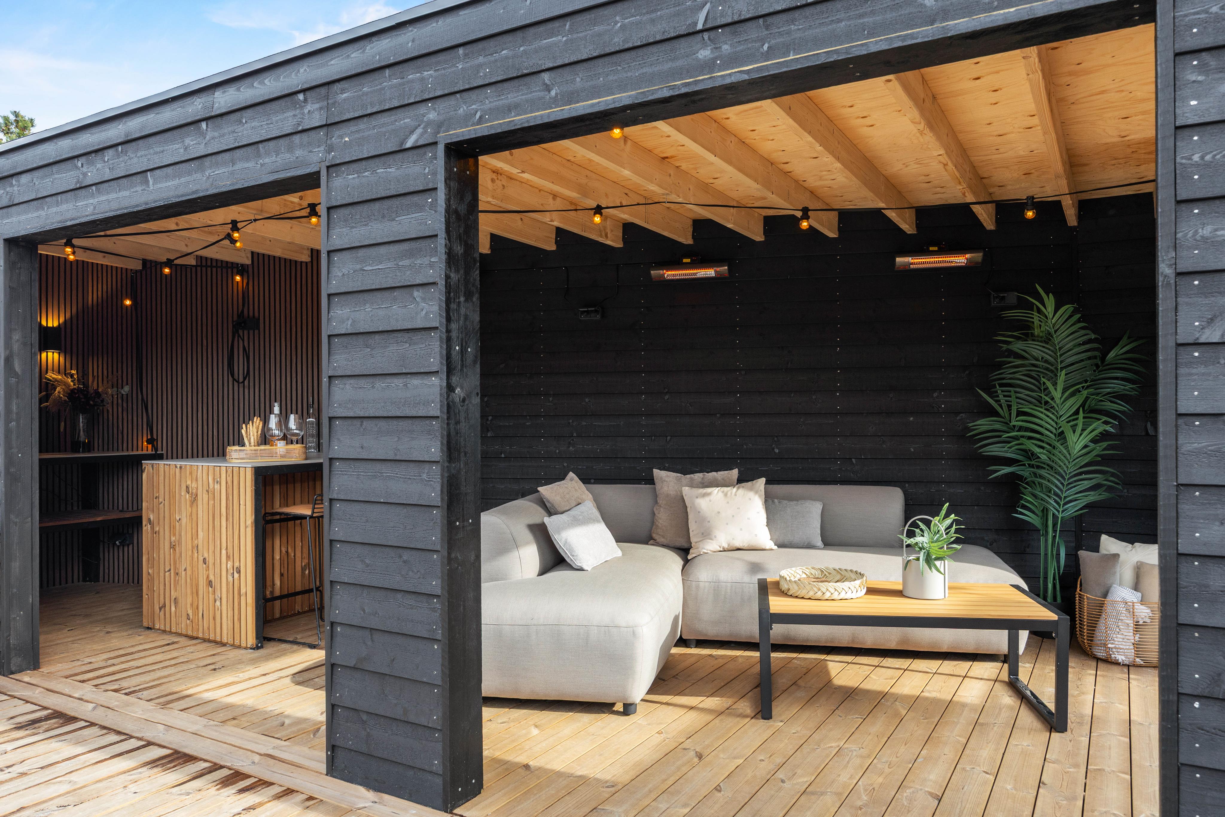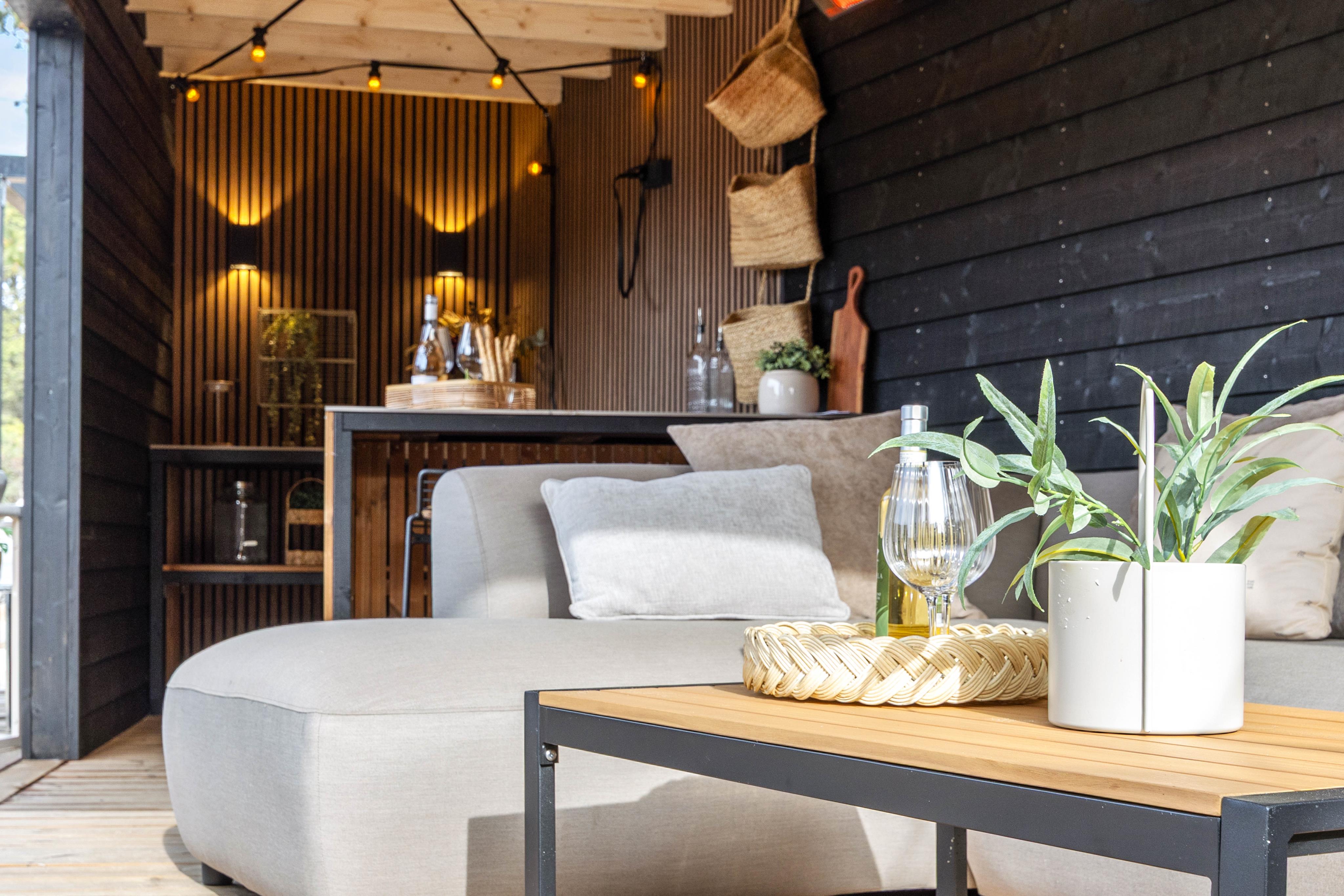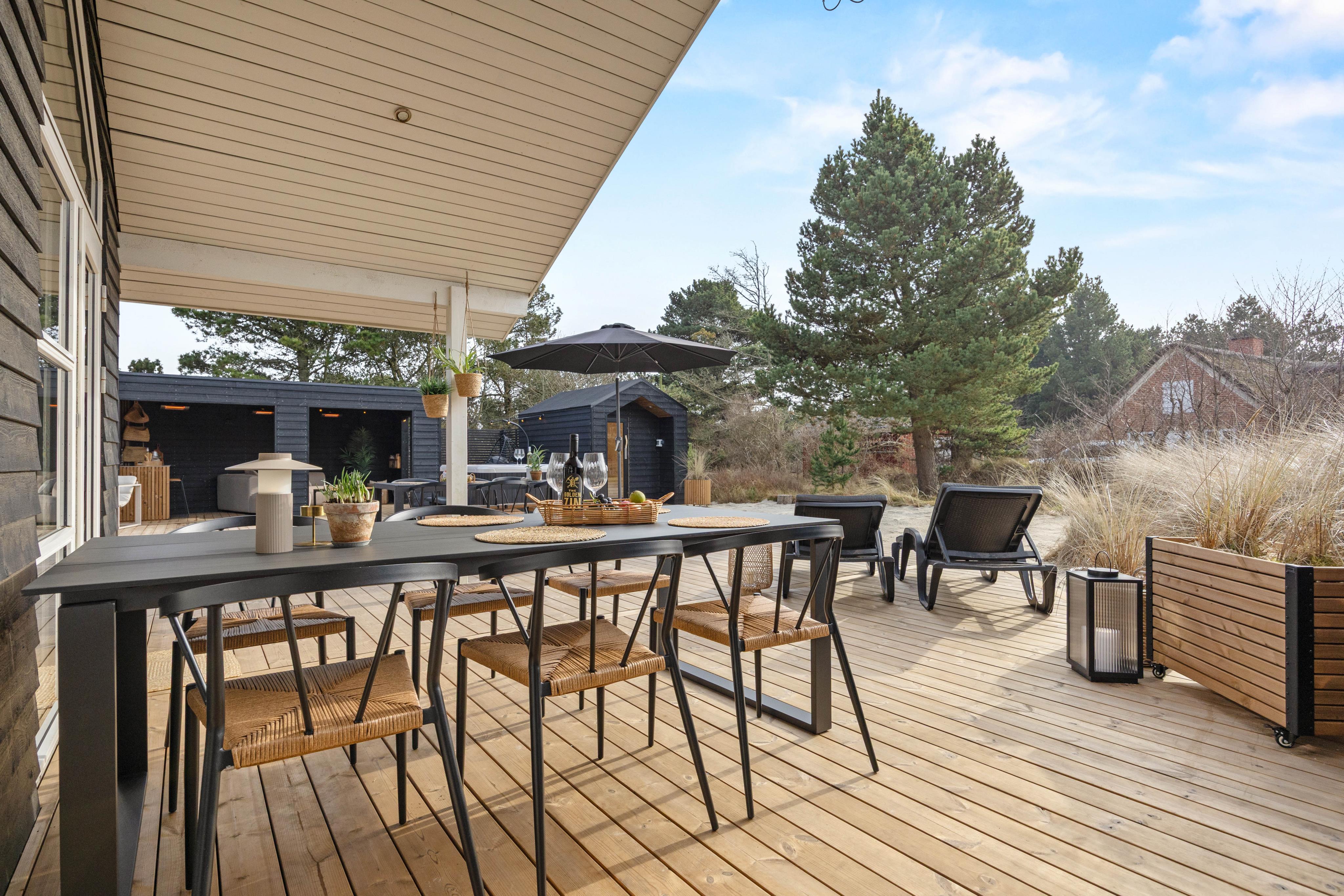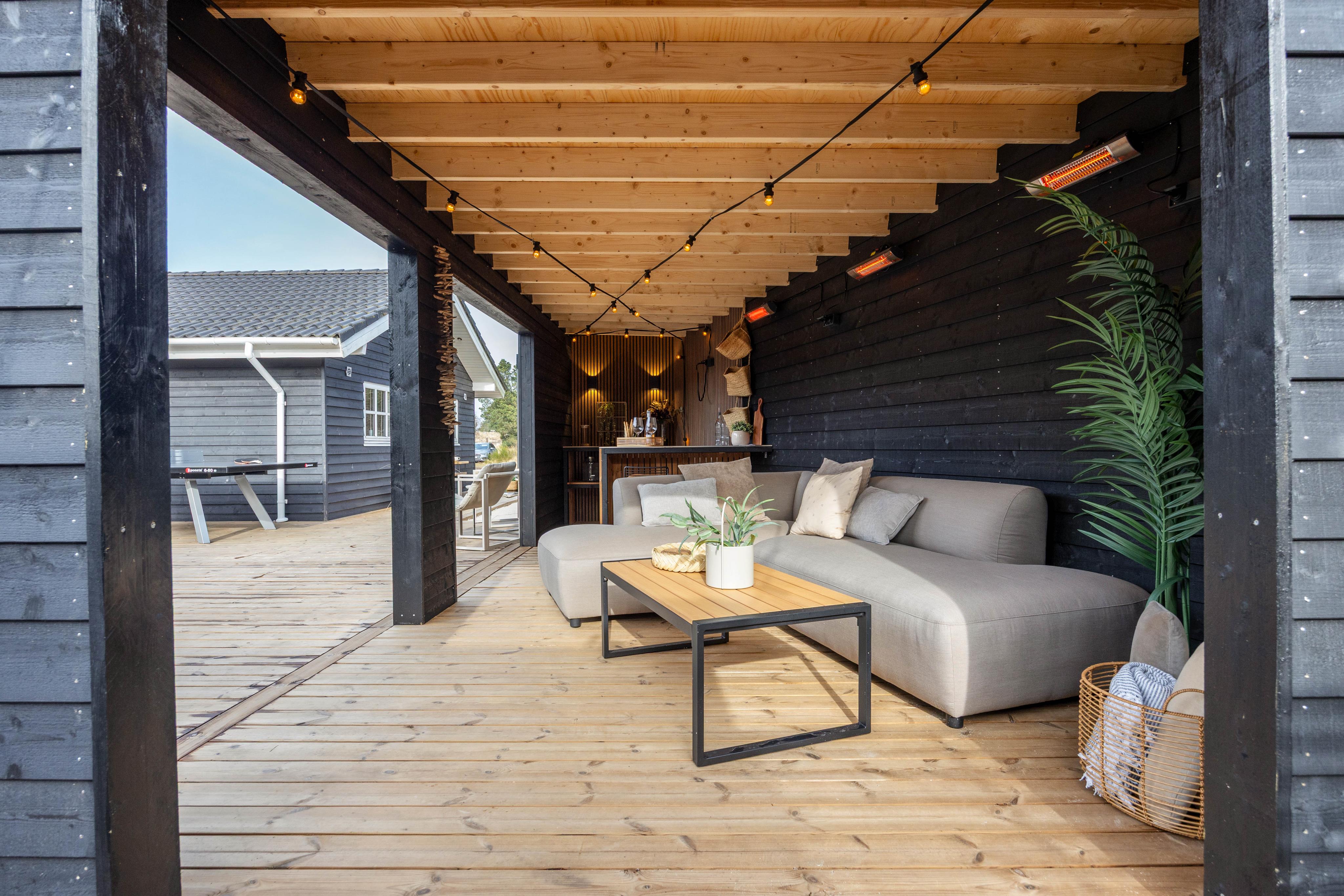 Fra stuen kommer I ud på den store og alsidige terrasse, hvor I også finder det separat beliggende og overdækkede loungeområde med baren og den gode sofa, hvor I kan hygge jer i læ for regn og vind og finde skygge over en kølig drink på solrige dage. Med gasgrillen kan I nemt og hurtigt tilberede aftenens feriemiddag, og på de gode sommeraftener er det oplagt at spise middagen rundt om havebordet i den lune aftensol.