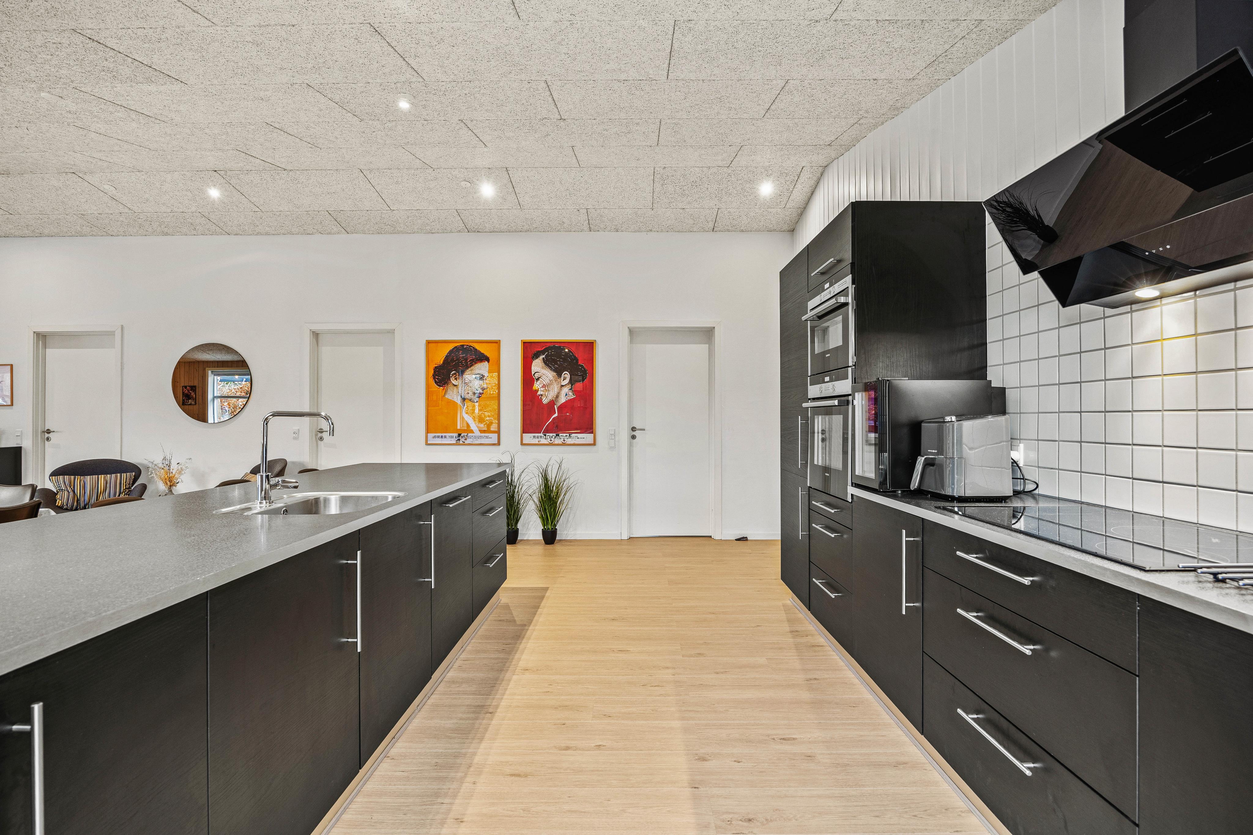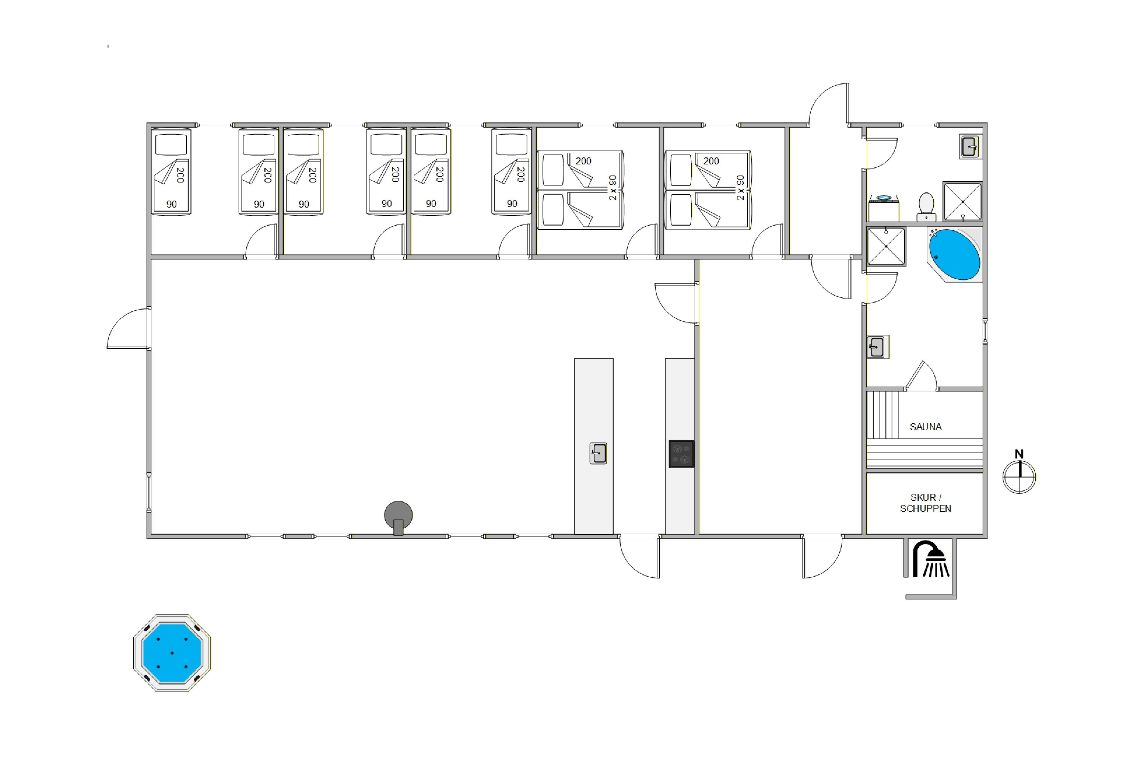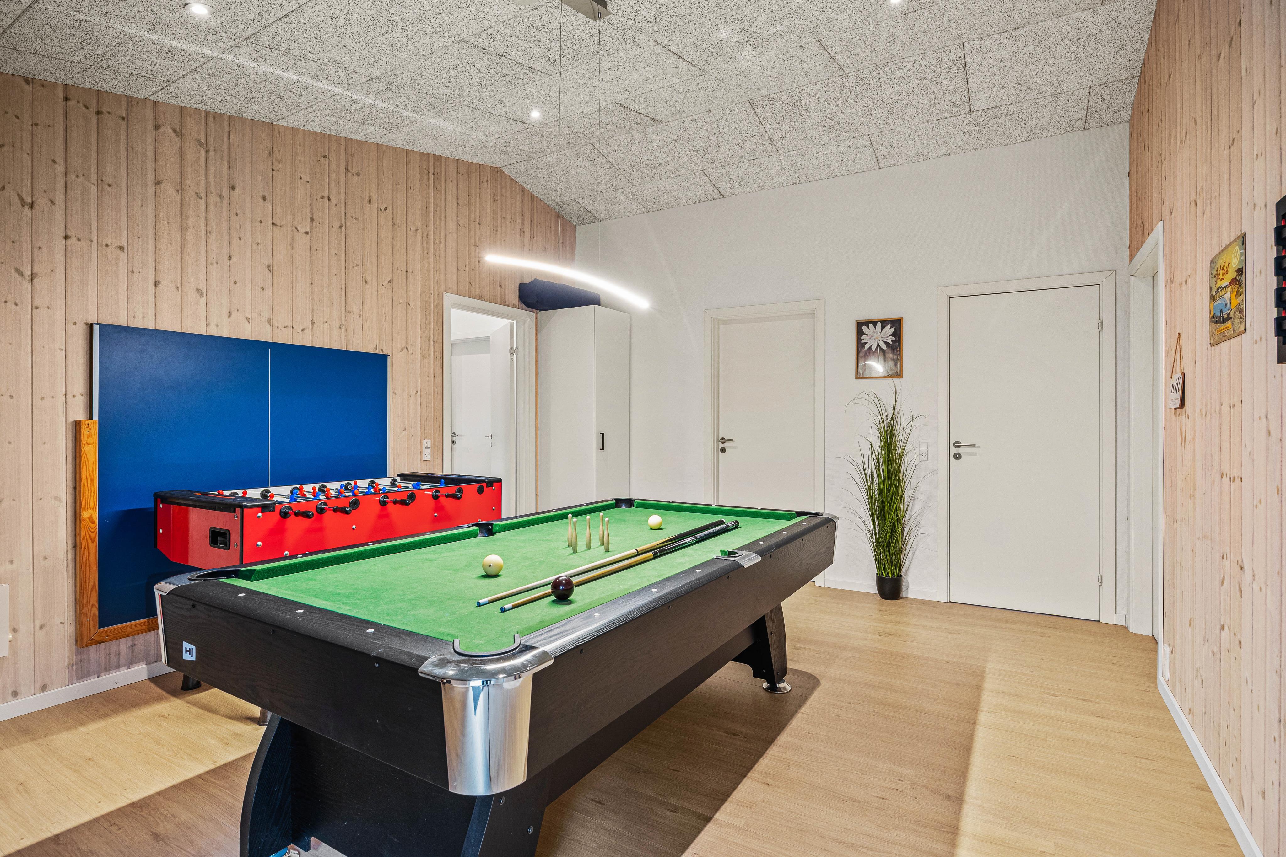 Stort sommerhus med 5 soveværelser, 2 badeværelser og en whirlpool. Køkkenet er rummeligt udstyret og indeholder alt, hvad man har brug for til at lave mad og leve. Spillerummet er godt udstyret fra PlayStation til bordfodbold.