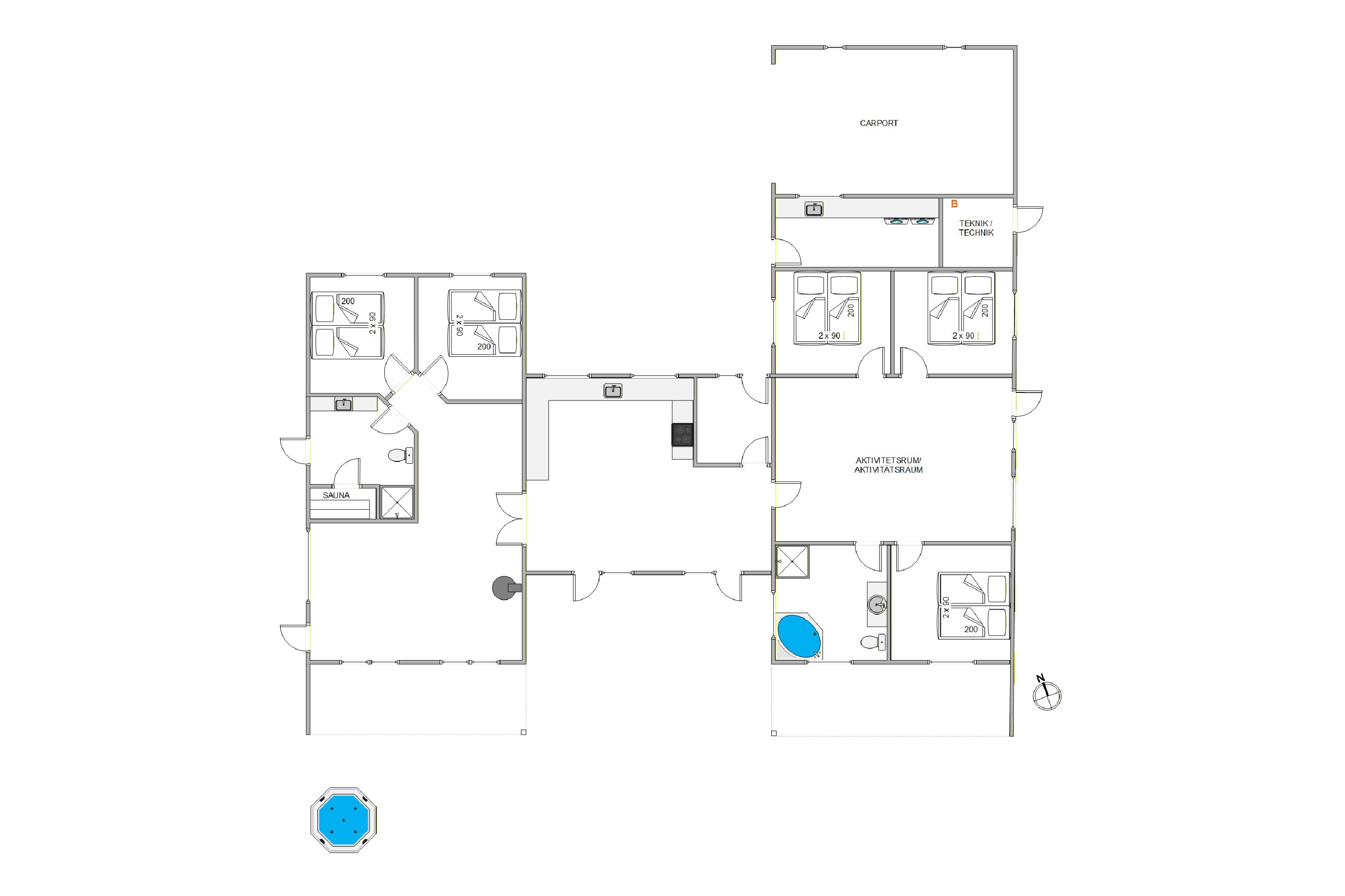 Fantastisk og moderne feriehus. Det rummelige opholds- og spiseområde inviterer til at slappe af. I aktivitetens rum kan man ind imellem tage en omgang bordtennis eller billard. Udendørs spabadet giver selv på kolde dage afslapning i det varme vand.