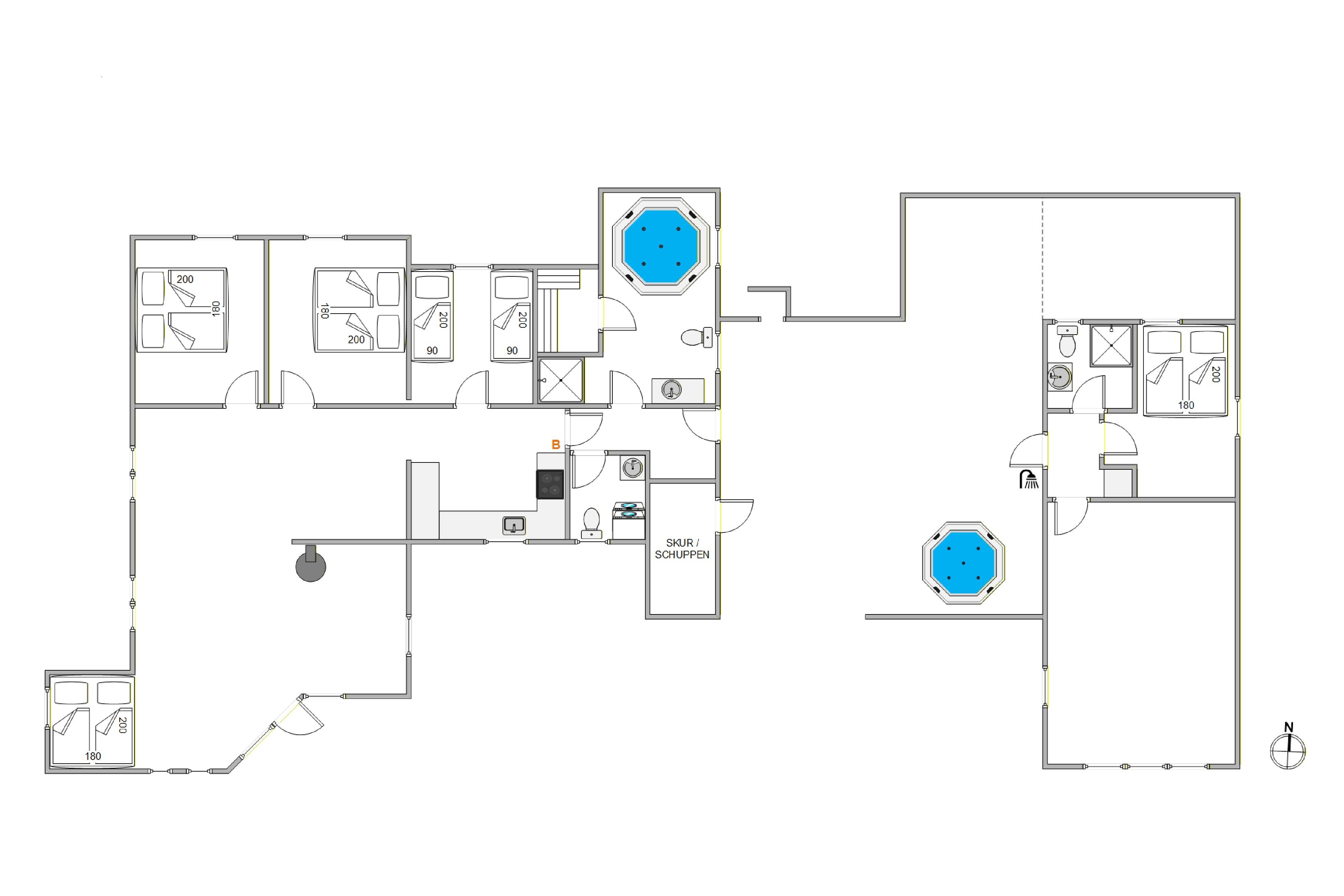 Der er 2 badeværelser med gulvvarme og et gæstetoilet til rådighed for jer, så I behøver ikke at stå i kø til tandbørstningen, og i forbindelse med det ene badeværelse er også spa og sauna, så I kan arrangere jeres egen private wellnessaften. I de 4 soveværelser med komfortable dobbeltsenge kan I hvile rigtig godt ud i den friske vesterhavsluft - det ene ligger i et anneks med aktivitetsrum og eget toilet og bad.