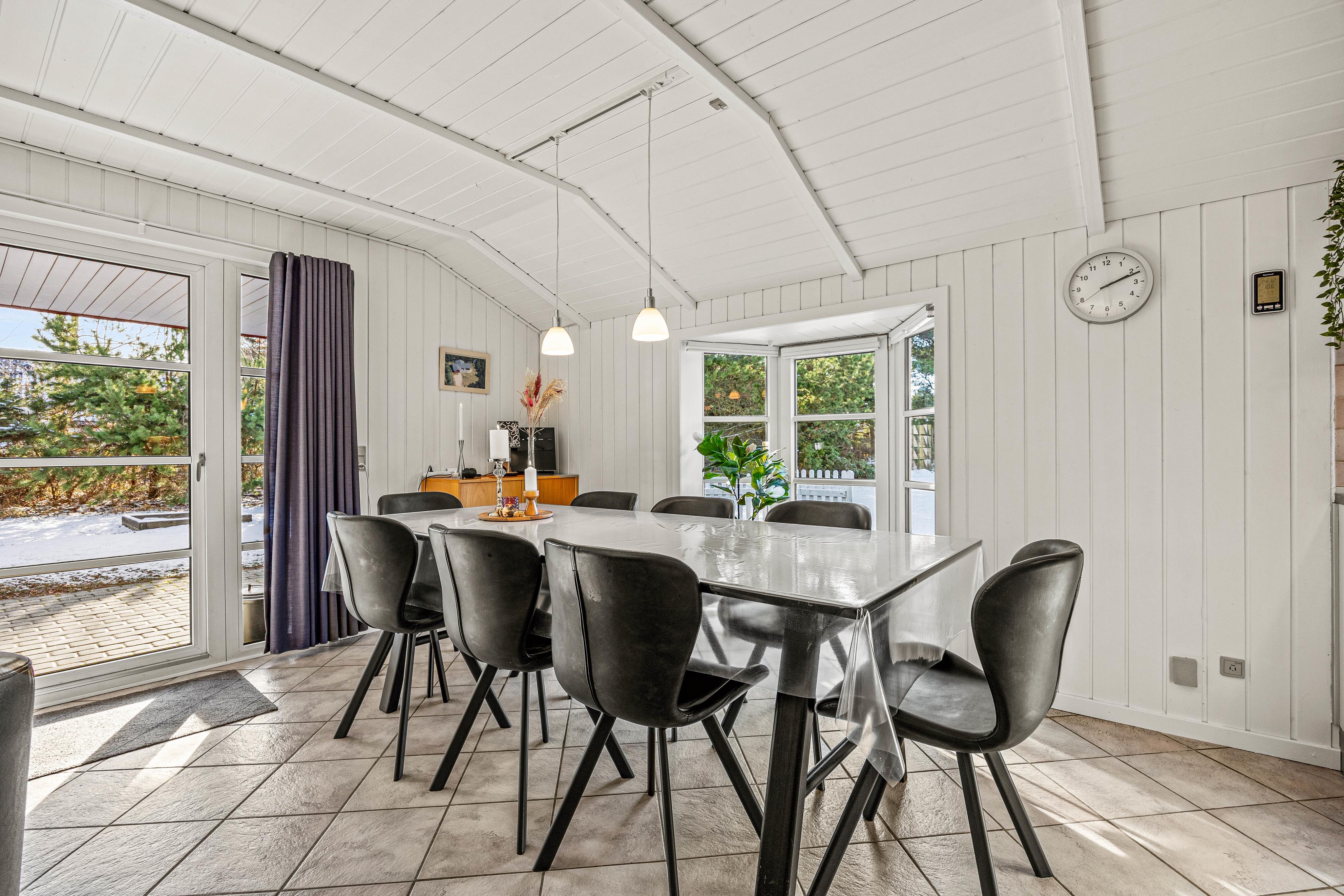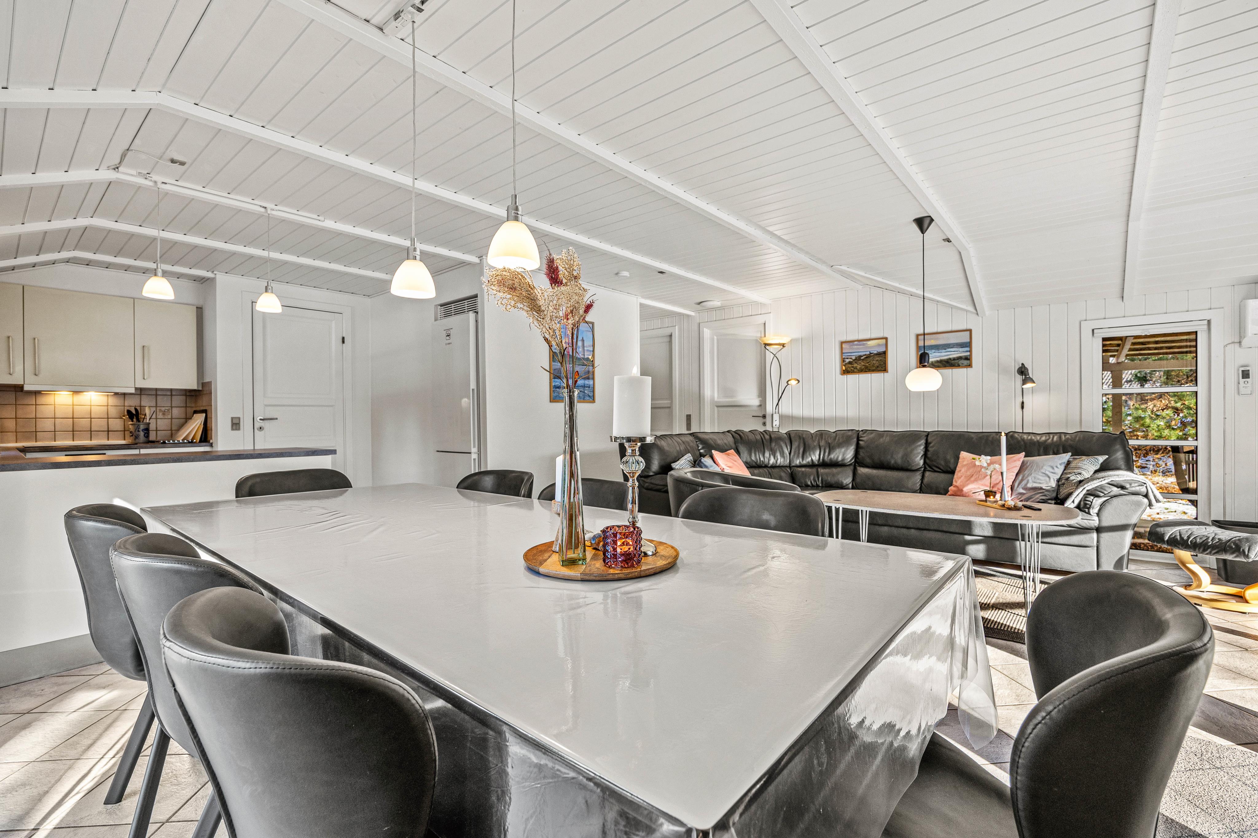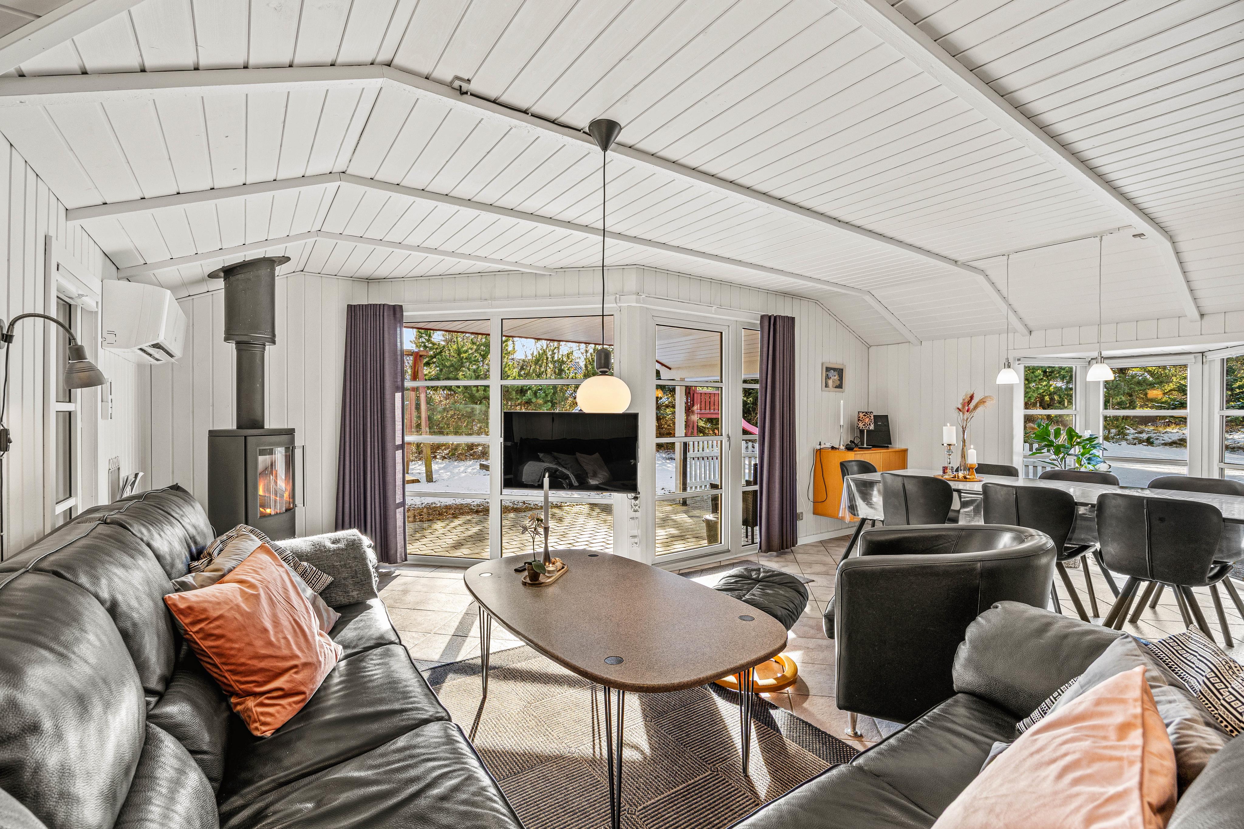 Den store sorte læderhjørnesofa ved brændeovnen lokker til fælles hygge efter dagens aktiviteter eller en hyggelig regnvejrseftermiddag med kakao og boller. Husk også at benytte feriehusets energivenlige varmepumpe, så I altid har et behageligt indeklima.