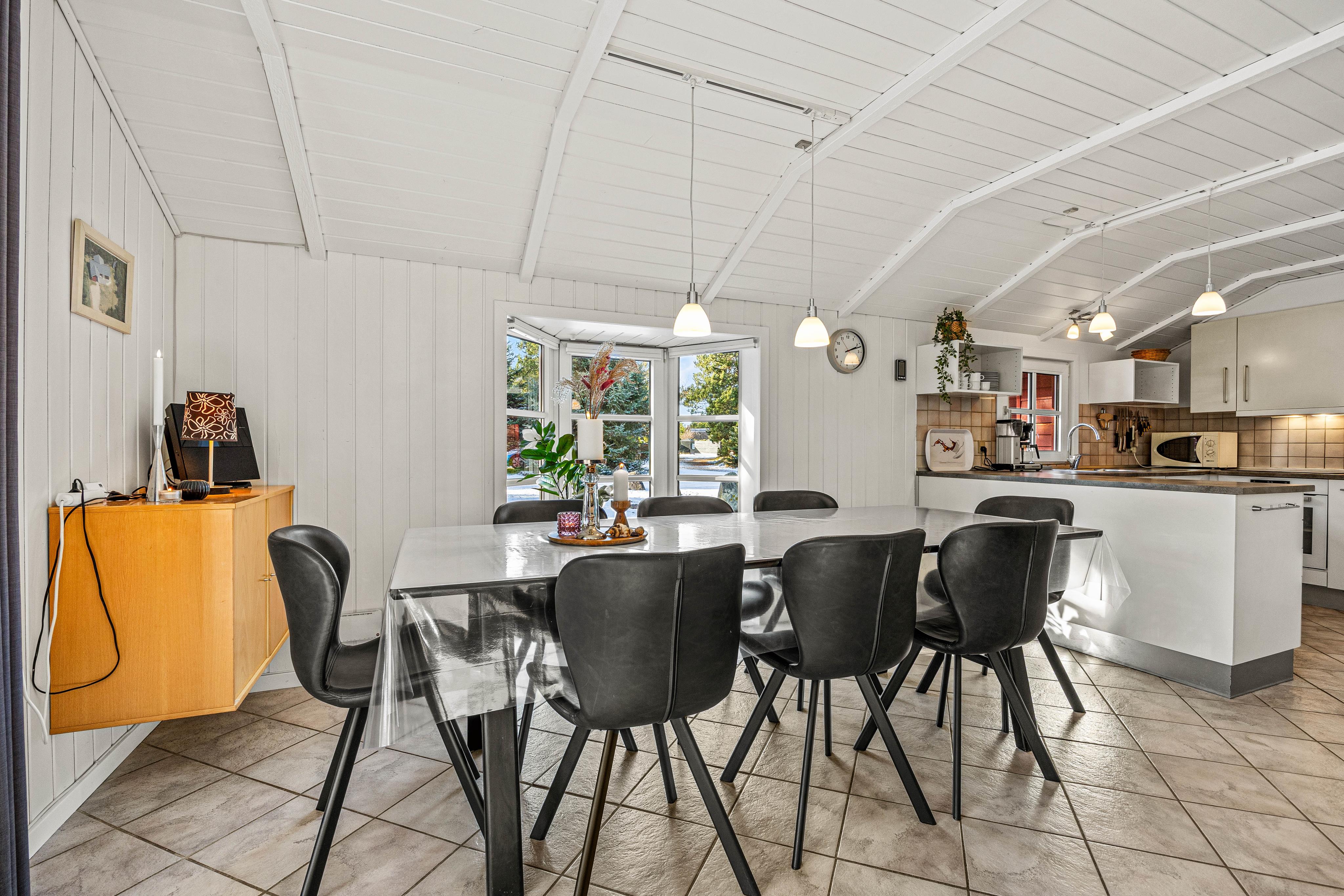 Fra den store indkørsel er der adgang til huset gennem den rummelige entré, hvor der god plads til sko eller støvler og overtøj. Ved siden af ligger feriehusets lyse og veludstyrede køkken, der rummer både opvaskemaskine, mikroovn og induktionskogeplade med ovn. Det dejlige åbne køkken giver mulighed for, at også kokken og køkkenhjælperen kan følge med i samtalen eller spillets gang på spisebordet.
