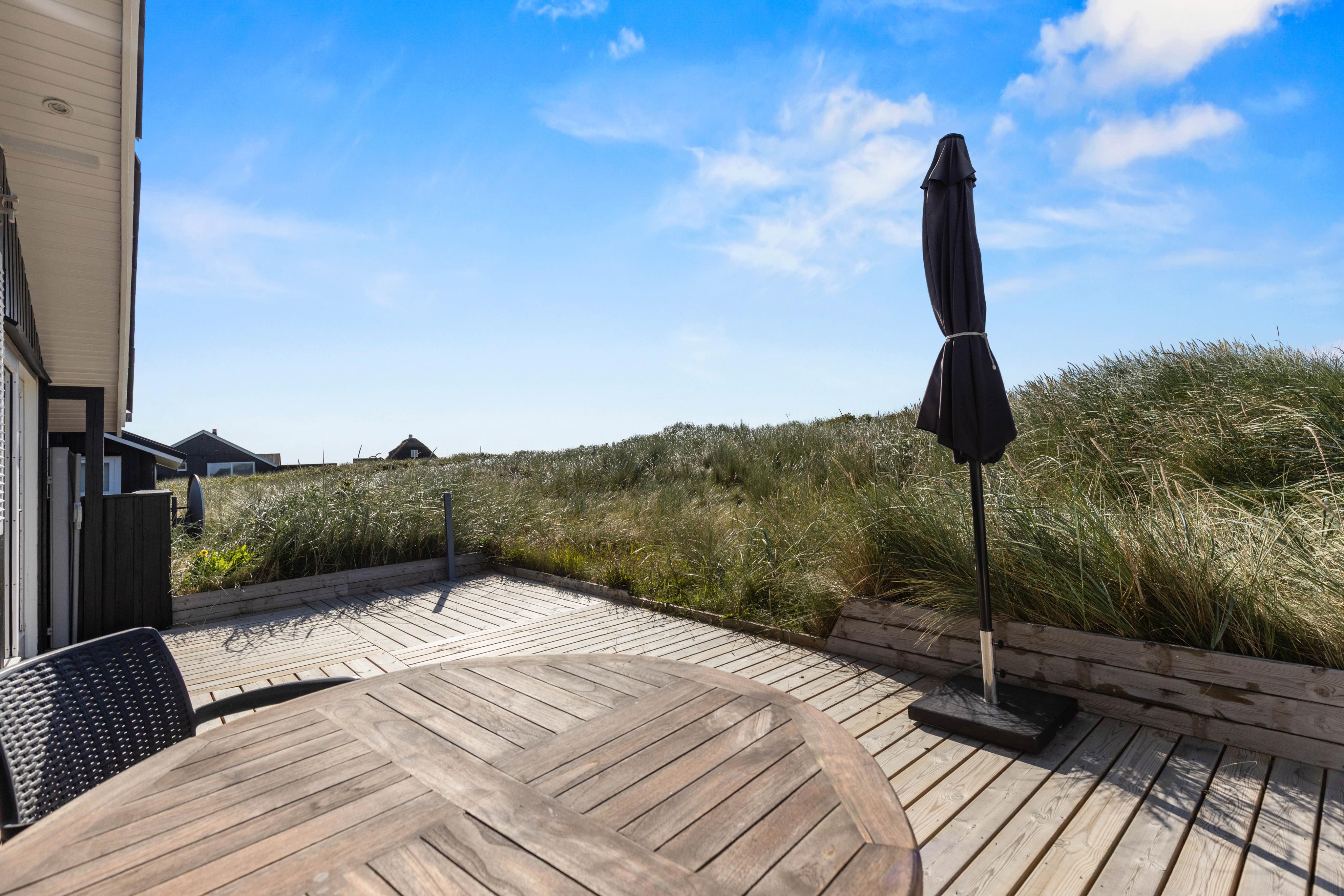 Med en beliggenhed kun 10 meter fra stranden, kan I nyde den friske havluft direkte på terrassen. Terrassen er delvist afskærmet, og havemøblerne står klar til jer - her kan I nyde den smukke natur, den friske luft og ikke mindst de hyggelige grillaftner! Nyd et dejligt måltid og se den maleriske solnedgang.