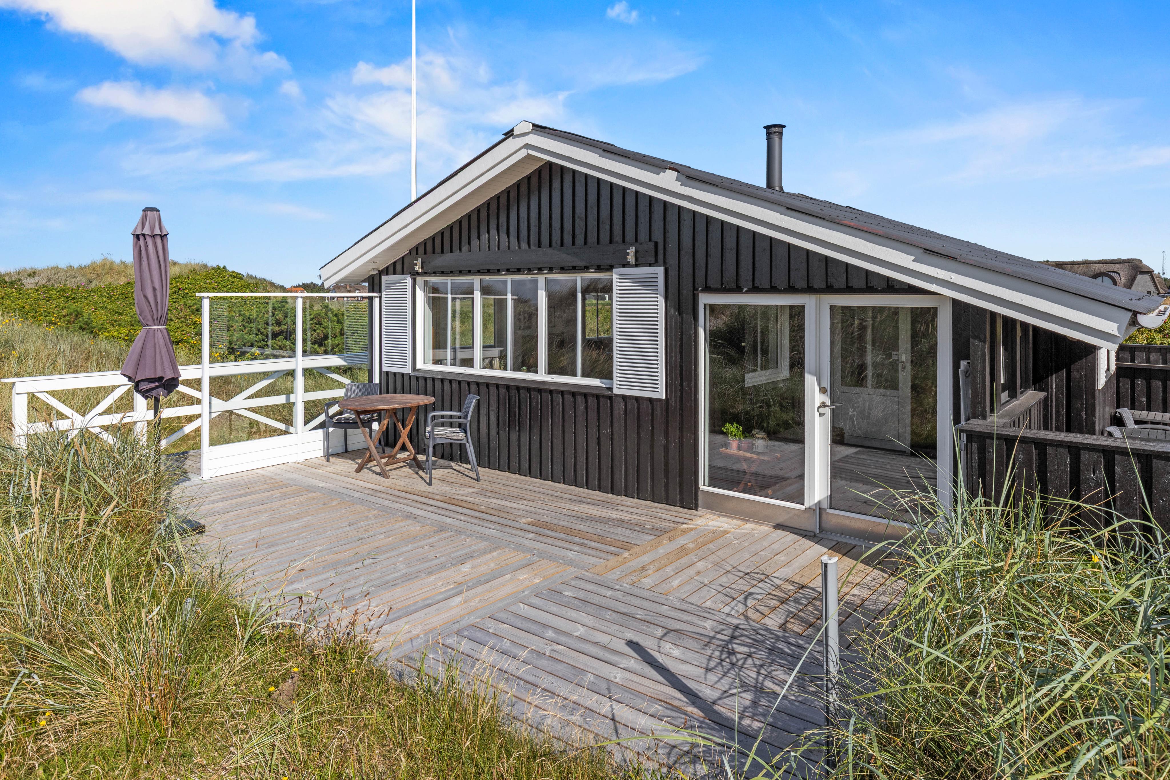 Feriehuset er lille men helt tilstrækkeligt til 3 personer. Hvis nogen går op i farver, er det desværre ikke længere blåt som på billederne, men sortmalet. Beliggenheden er fantastisk, 10 m over klitten med uhindret udsigt til stranden, fyret og alle bunkerne med hestene. Solnedgangene var vidunderlige at se på. Den eneste, men gennem beskrivelsen kendte ulempe, er, at det er et rygervenligt hus, og det kan man meget tydeligt mærke. Det er dybt i materialet, og udluftning eller duftspray hjælper kun i begrænset omfang, men man vænner sig til det! Alt i alt, meget god værdi for pengene, uovertruffen beliggenhed, smuk omgivelser.