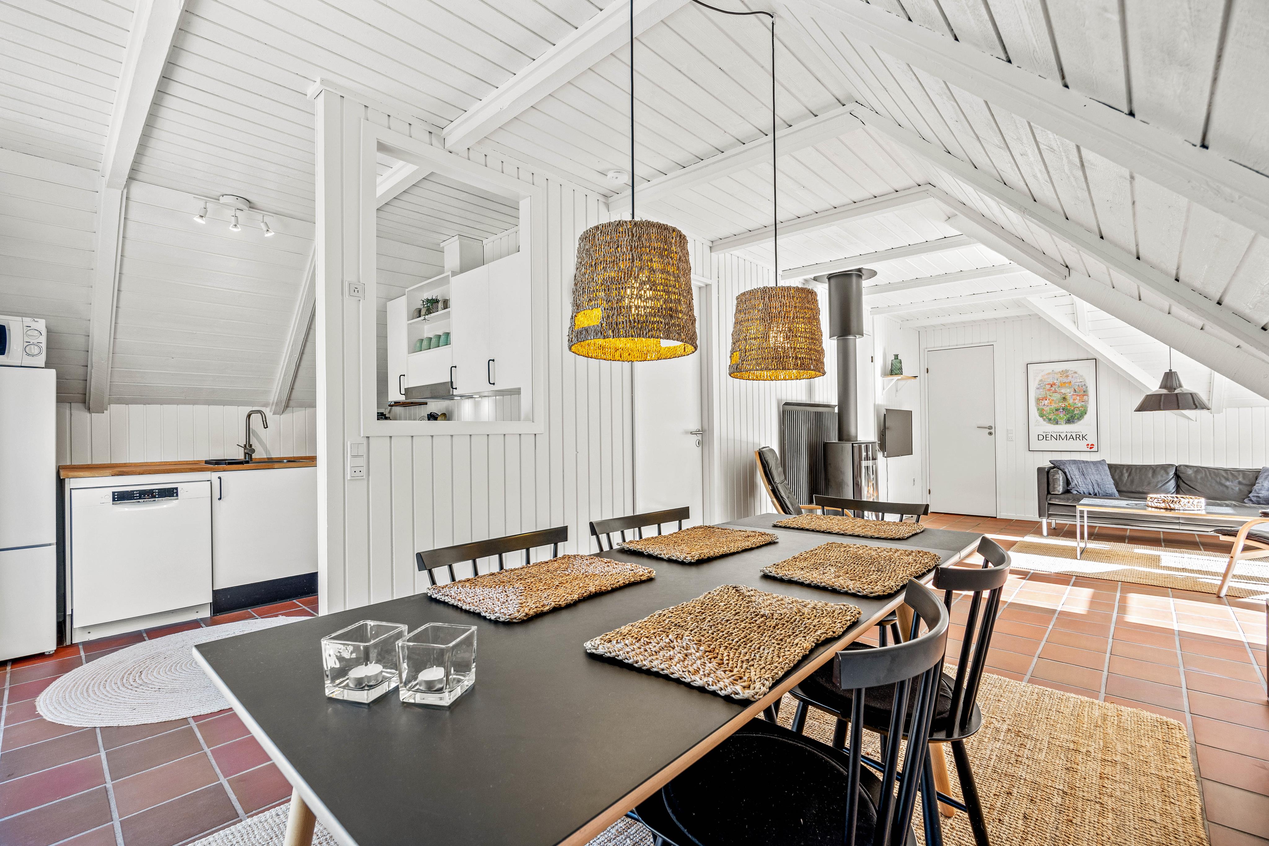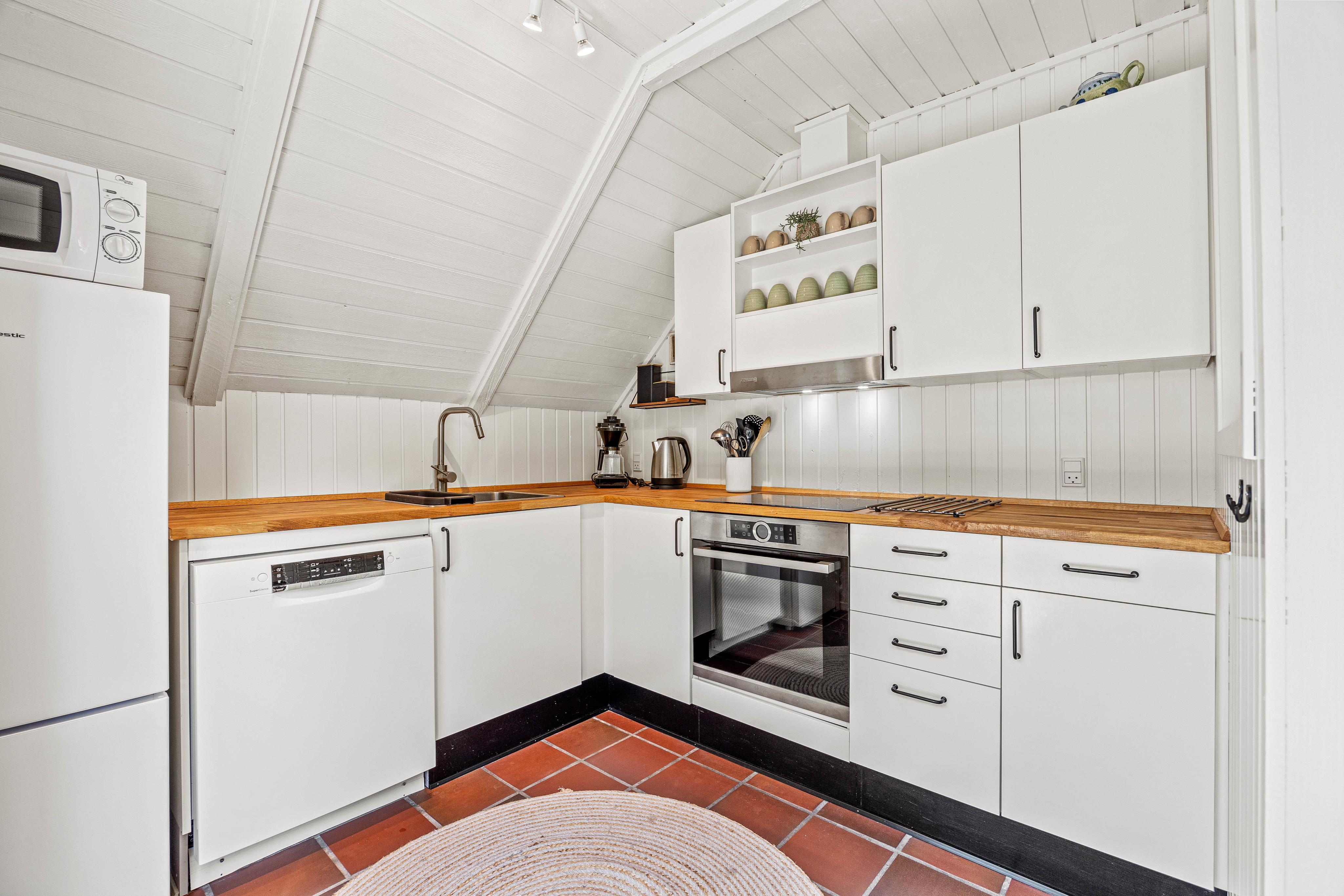 Det hyggelige, personligt indrettede sommerhus er udstyret med alt, hvad I behøver til at kunne holde en dejlig ferie. I køkkenet er der mikroovn, opvaskemaskine og induktionskogeplader, så I hurtigt kan lave god feriemad til hinanden, som I kan nyde ved spisebordet, mens naturen kommer helt ind til jer gennem de store gulv-til-loft-vinduer ved siden af - måske kigger et af de lokale, vilde dyr forbi?