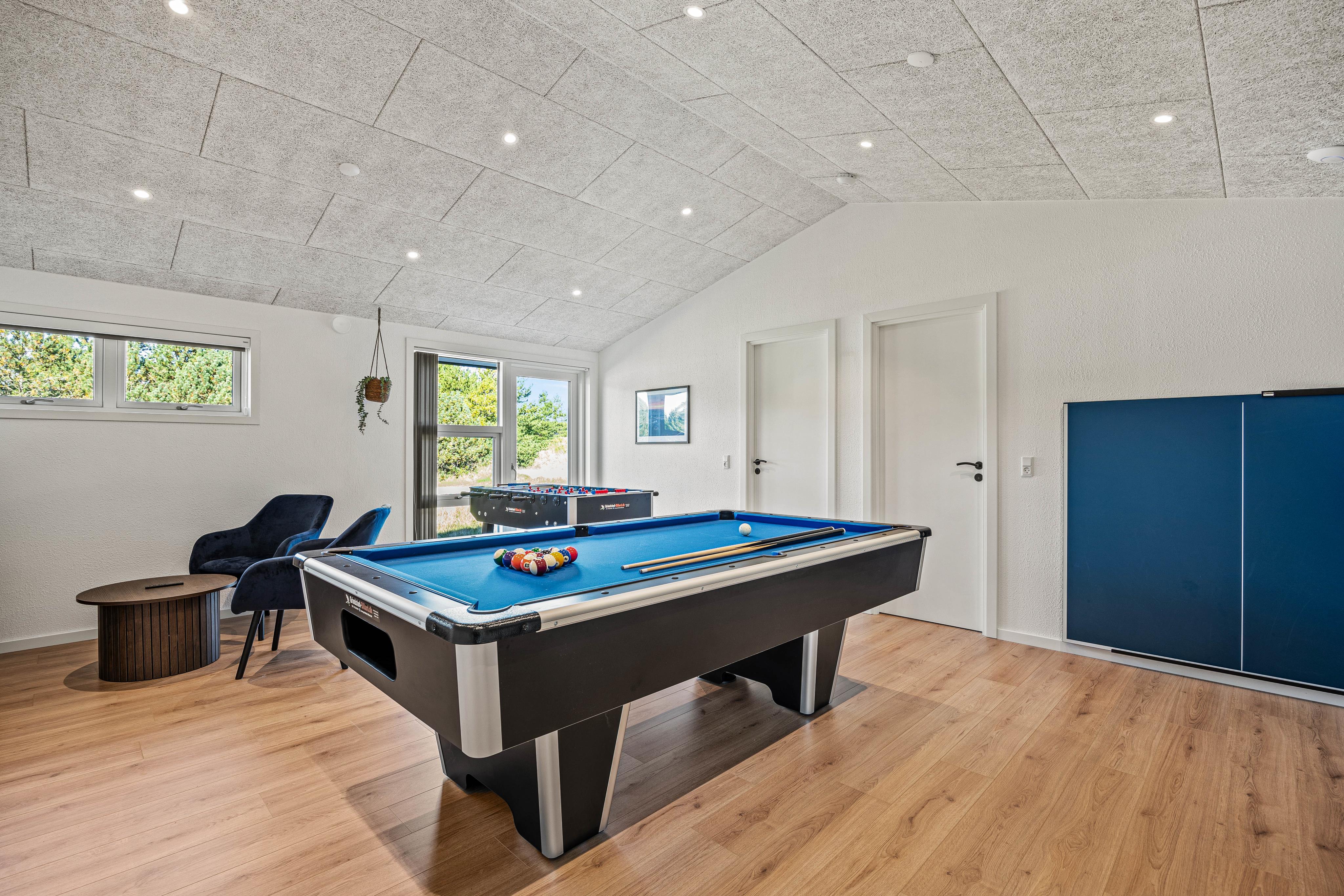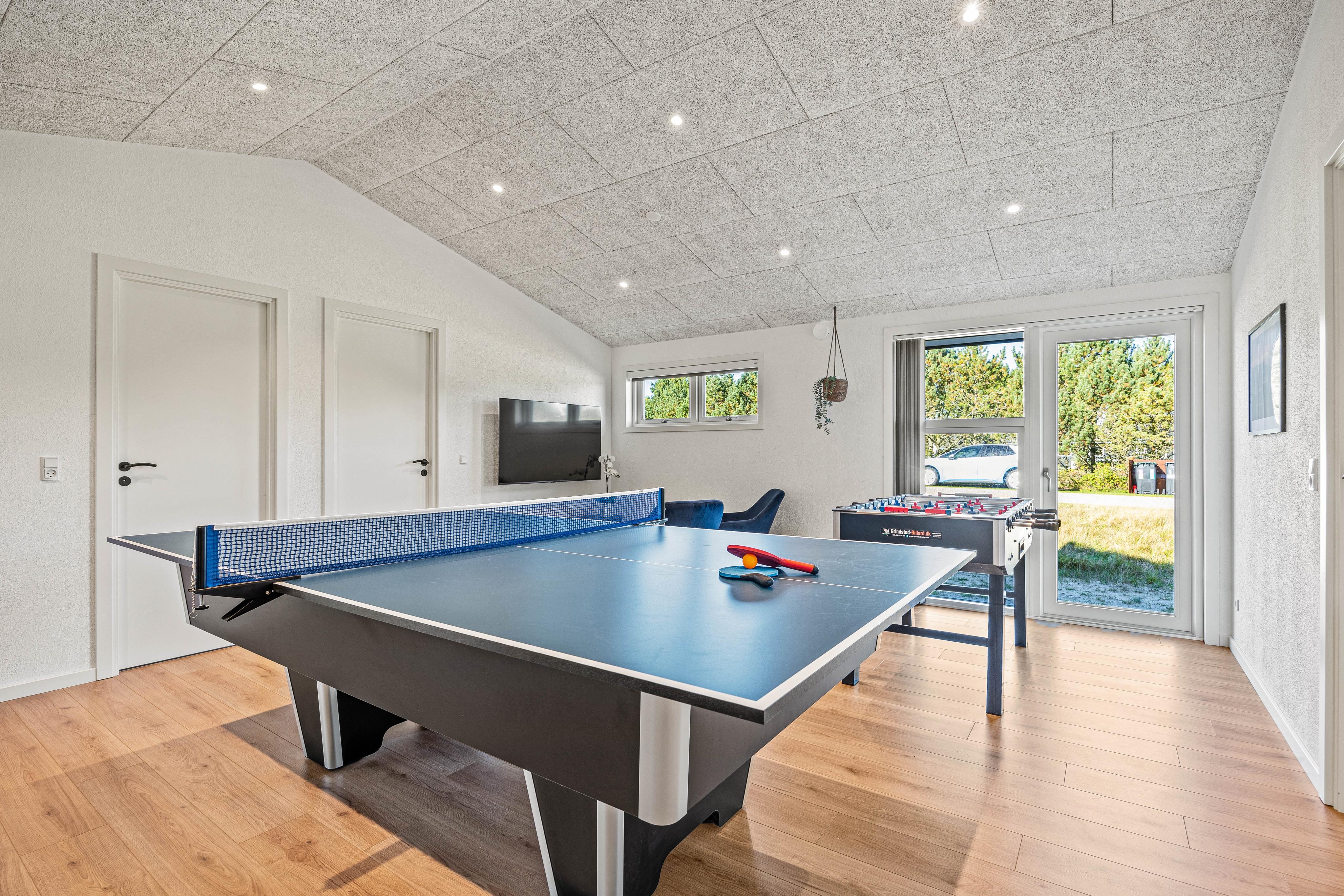 Feriebeboelsen i Blåvand giver plads til en bred vifte af aktiviteter, der tiltaler både store og små. Prøv dine evner af med en omgang poolbillard eller bordtennis og skab spændende og sjove stunder med dine nærmeste. Den store grund på 2093 kvadratmeter inkluderer også en gynge og en sandkasse, hvor børnene kan udfolde sig, mens du slapper af på den overdækkede terrasse og nyder den friske luft, måske over et glas vin eller en kop øl.