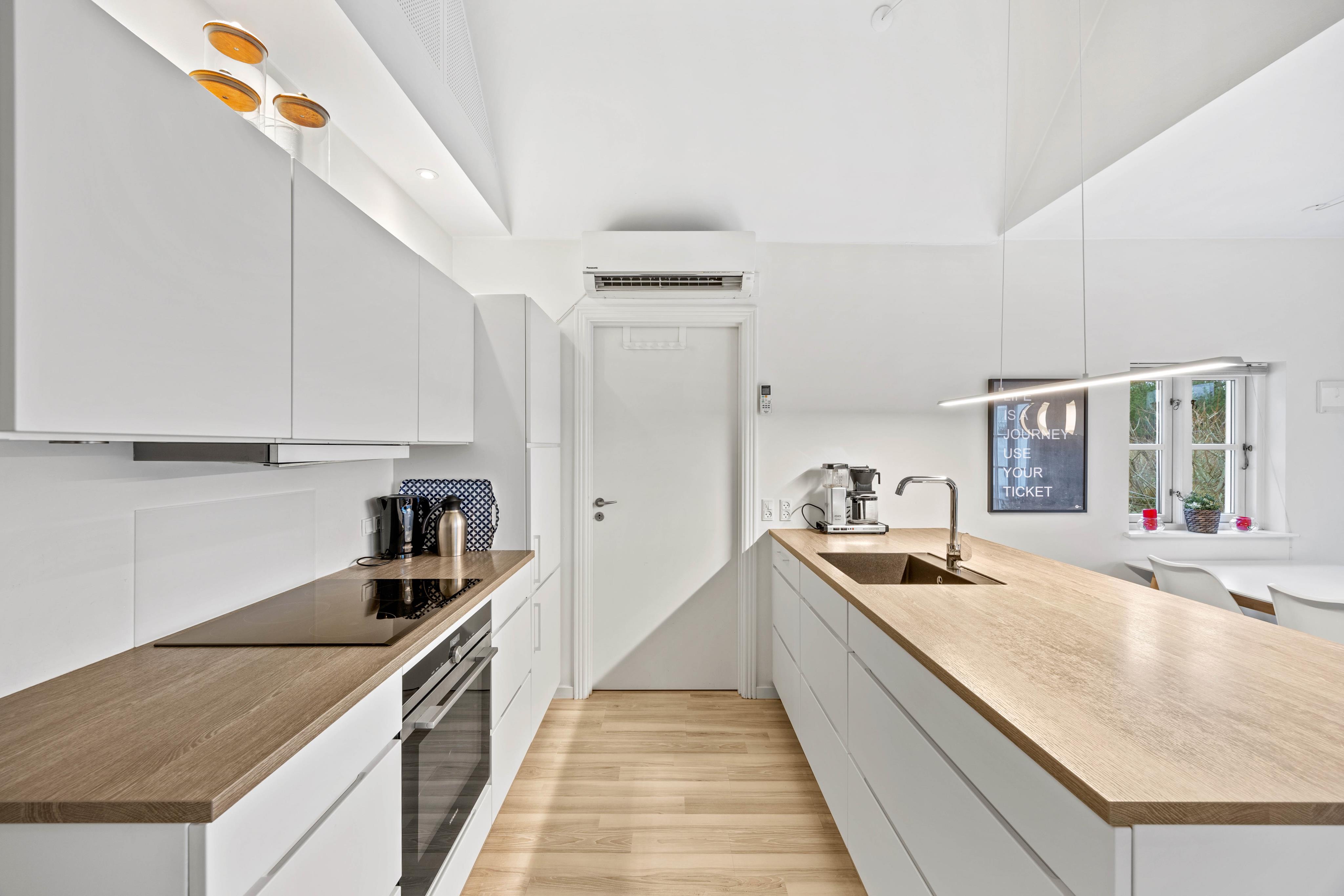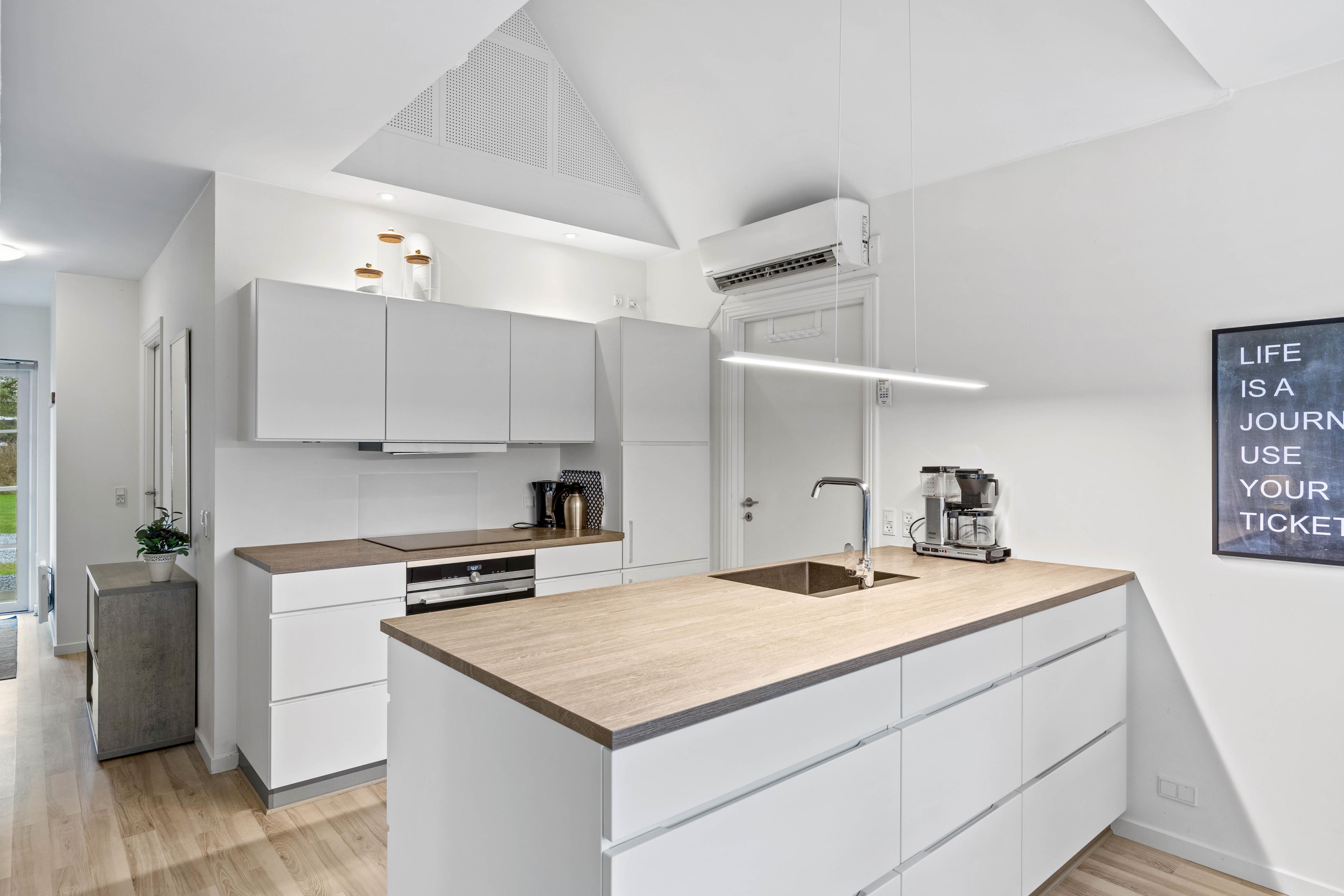 Efter indgang i huset åbner det sig op for jer i det lyse, delvist højloftede rum med køkken/alrum og stue. Køkkenet er udstyret med mikroovn og opvaskemaskine, så I kan få lavet dejlige feriemåltider og derefter slippe for at skulle tænke på at tage opvasken. Skulle I få brug for yderligere fryserkapacitet, råder huset desuden over en separat fryser på 90 liter.