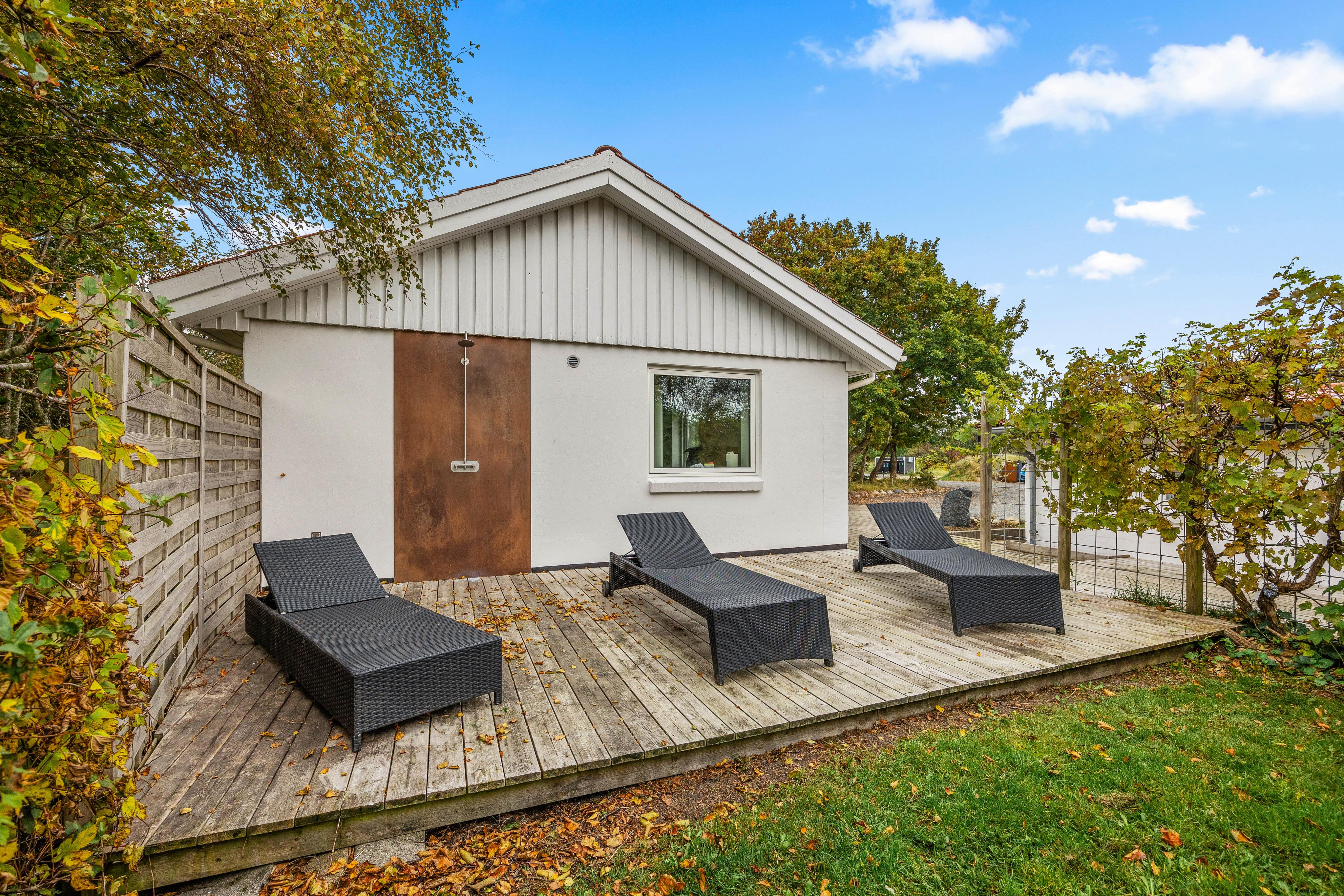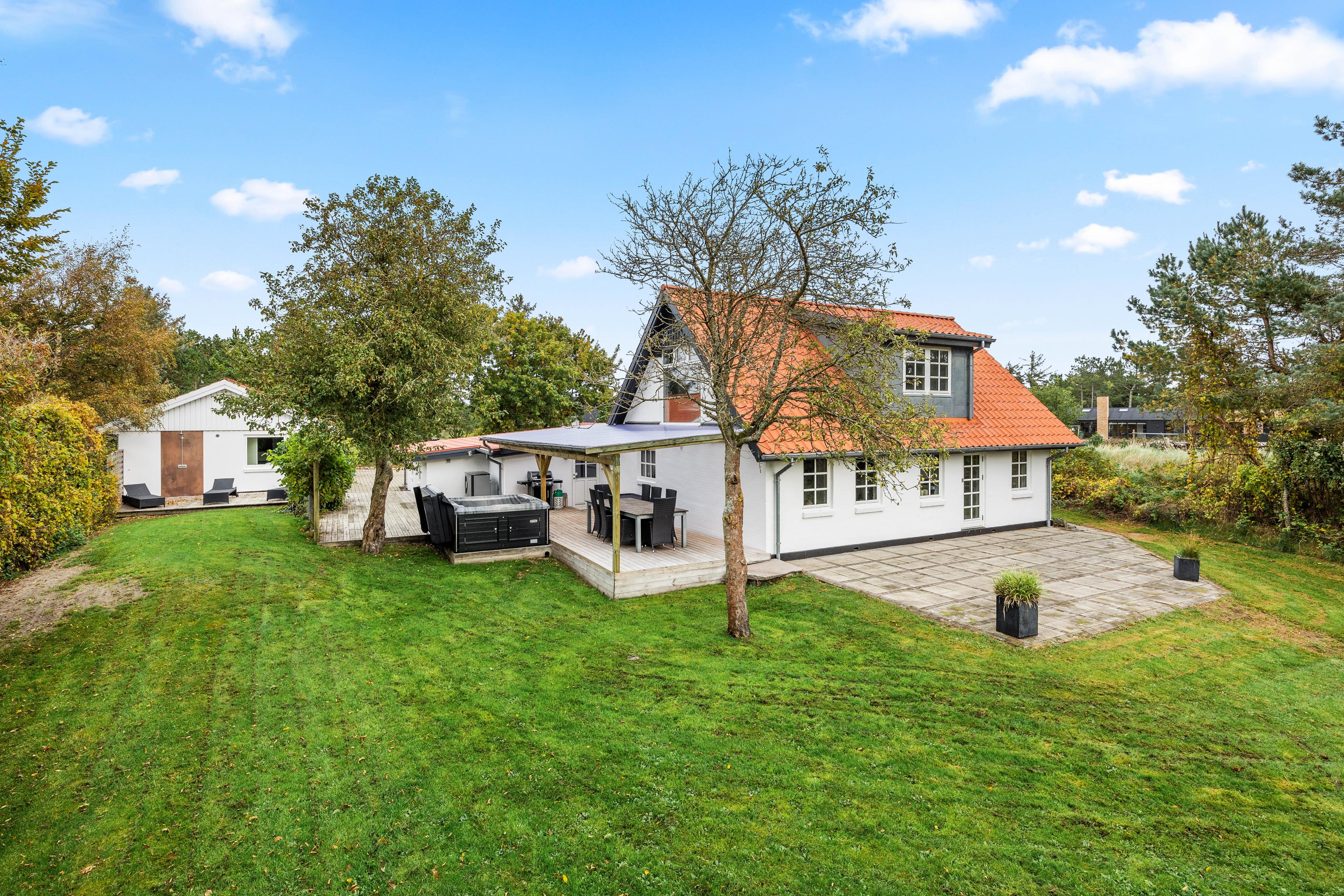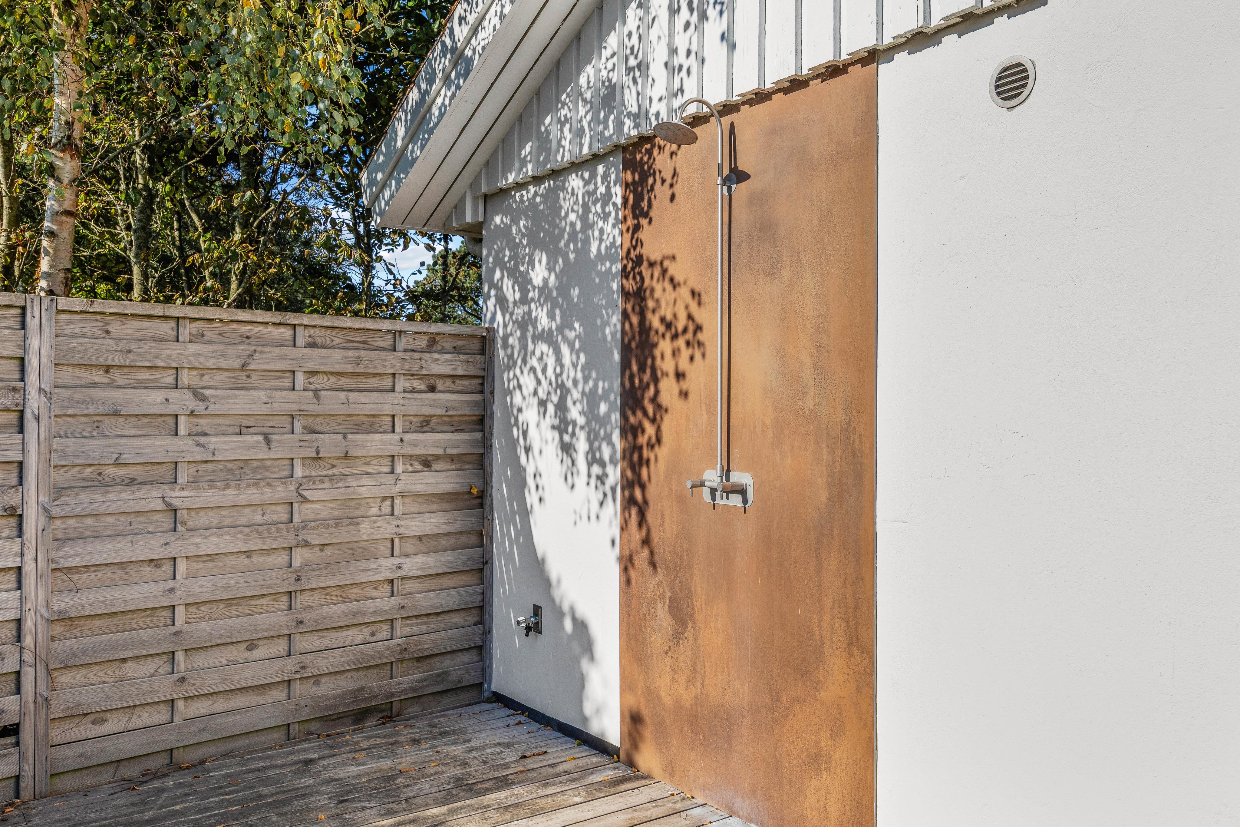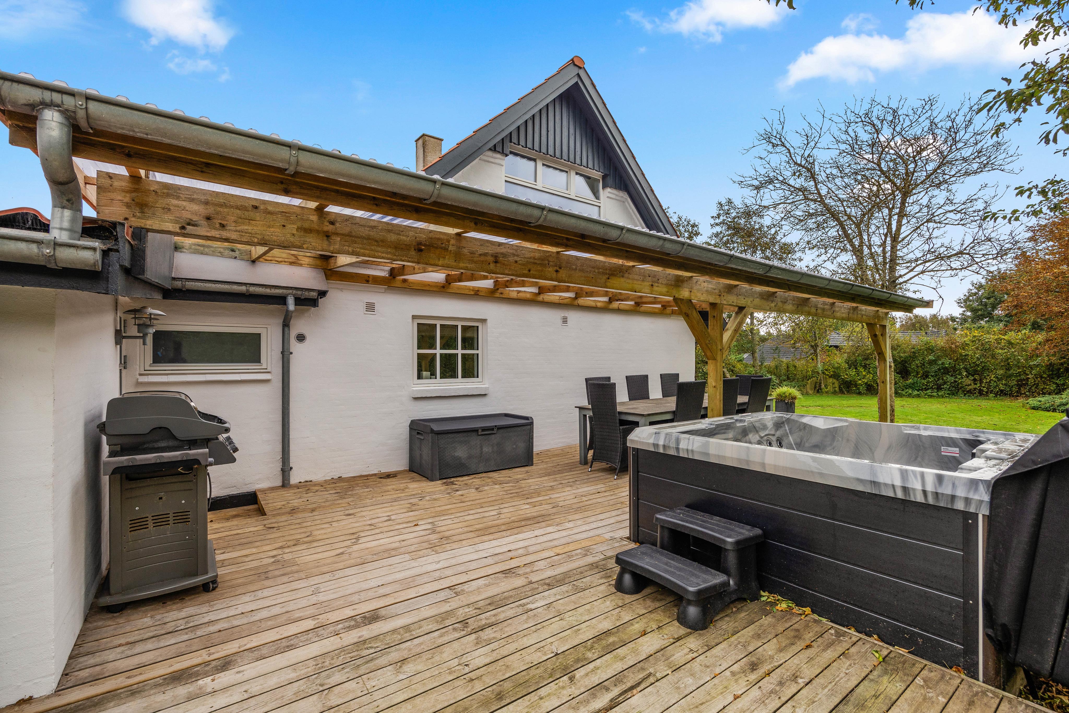 Under den overdækkede del af terrassen kan du sidde i havemøblerne og fordybe dig i den gode bog, du så længe har villet læse, også selvom der skulle komme en byge, og når du får lyst til lidt wellness, kan du hoppe i den udendørs jacuzzi eller få en forfriskende skylle under udendørsbruseren.