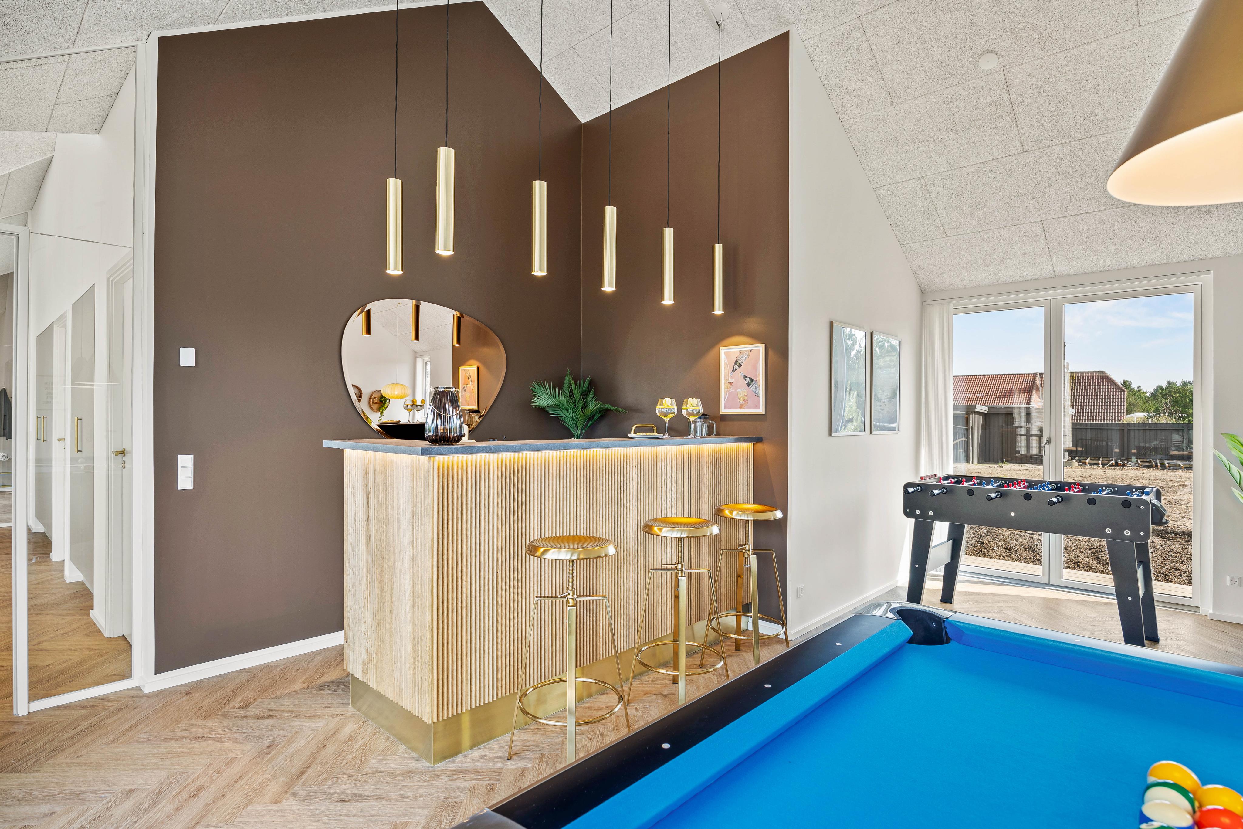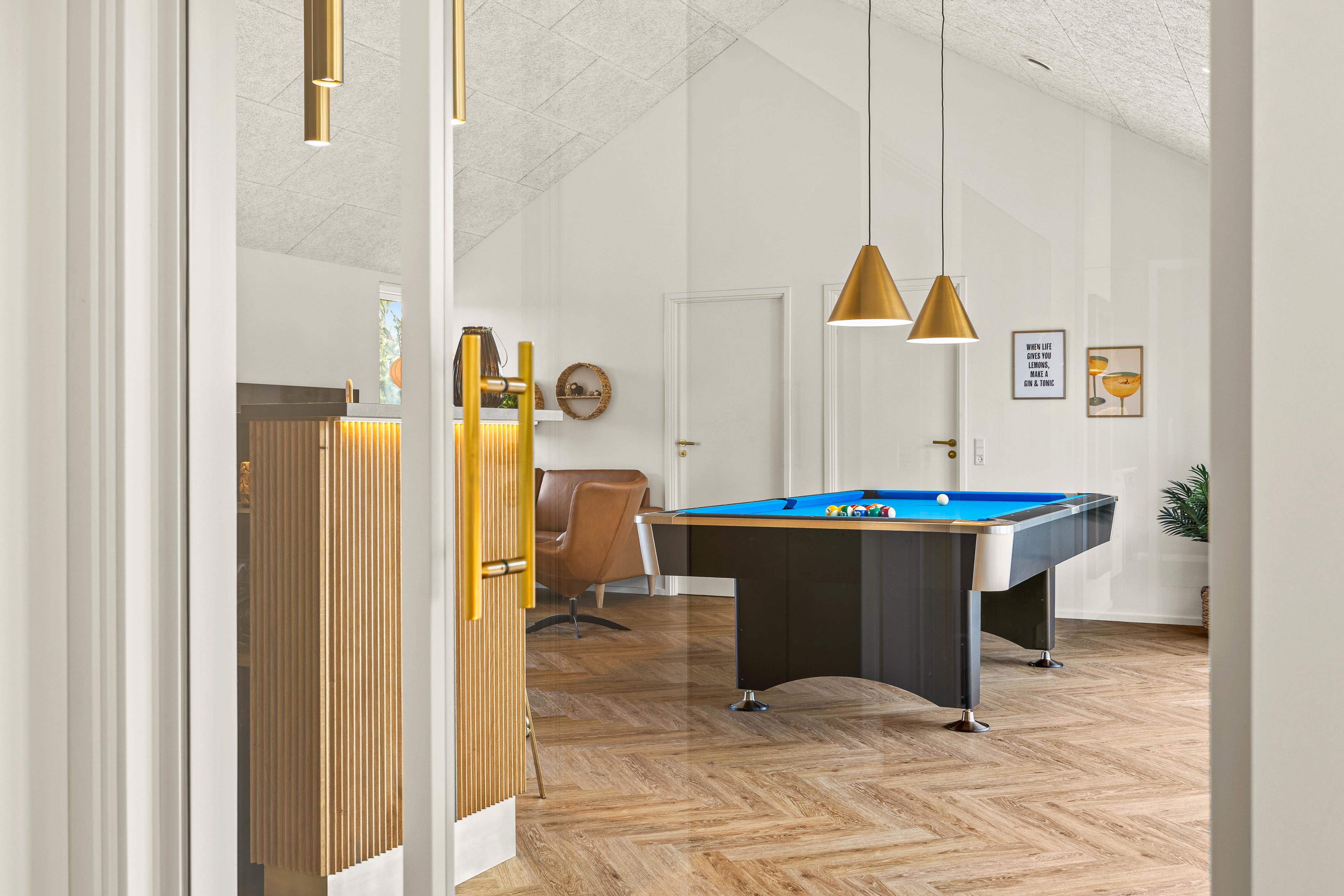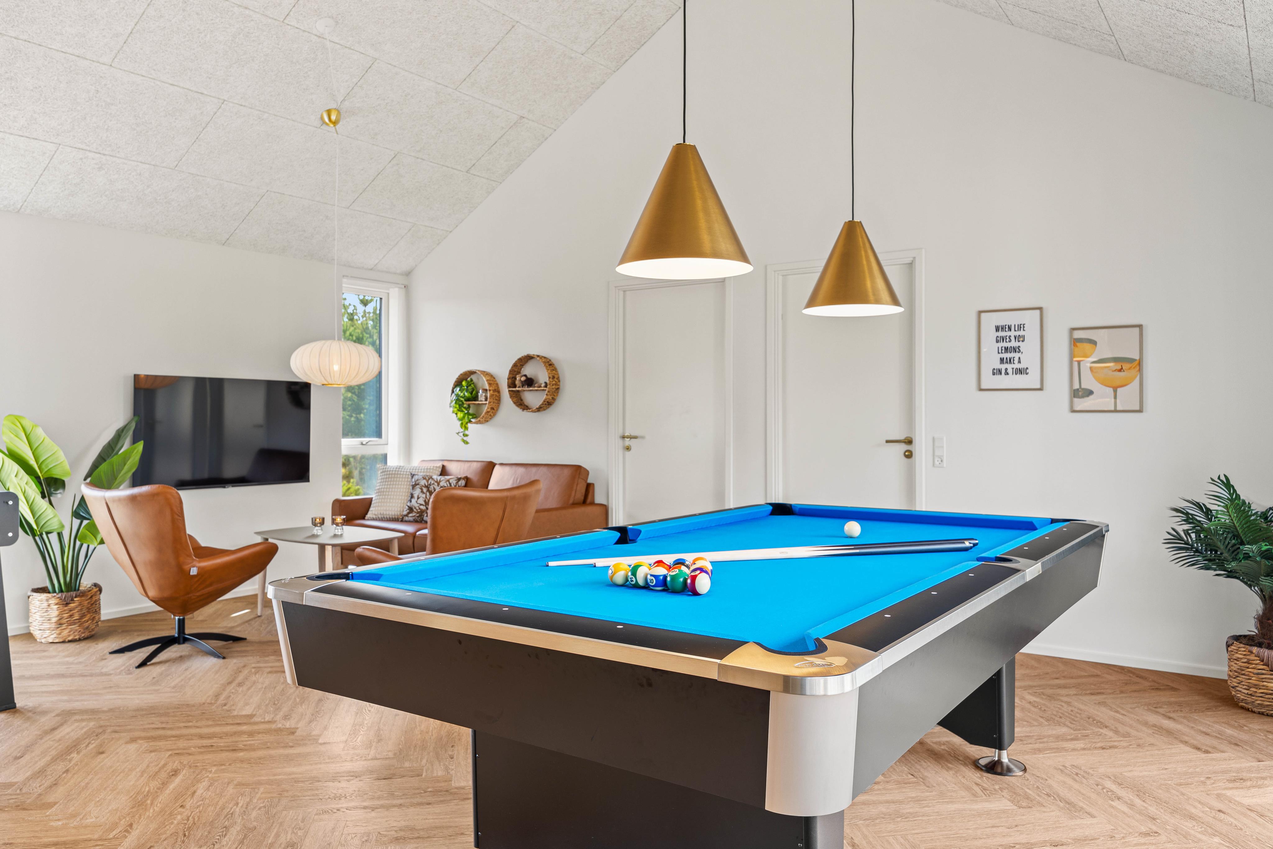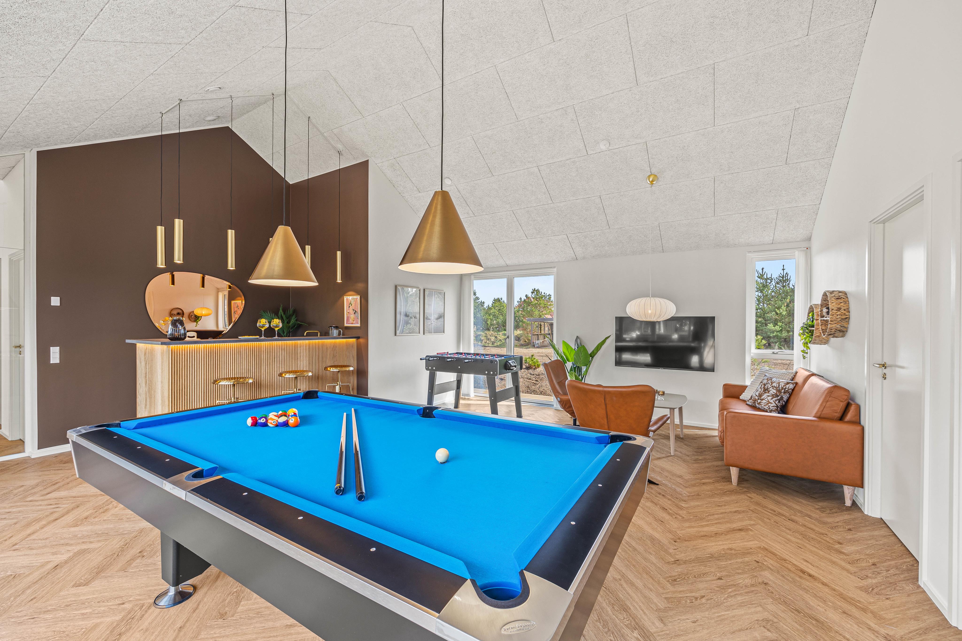 Det veludstyrede køkken med 2 opvaskemaskiner, 2 køleskabe og en separat fryser på 350 liter ligger i åben forbindelse med alrum og stue, så feriekokken kan følge med i aktiviteterne, og når maden er færdig, kan I samles omkring langbordet og hygge jer og udveksle ferieoplevelser, hvorefter sofahjørnet kalder til afslapning. Måske skal I, før dagen slutter, lige have en aften-svømmetur i den flotte udendørs swimmingpool og så have en drink i udebaren - eller hvad med en lille slag pool i aktivitetsrummet? Swimmingpoolen er opvarmet og kan benyttes hele året rundt, så det er bare at hoppe i.