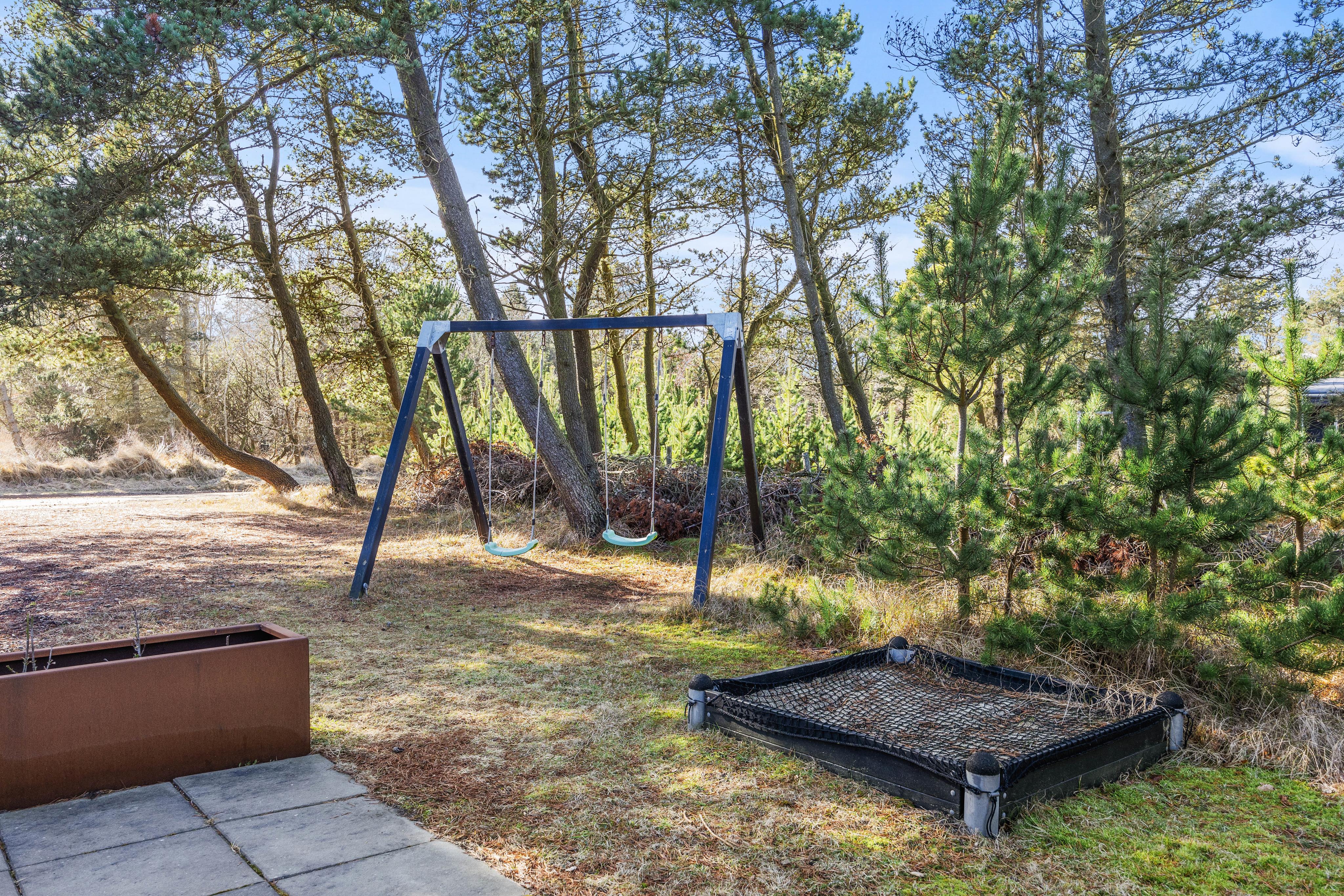 Sommerhuset ligger på en 1500 m² stor naturgrund med gode udendørs faciliteter såsom en gynge, en sandkasse og hyggelige havemøbler, og terrassen indbyder med sin dels åbne, dels overdækkede del til hyggelige aftener, måske over god feriemad fra gasgrillen. Her kan både børn og voksne i dén grad hygge og udfolde sig.