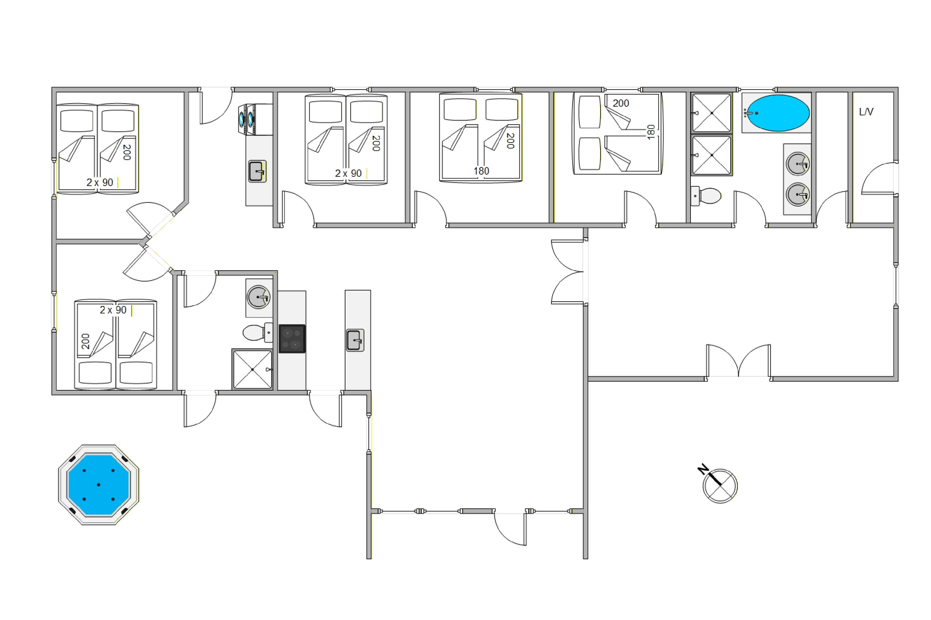 Flot feriehus med en god indretning. Her kan man føle sig godt tilpas. Kun husets grundplan på billede 6 i billedgalleriet passer ikke overens. Det store bad er i aktivitetsrummet med et soveværelse. Så vi måtte på stedet ændre den allerede planlagte værelsesfordeling blandt de 3 familier. Det var fantastisk at have fri adgang med Ho Feriepark-kortet til den nærliggende svømmehal. Det benyttede vi meget med 3 børn. Ligeledes billard og bordtennis. Den udendørs whirlpool kunne vi ikke benytte i dårligt vejr.