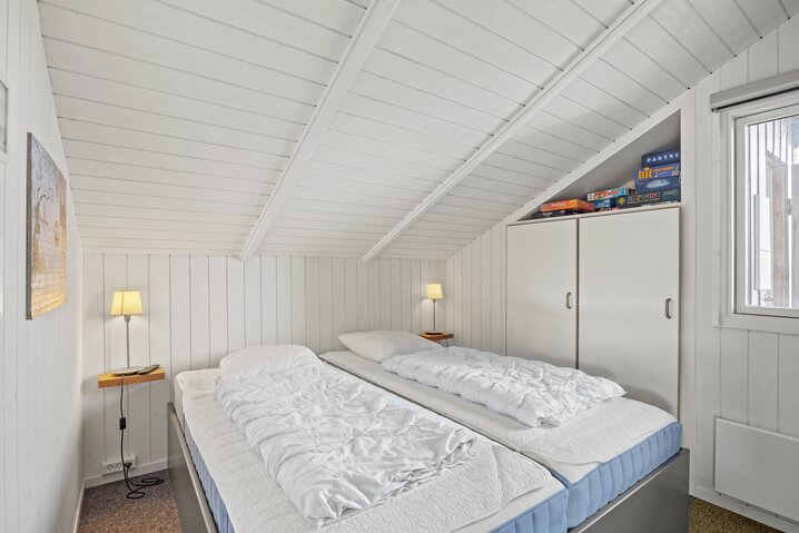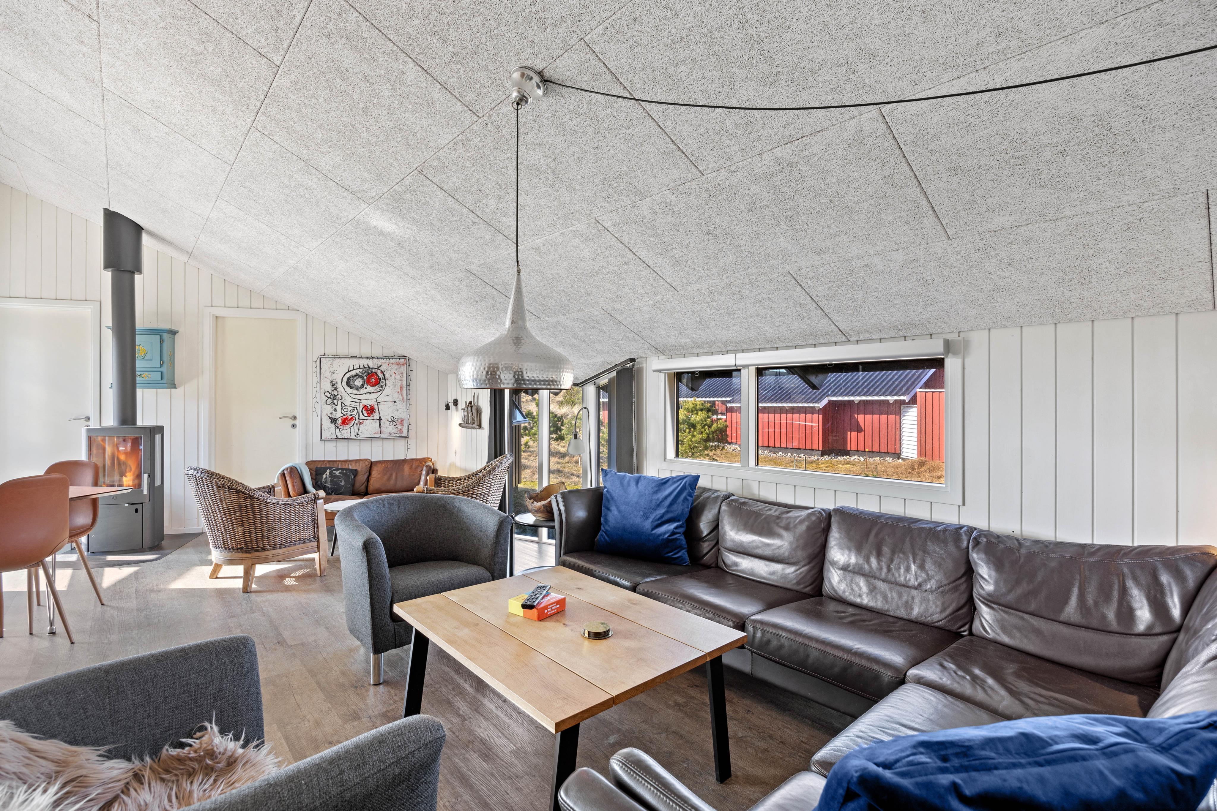 Sommerhuset på Norges Fjelde 34 har med sine 107 m2 plads til 10 glade gæster. Sengepladserne er fordelt på 5 rummelige værelser, hvoraf 3 er indrettet med dobbeltseng og de andre med 2 enkeltsenge. Feriehuset hjerterum er det rummelige stue- opholdsrum, hvorfra der er åbnet op ind til køkkenet. Med højt til loftet, et flot lysindfald og rolige farver er her den rette atmosfære – tilbered dejlig mad i det funktionelle køkken, slap af med en god bog, spil brætspil eller noget helt andet. Imens sørger den knitrende brændeovn for den hyggelige stemning.