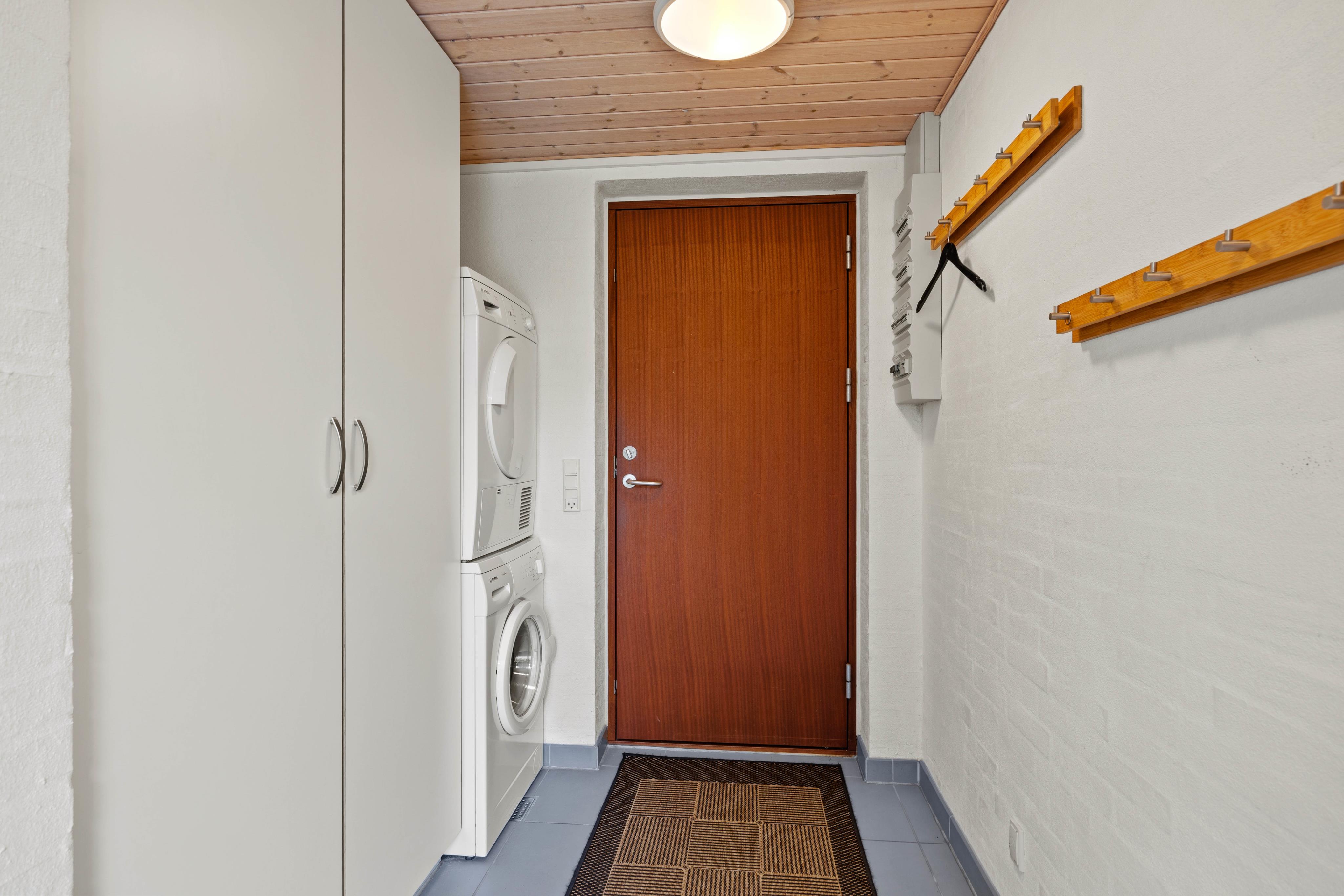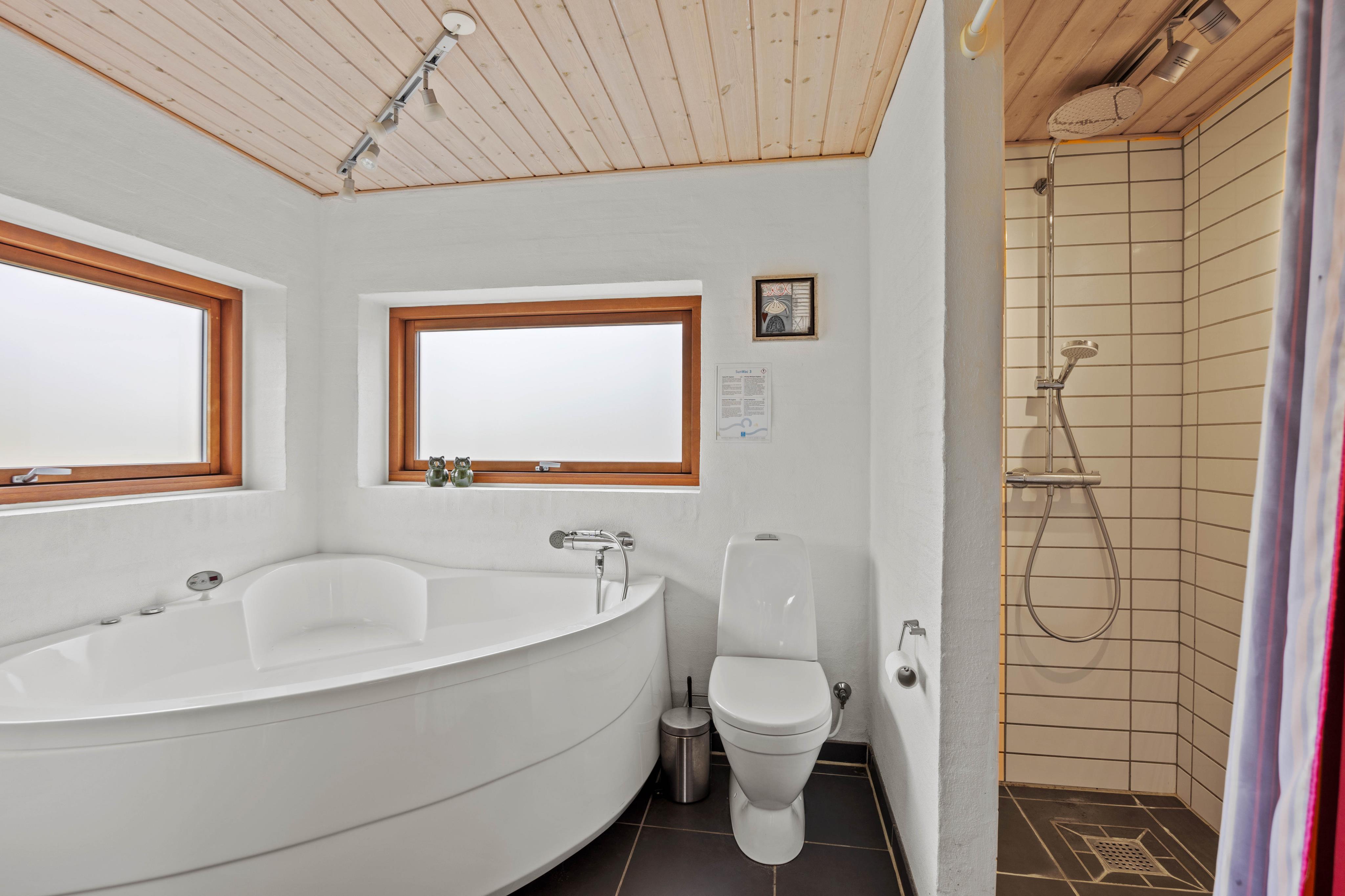 Flere af sommerhusets rum har klinkegulve med behagelig gulvvarme – en komfortabel detalje, især på badeværelserne, hvor det er ekstra rart med lune fødder. Det hele bindes sammen af et lyst og venligt interiør, der gør det let at falde til og føle sig hjemme – uanset årstid.