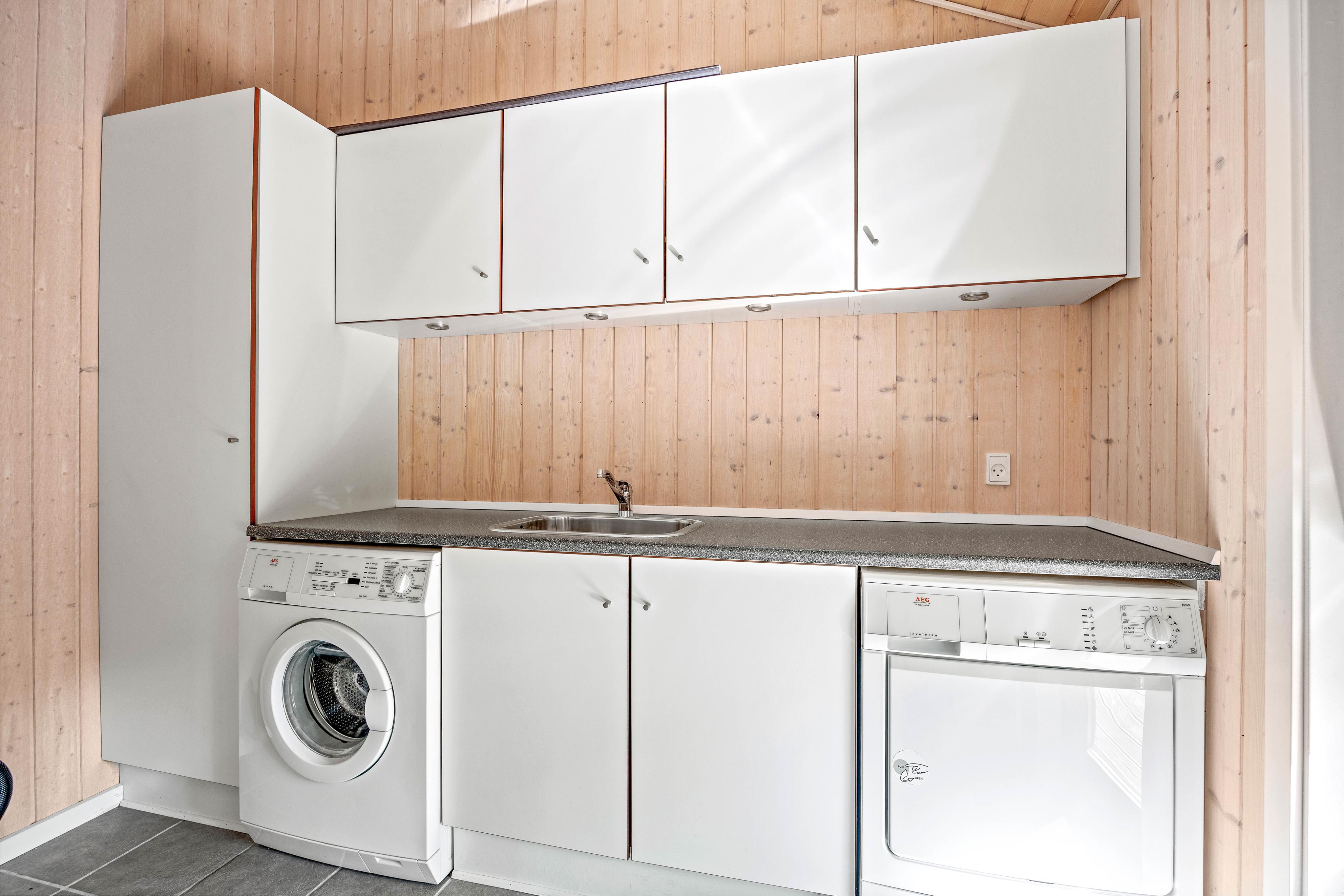 Feriehuset er ligeledes udstyret med både vaskemaskine og tørretumbler.
