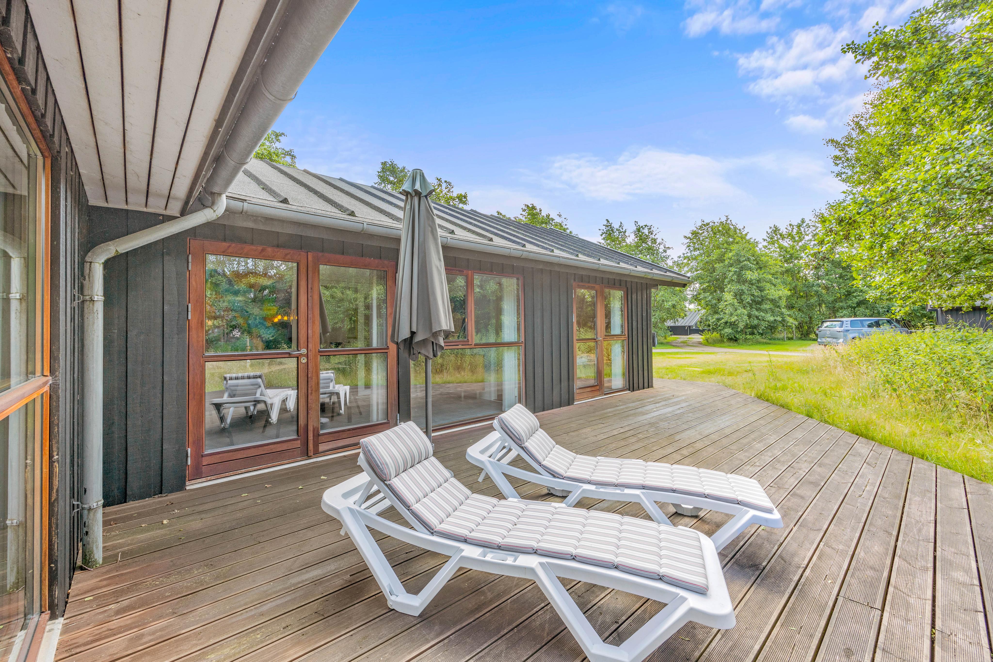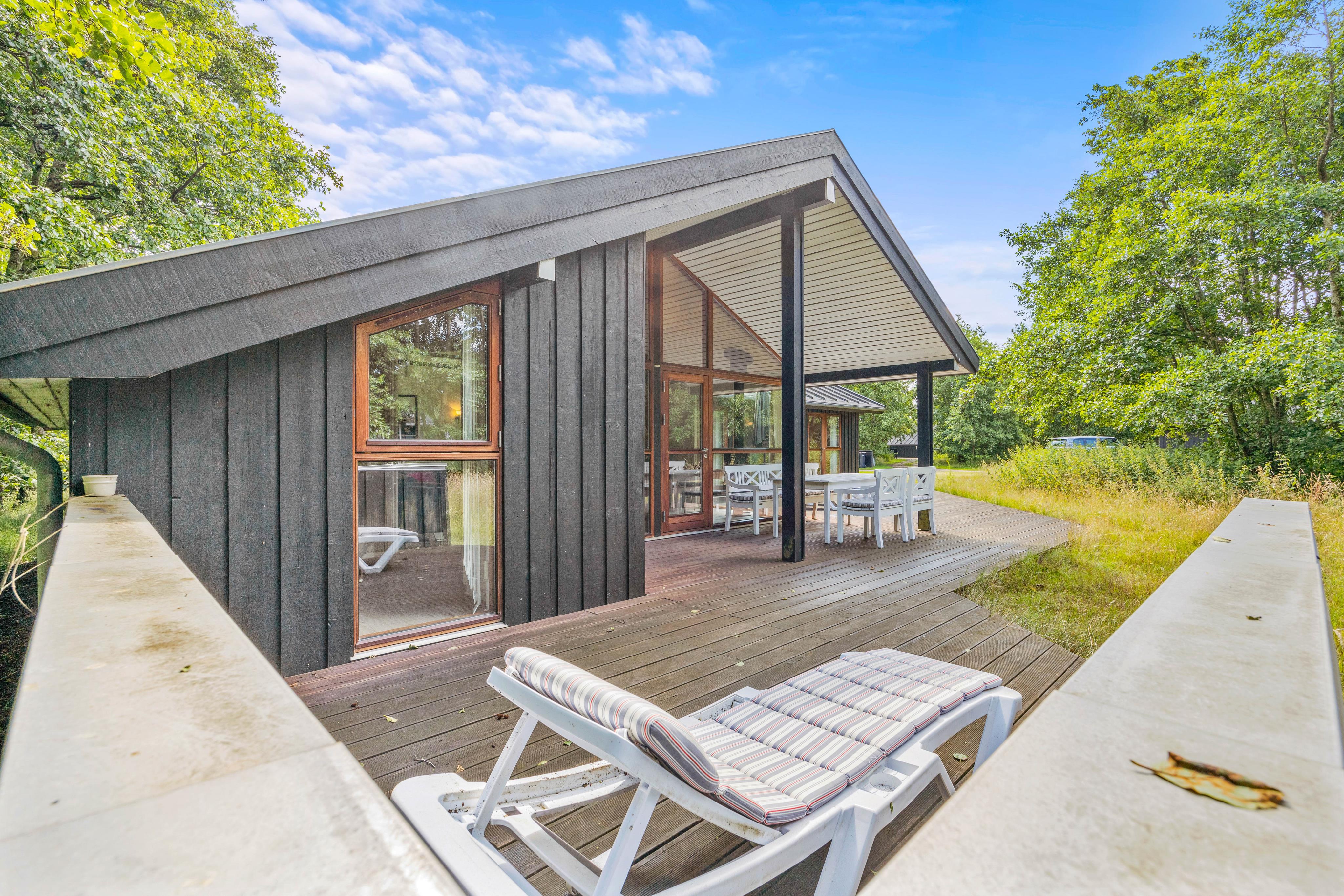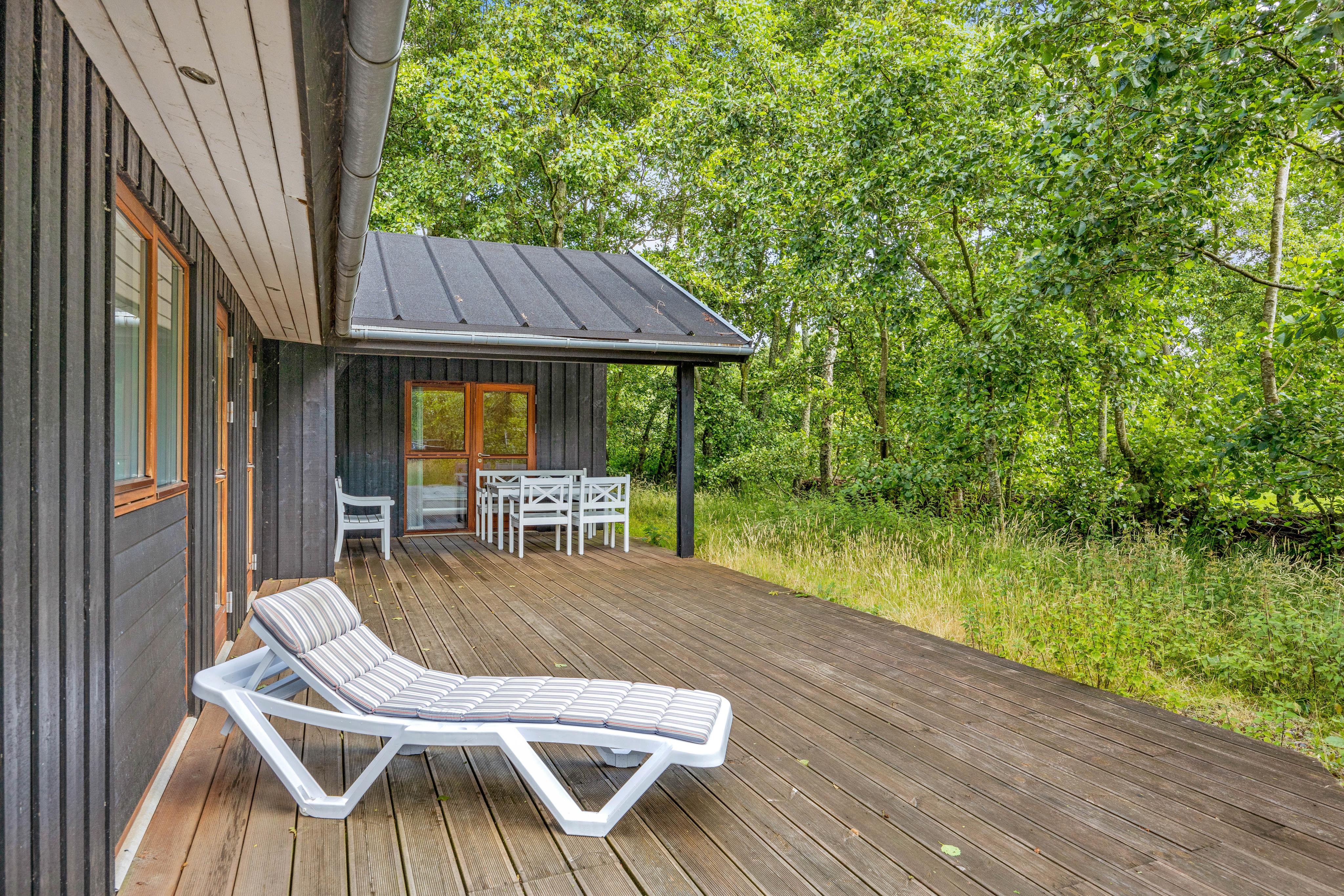 Feriehuset er beliggende på en stor plænegrund med træer og buske der omkranser feriehuset på 3 sider. Her venter jer en dejlig terrasse, der er afskærmet og overdækket, så I kan sidde i ly og læ. I har havemøbler og liggestole til rådighed, hvor I kan sætte jer til rette, og nyde stilheden. Når aftenen går på hæld, kan I samles på terrassen til en lækker middag, som I tilbereder på grillen.