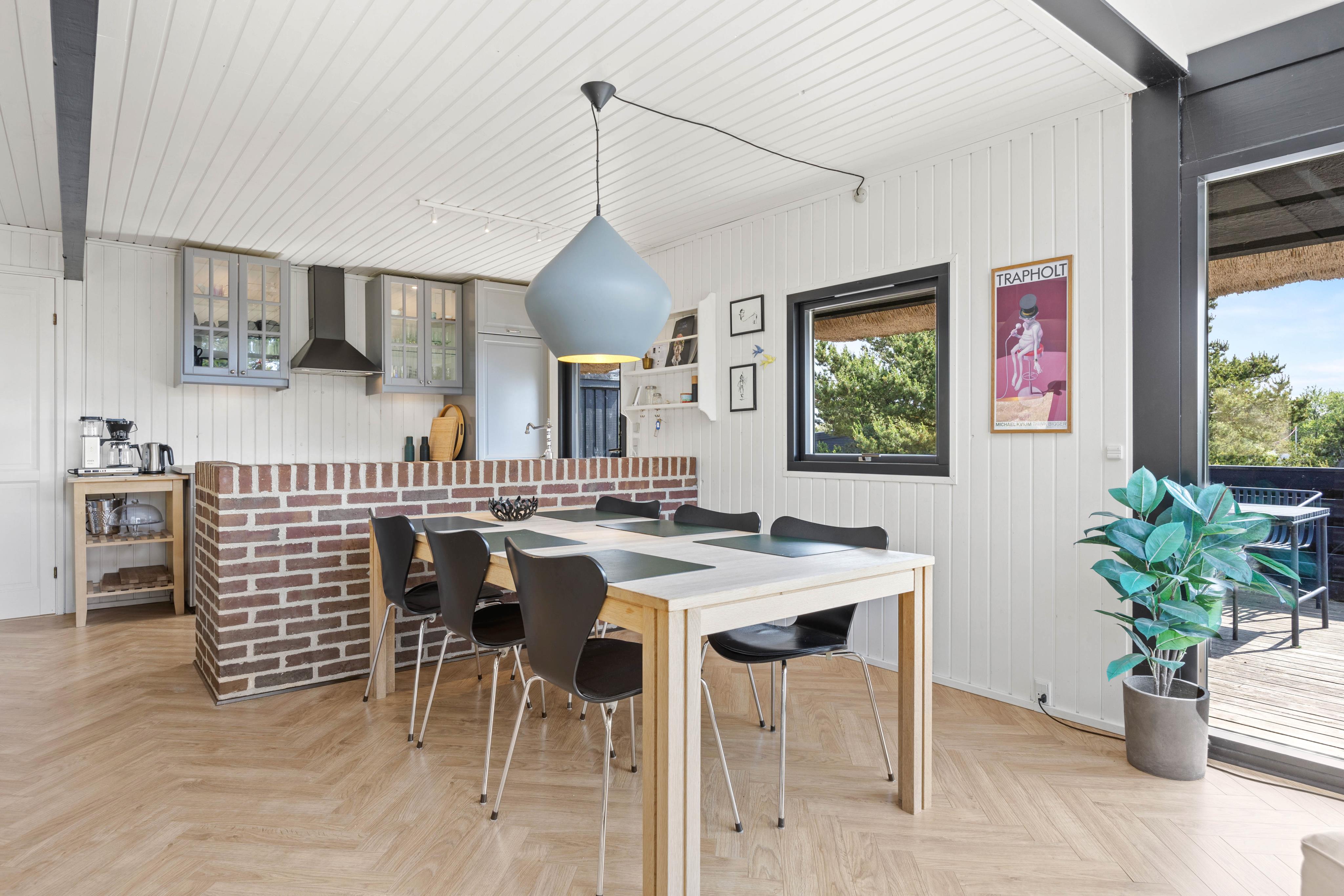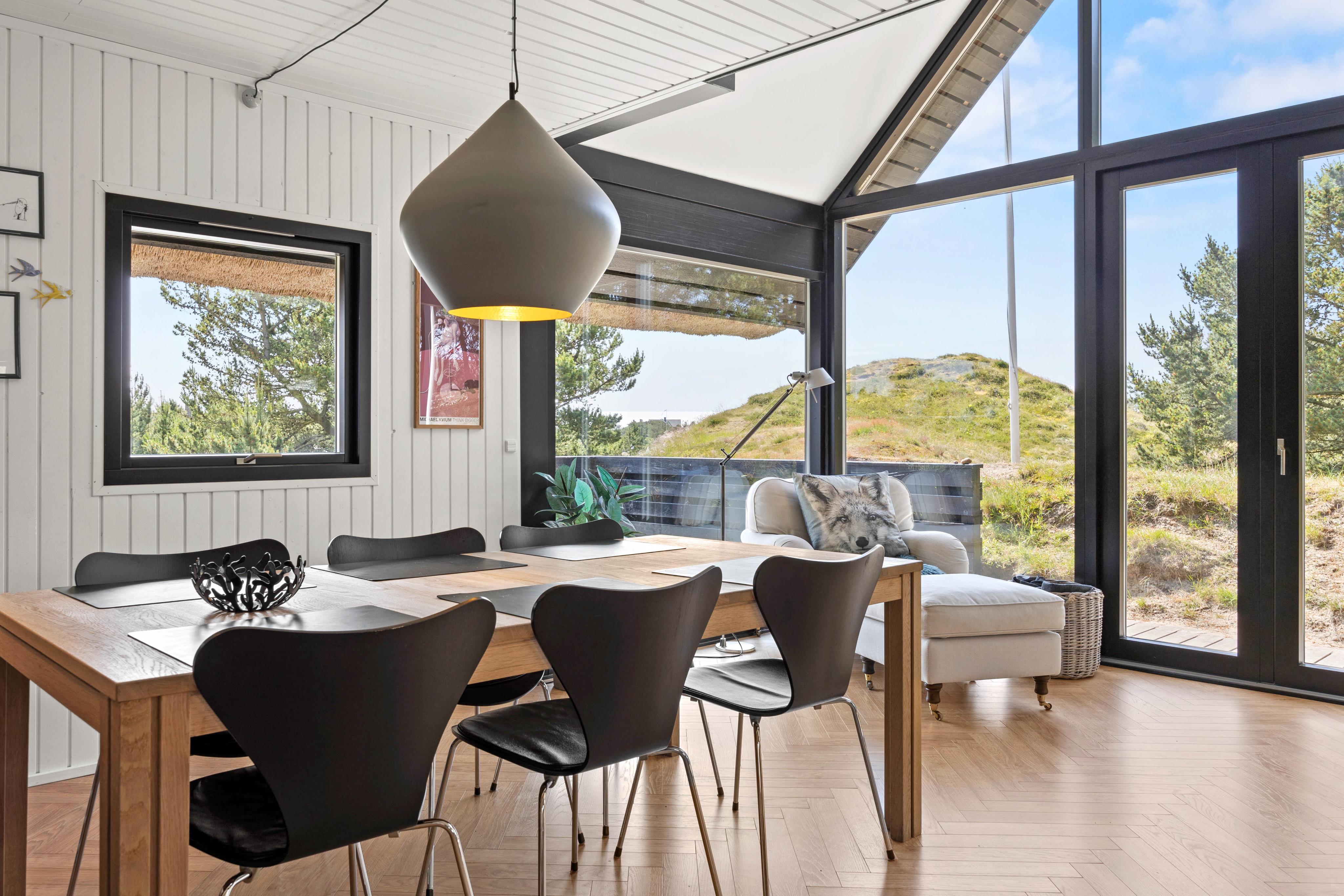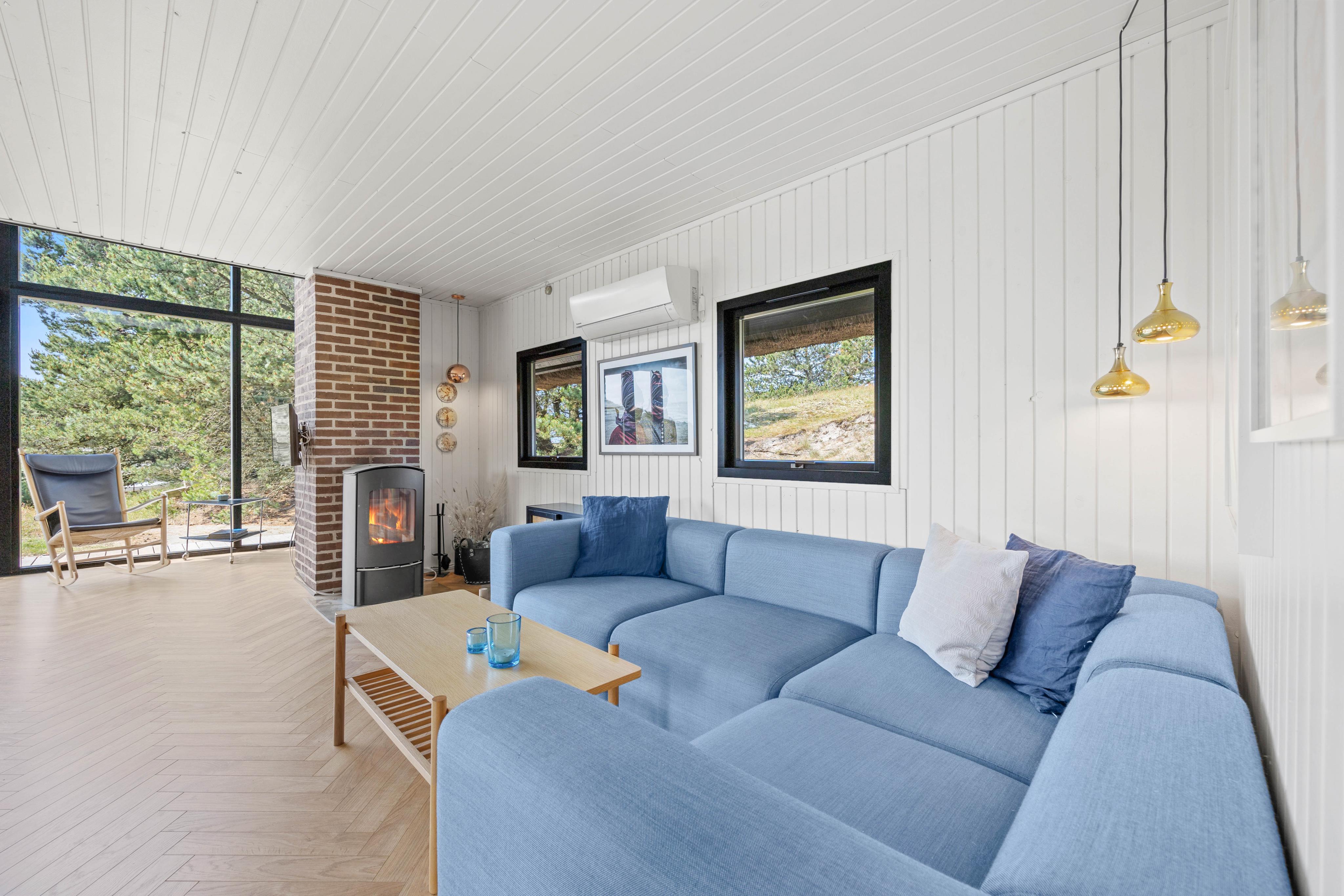 Sommerhuset er moderne indrettet, og sammen med det store vinduesparti i alrummet, skaber det en lys og indbydende atmosfære i feriehuset. Vinduespartiet går op i kip, og her har I en skøn udsigt til den omkringliggende natur. I alrummet kan hele familien samles til mange gode stunder, og den åbne planløsning sørger for, at I får mest mulig tid med hinanden – Selv når der skal laves mad.